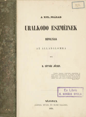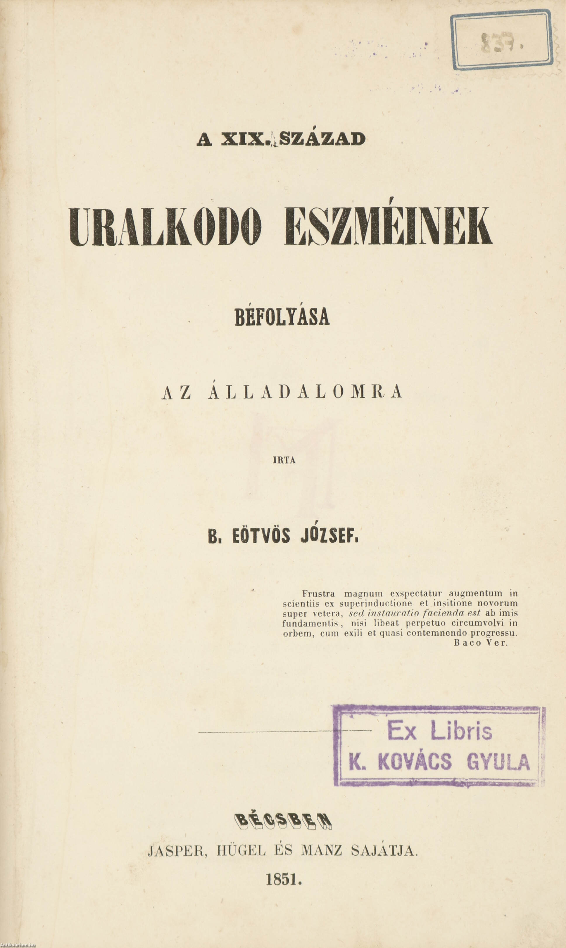Első kiadás. A XIX. század uralkodó eszméinek béfolyása az álladalomra I. Írta: B. Eötvös József.
