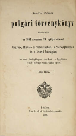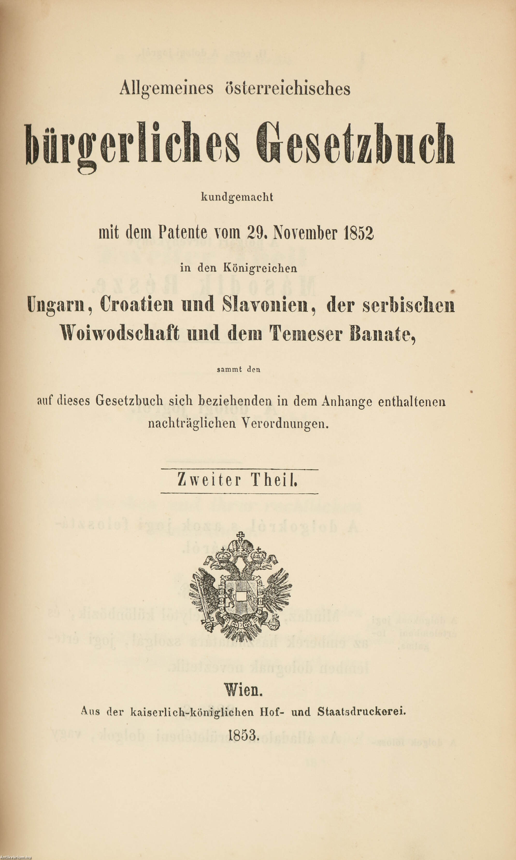 Első kiadás. Ausztriai általános polgári törvénykönyv kihirdettetett az 1852 november 29. nyiltparancscsal Magyar-, Horvát- és Tótországban, a Szerbvajdaságban és a temesi bánságban, az ezen törvénykönyvre vonatkozó, a függelékben foglalt utólagos rendeletekkel együtt I.-II. / Allgemeines österreichisches bürgeliches Gesetzbuch kundgemacht mit dem Patente vom 29. November 1852 in den Königreichen Ungarn, Croatien und Slavonien, der serbischen Woiwodschaft und dem Temeser Banate, sammt den auf dieses Geasetzbuch sich beziehenden in dem Anhange enthaltenen nachträglichen Verordnungen I-II. (két rész egy kötetben).