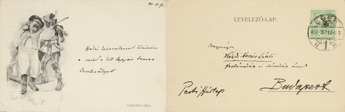 Kézzel írt, keltezéssel (912. IX. 17.), postai bélyeggel és bélyegzéssel ellátott, jó állapotú levelezőlap. A címlapon Mühlbeck Károly illusztrációja látható, amit Göre Gábor figurájáról készített.