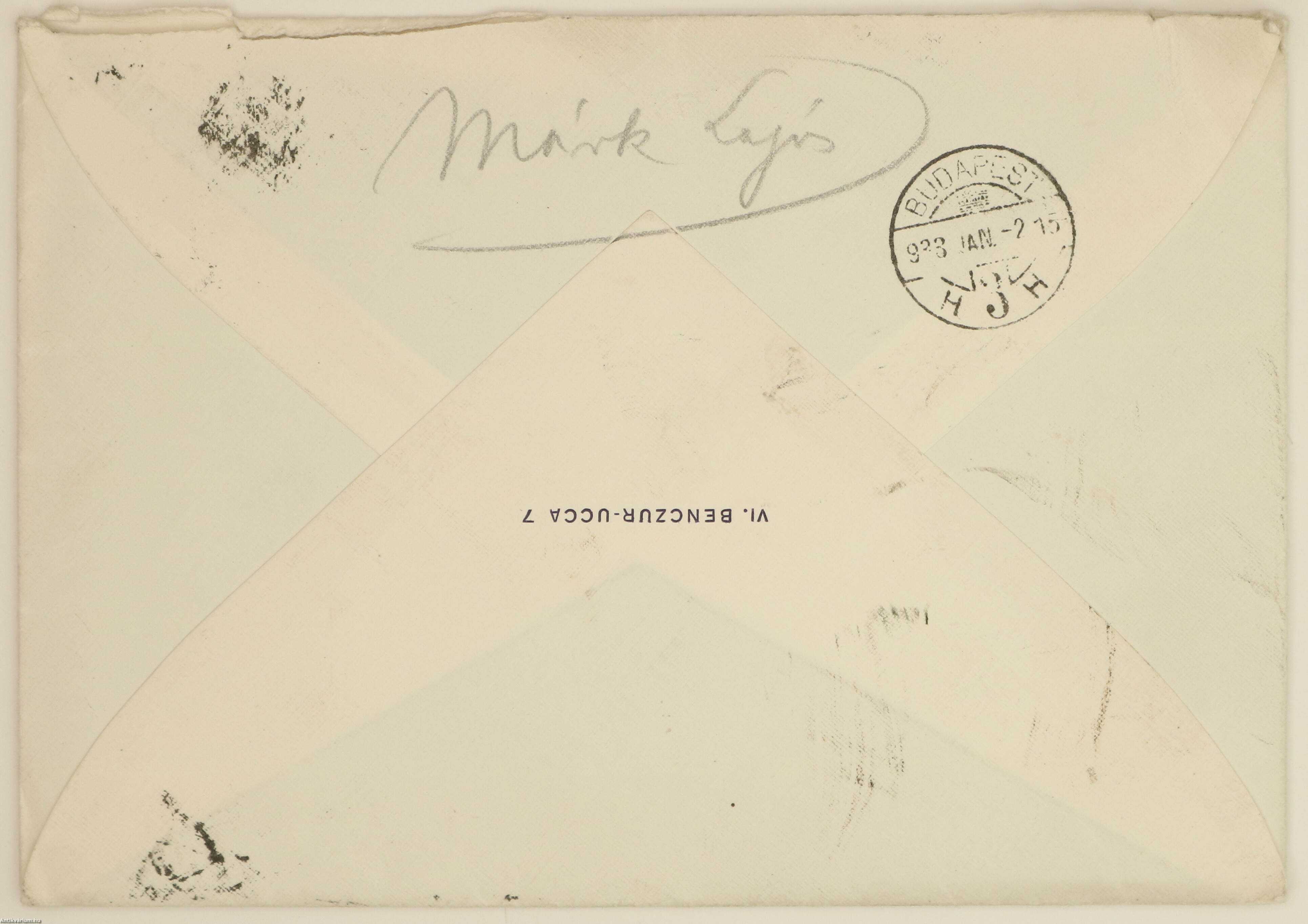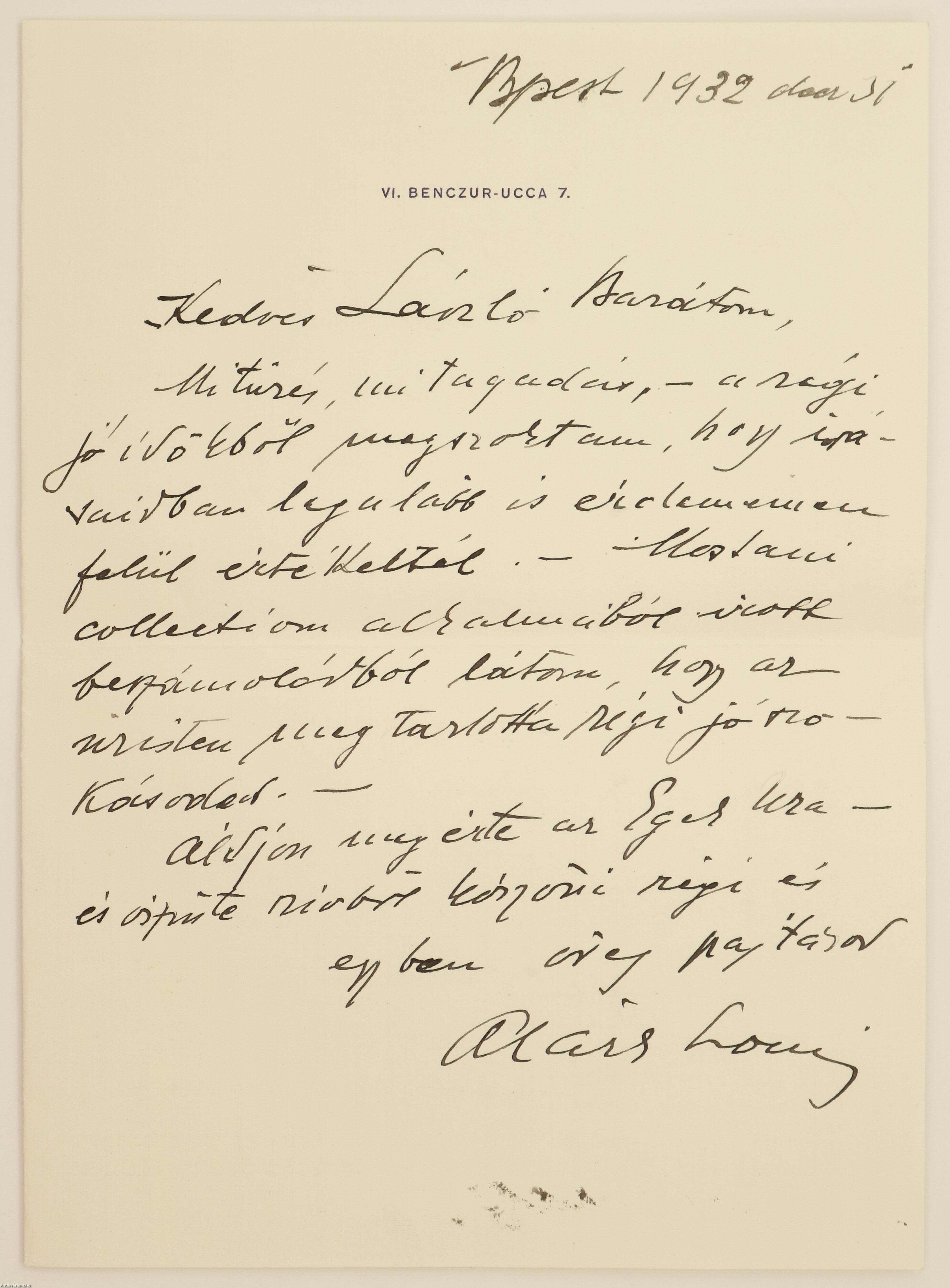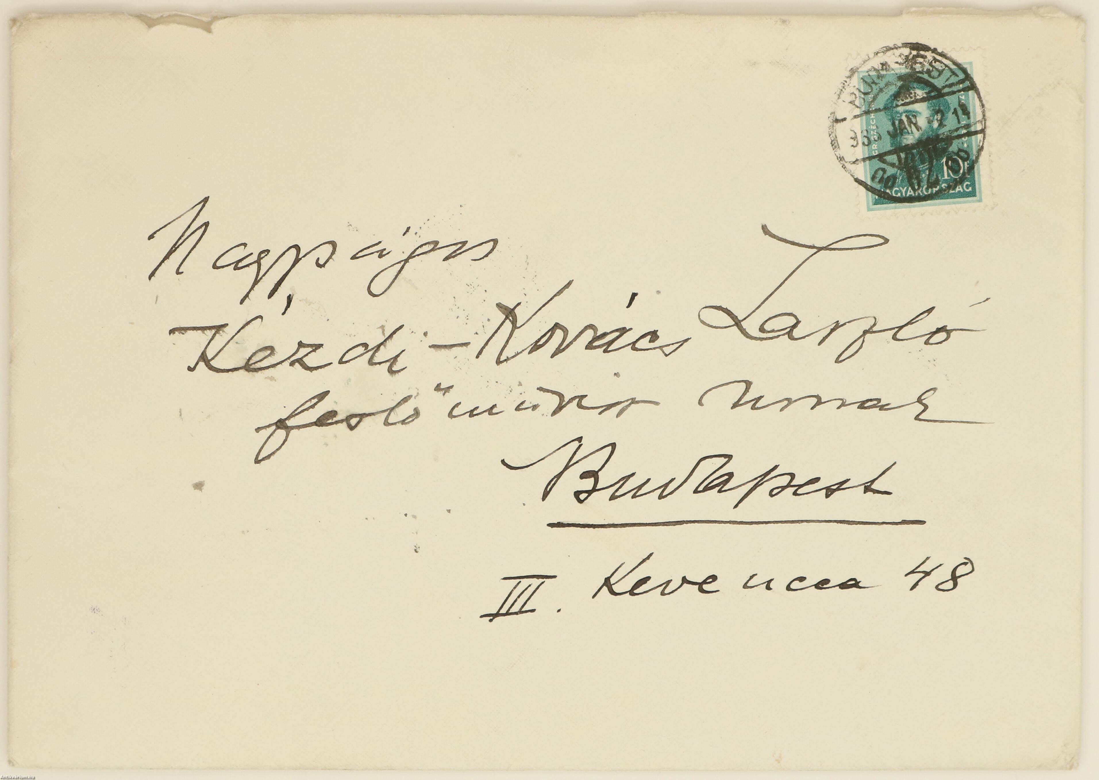 Kézzel írt, hajtogatott, keltezéssel (Bpest, 1932. decz. 31.) és nyomtatott címmel (VI. Benczur-ucca 7.) ellátott, jó állapotú magánlevél, eredeti, kézzel címzett (Nagyságos Kézdi-Kovács László festőművész úrnak, Budapest, III. Keve ucca 48), postai bélyeggel és két bélyegzéssel ellátott borítékban. A boríték hátlapján ceruzás feljegyzés látható.