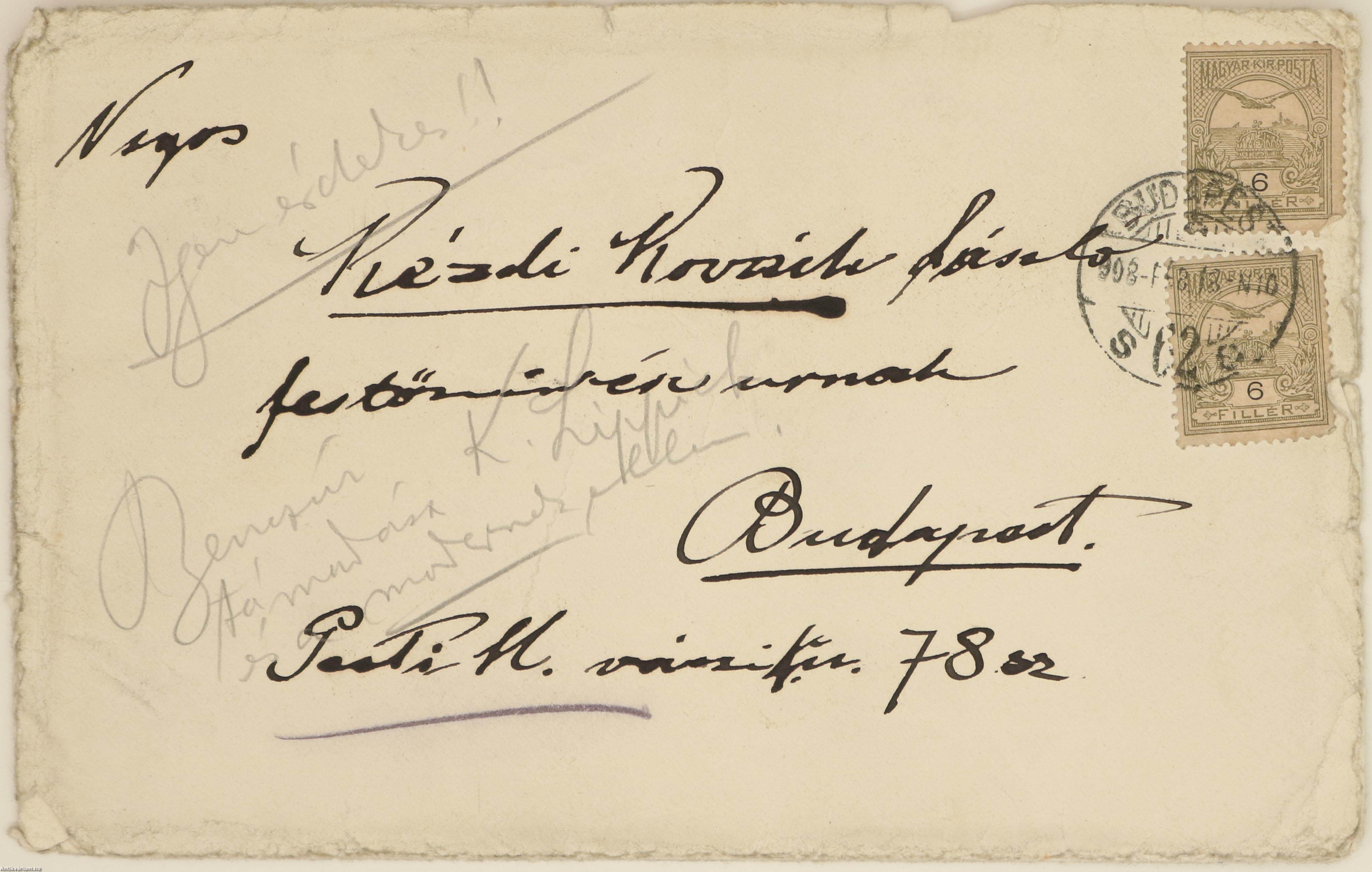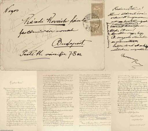3.) 1 darab, „Nsgos Kézdi-Kovách László festőművész urnak” címzett levélboríték, két darab, 6 fillér névértékű bélyeggel, 1908. februári datálású postai bélyegzéssel.