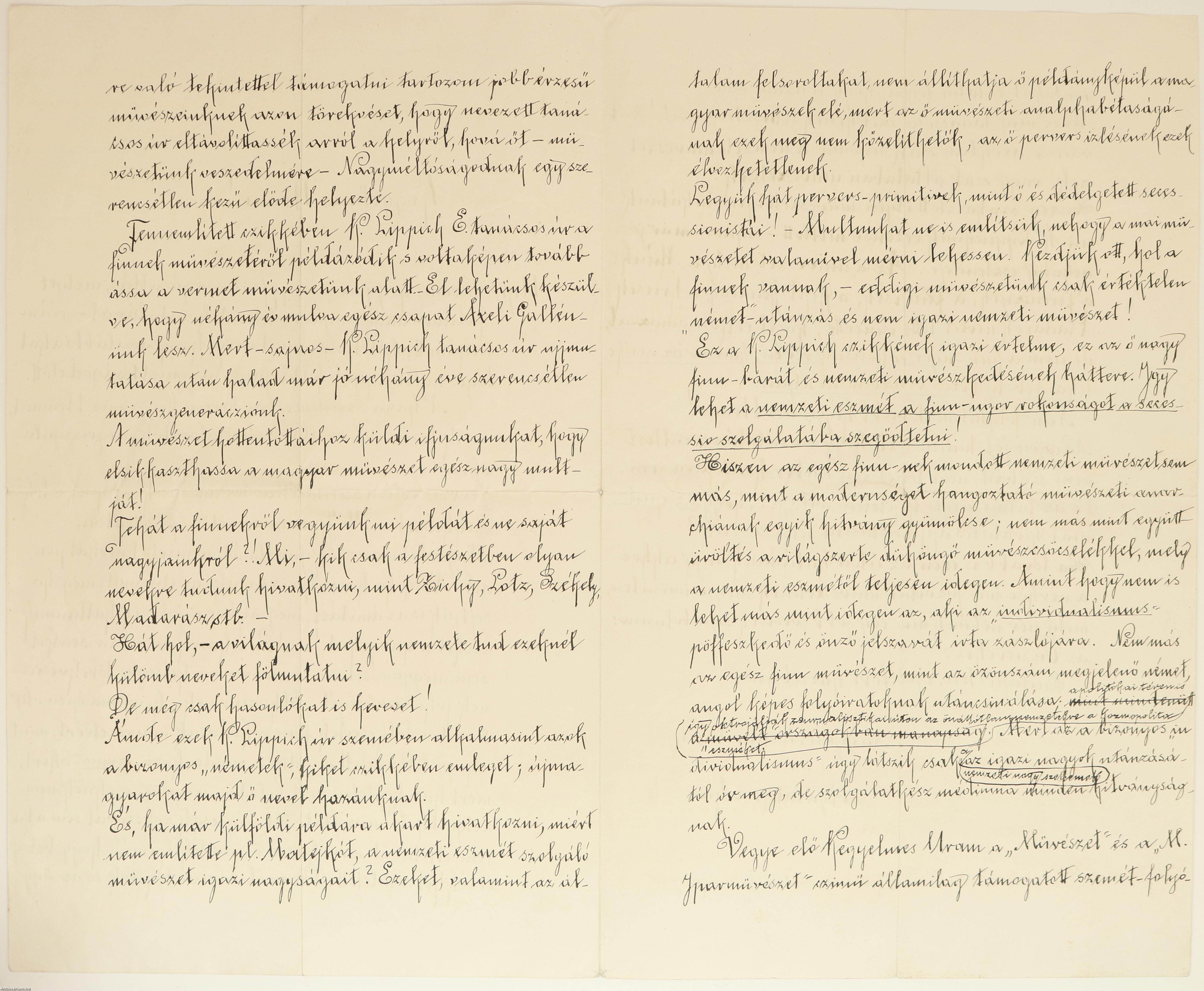 A Benczúr Gyula (1844-1920) festőművészhez köthető hosszabb kézirat (1.) Koronghi Lippich Elek (1862-1924) művészeti író, miniszteri tanácsos, a Vallás- és Közoktatásügyi Minisztérium művészeti osztályvezetője ellen írt panaszlevél és vitairat. Szerzője meglehetősen heves kirohanásának kiindulópontja Lippich Eleknek a Magyar Iparművészet c. folyóiratban a finn művészetről és a haladó szellemiségű finn alkotókról megjelent cikke. A levél keletkezési ideje alapján könnyedén megállapítható, hogy a szóban forgó írás Lippich A finnek című művészeti tanulmánya, amely a Magyar Iparművészet 1908. évi első számában jelent meg.