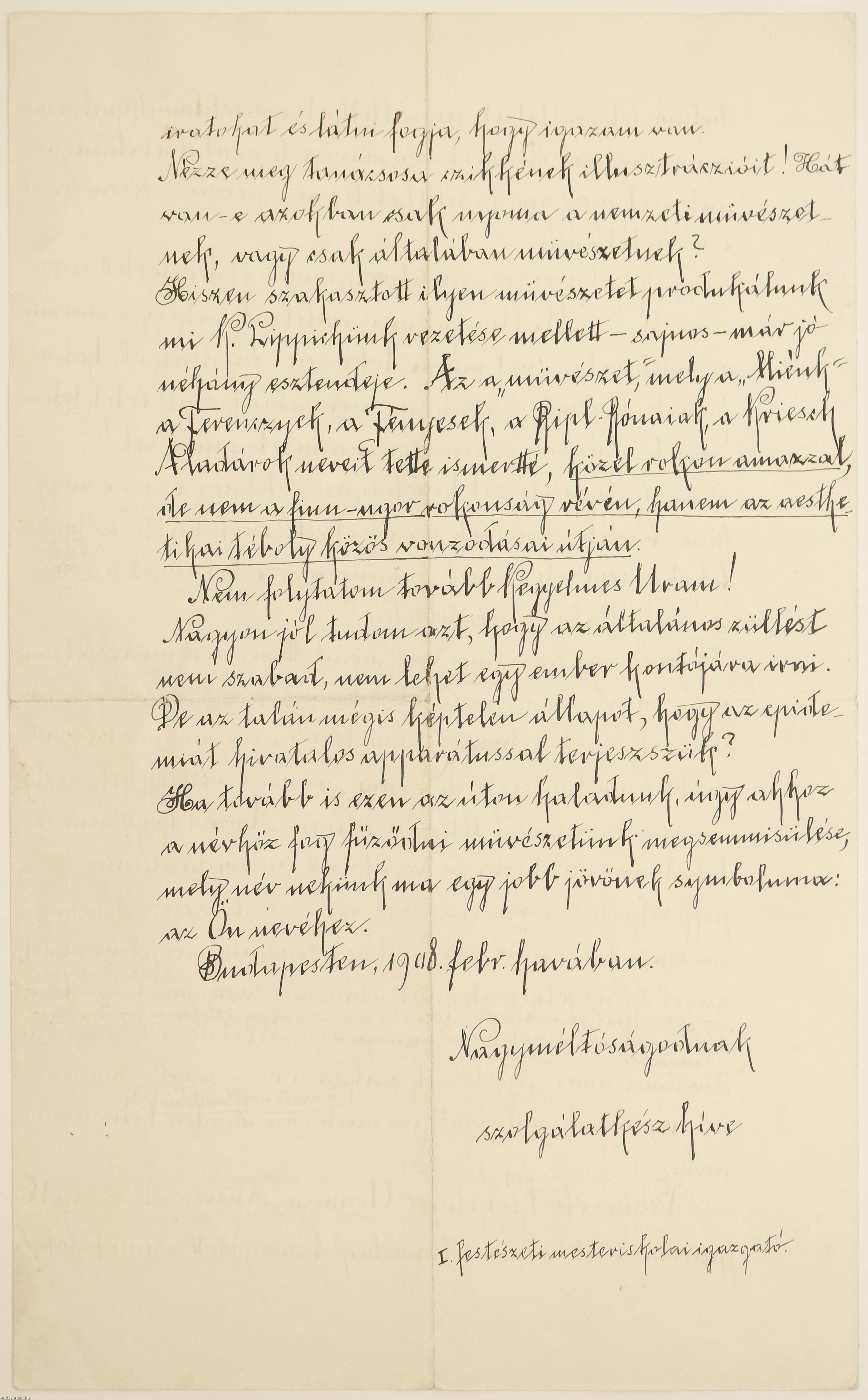 1.) Benczúr Gyula festőművész név nélkül, „I. festészeti mesteriskolai igazgató” titulussal jegyzett, „Kegyelmes Uram!” megszólítással kezdődő levéltervezetének kézirata kalligrafikus szépírással, keltezéssel (”1908. febr. hava”), 4 p. terjedelemben. (kifejtését lásd lentebb!)