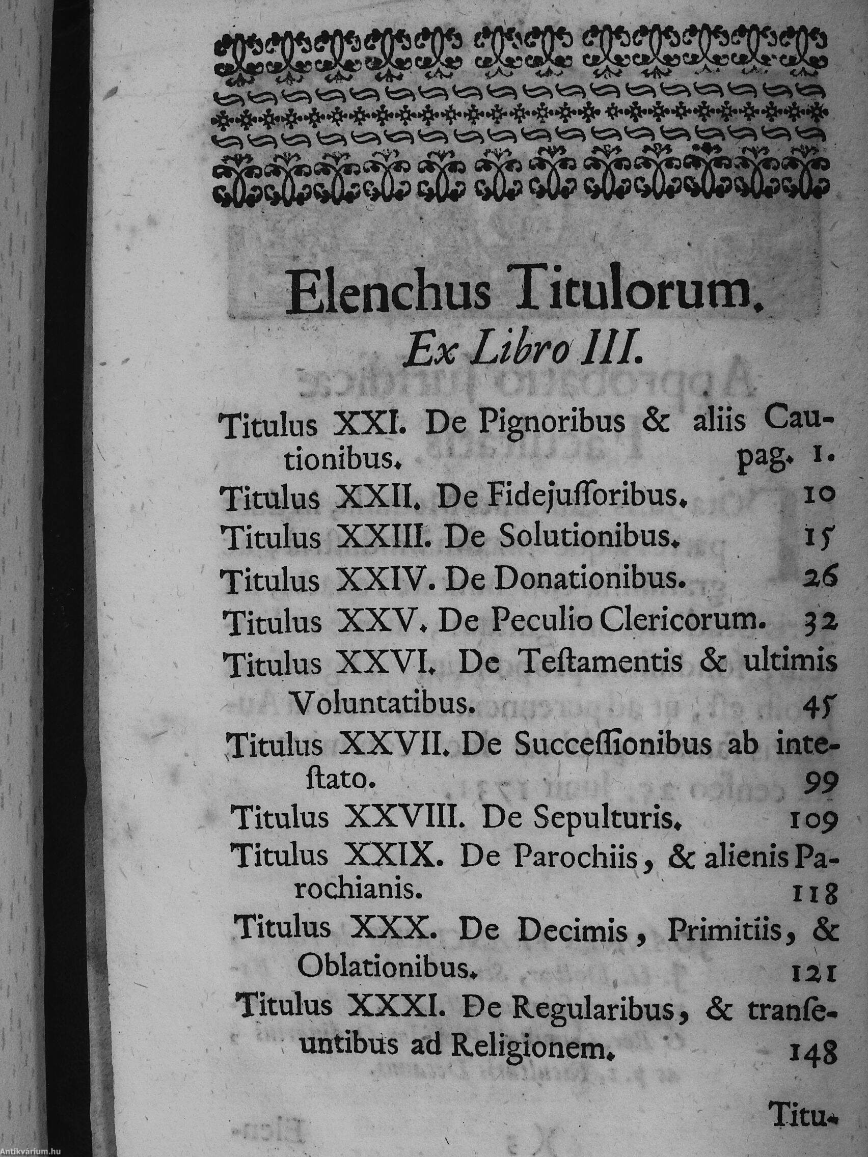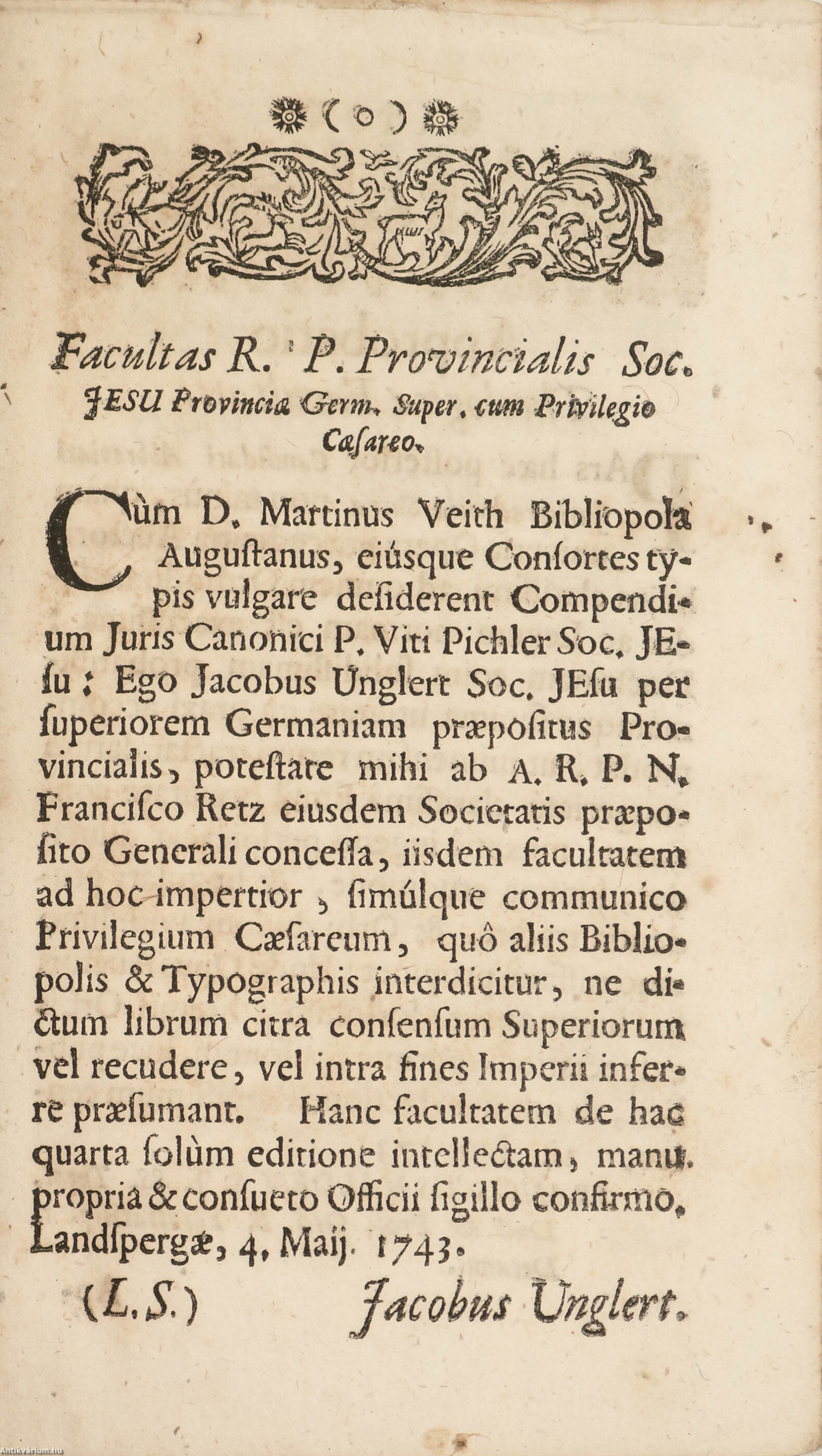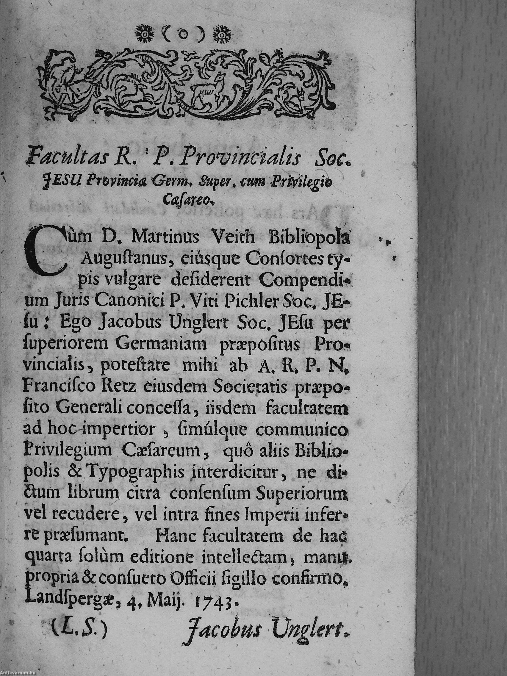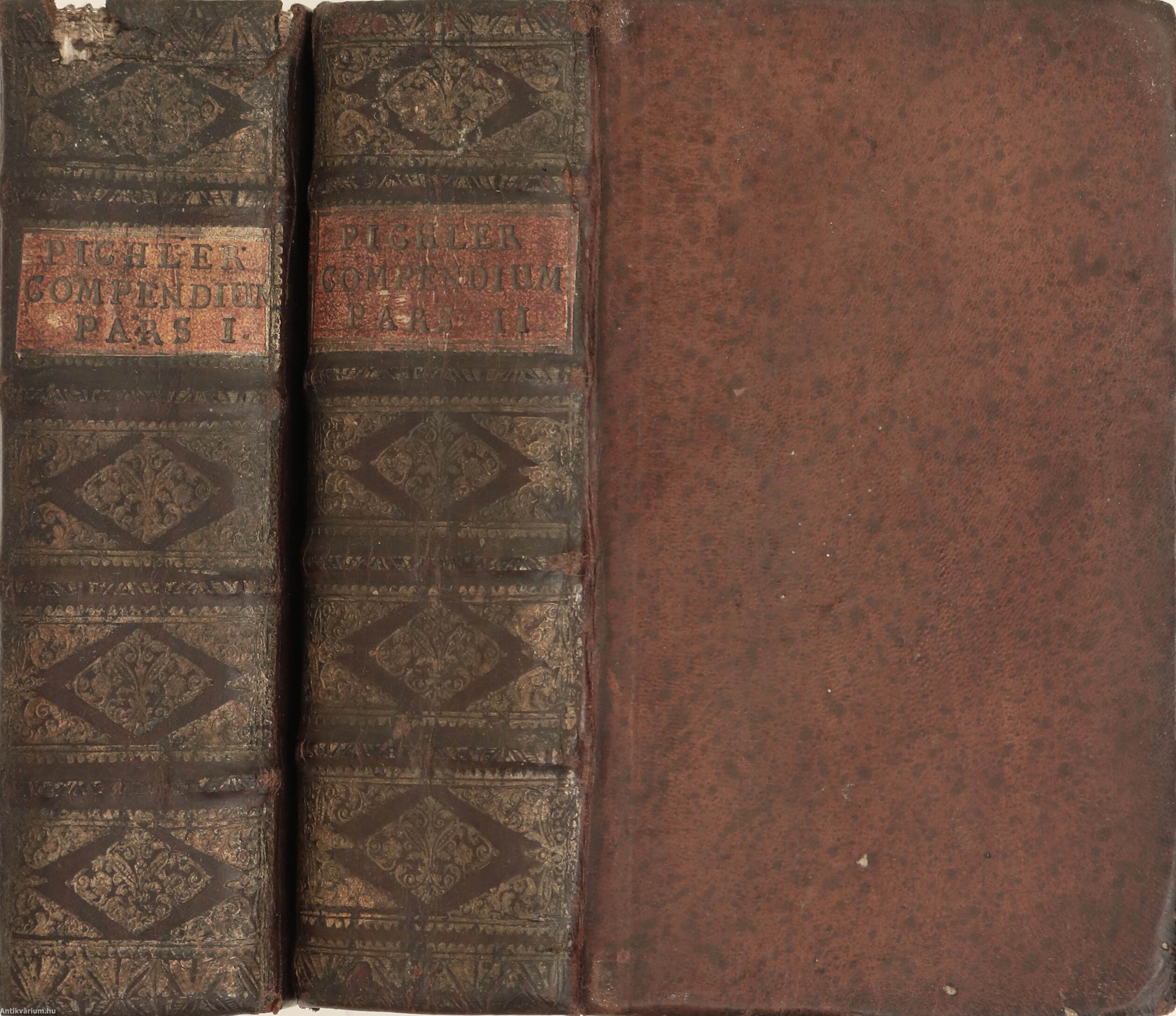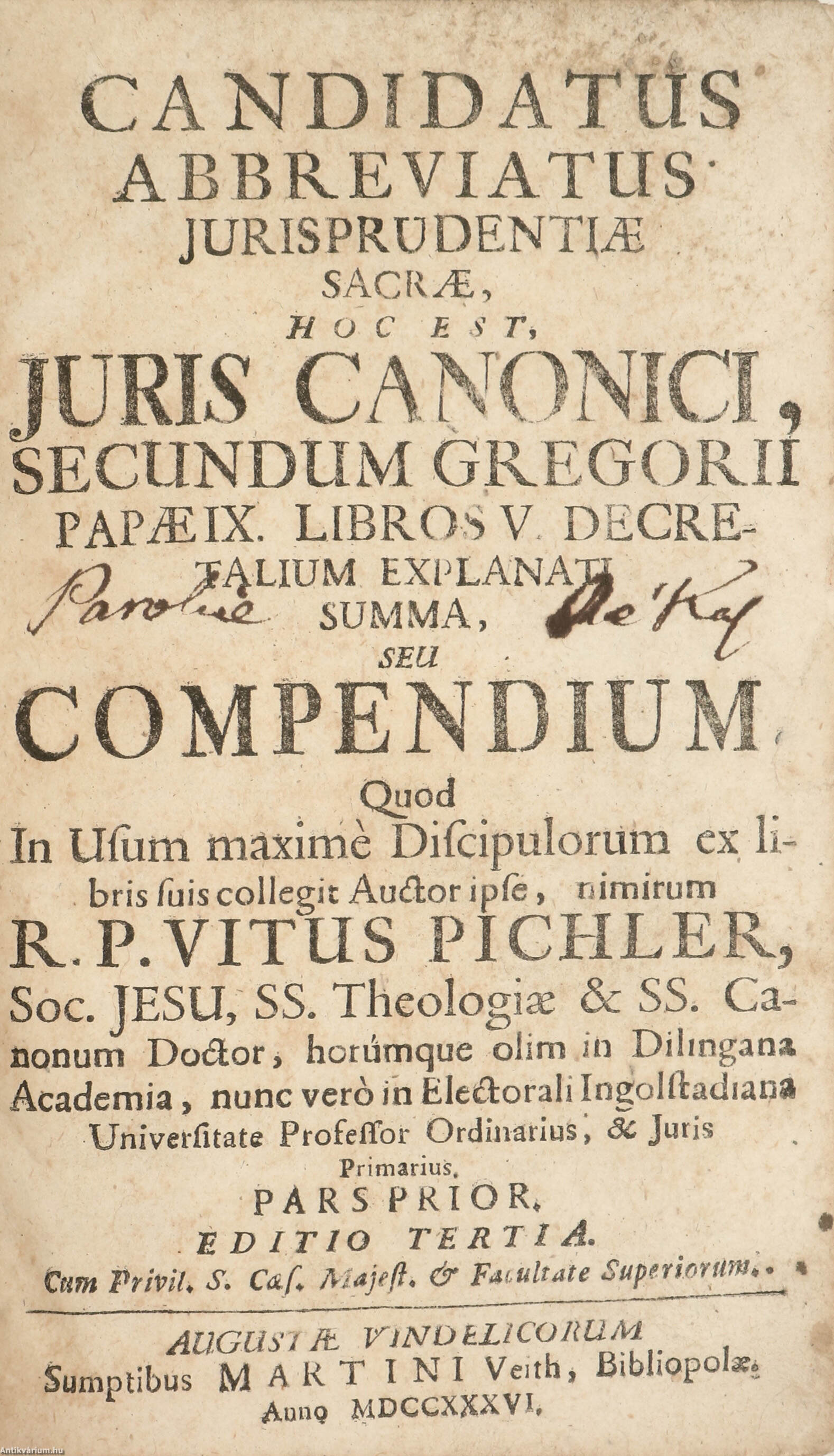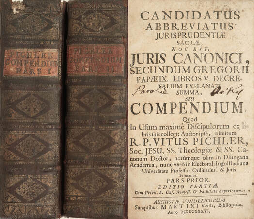 Candidatus abbreviatus jurisprudentiae sacrae, hoc est, juris canonici, secundum Gregorii papae IX. libros V. Decretalium explanati summa, seu Compendium I-II. Quod in Usum maximé Discipulorum ... collegit Auctor ipse ... R. P. Vitus Pichler. / Összevont jogszabálygyűjtemény; azaz a szent kánonjog IX. Gergely pápa Decretaliája szerint öt könyvben értelmezve, avagy Kompendium I-II. Melyeket tanítványai legfőbb hasznára ... összegyűjtött maga a szerző ... R. P. Vitus Pichler. (egységes külön kötetekben) Az első kötet harmadik, a második kötet negyedik kiadás. Néhány fekete-fehér könyvdísszel illusztrált, latin nyelvű kötetek. Az előzéklapokon tollal beírt ex libris bejegyzések, a címlapokon régi tulajdonosi bejegyzések láthatók. Korabeli bőrkötésben lévő kötetek feliratozatlan címfedéllel és hátlappal, aranyozott feliratozású, aranyozott mintával gazdagon díszített könyvgerinccel, színezett lapélekkel, tiszta belívekkel, hiánytalan állapotban. A kánonjogi munka szerzője Vitus Pichler (1670-1736) osztrák származású jezsuita szerzetes, teológus, egyházjogász. 1696-ban lépett a jezsuita rendbe, majd filozófiát és teológiát oktatott a dillingeni, az ingolstadti és az augsburgi egyetemeken. A kánonjog területén végzett munkásságával nemzetközi hírnevet szerzett, és a kor másik híres egyházjogi szakértője, Francis Xavier Schmalzgrüber mellett vált a téma elismert szakértőjévé.