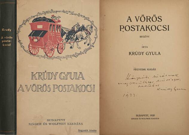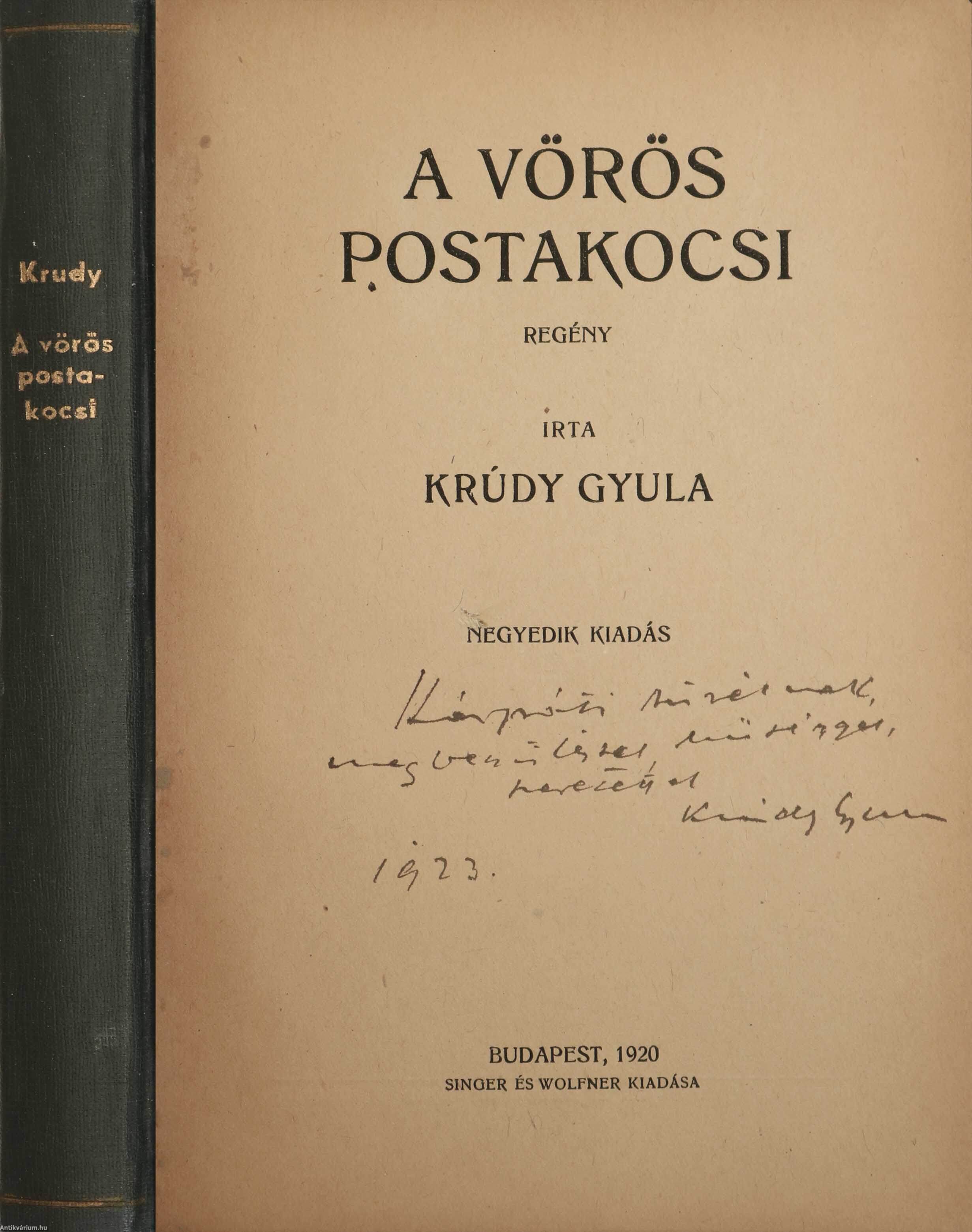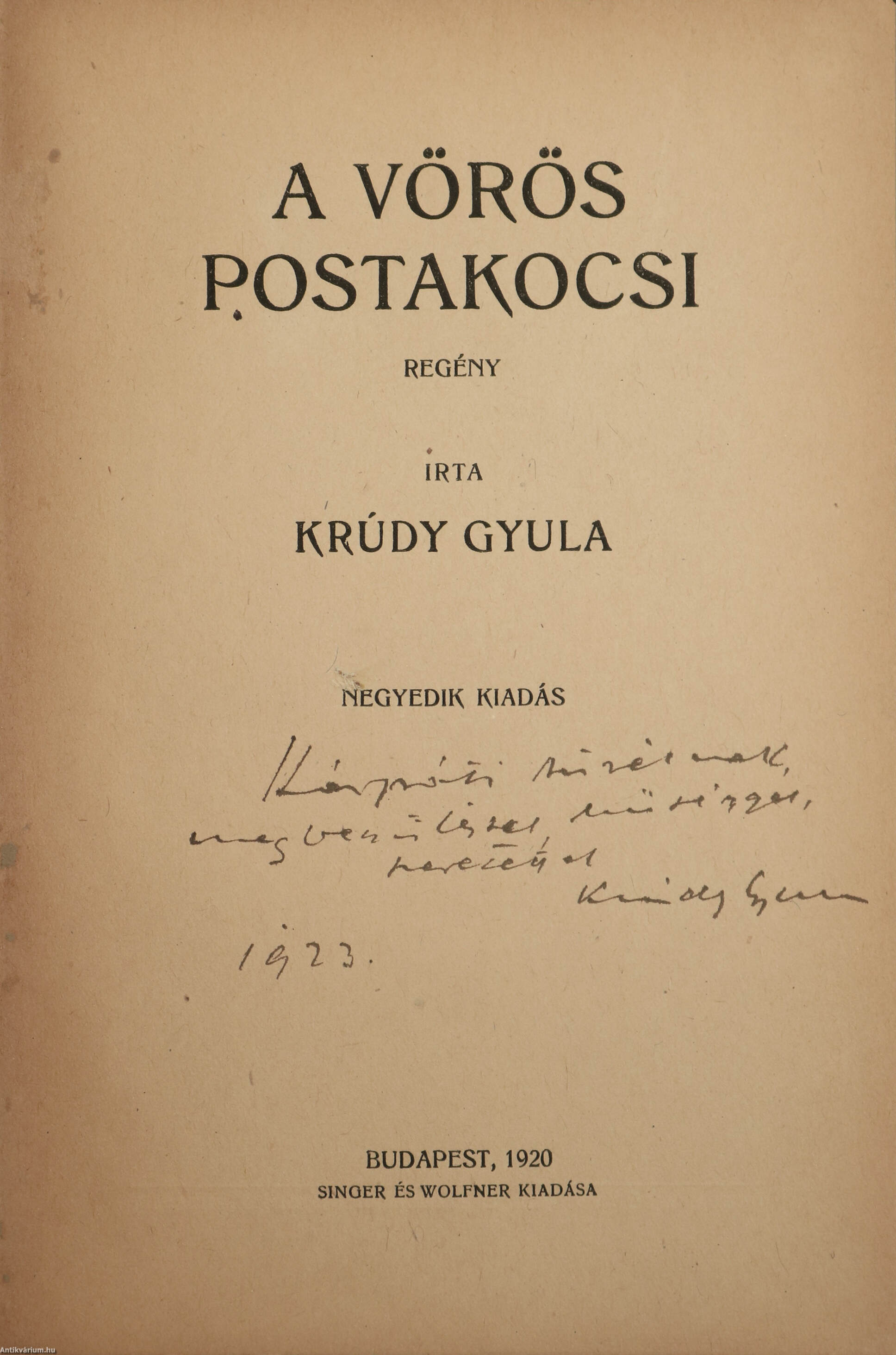 Szerző által dedikált példány. A vörös Postakocsi. Írta: Krúdy Gyula. (Negyeik kiadás.)