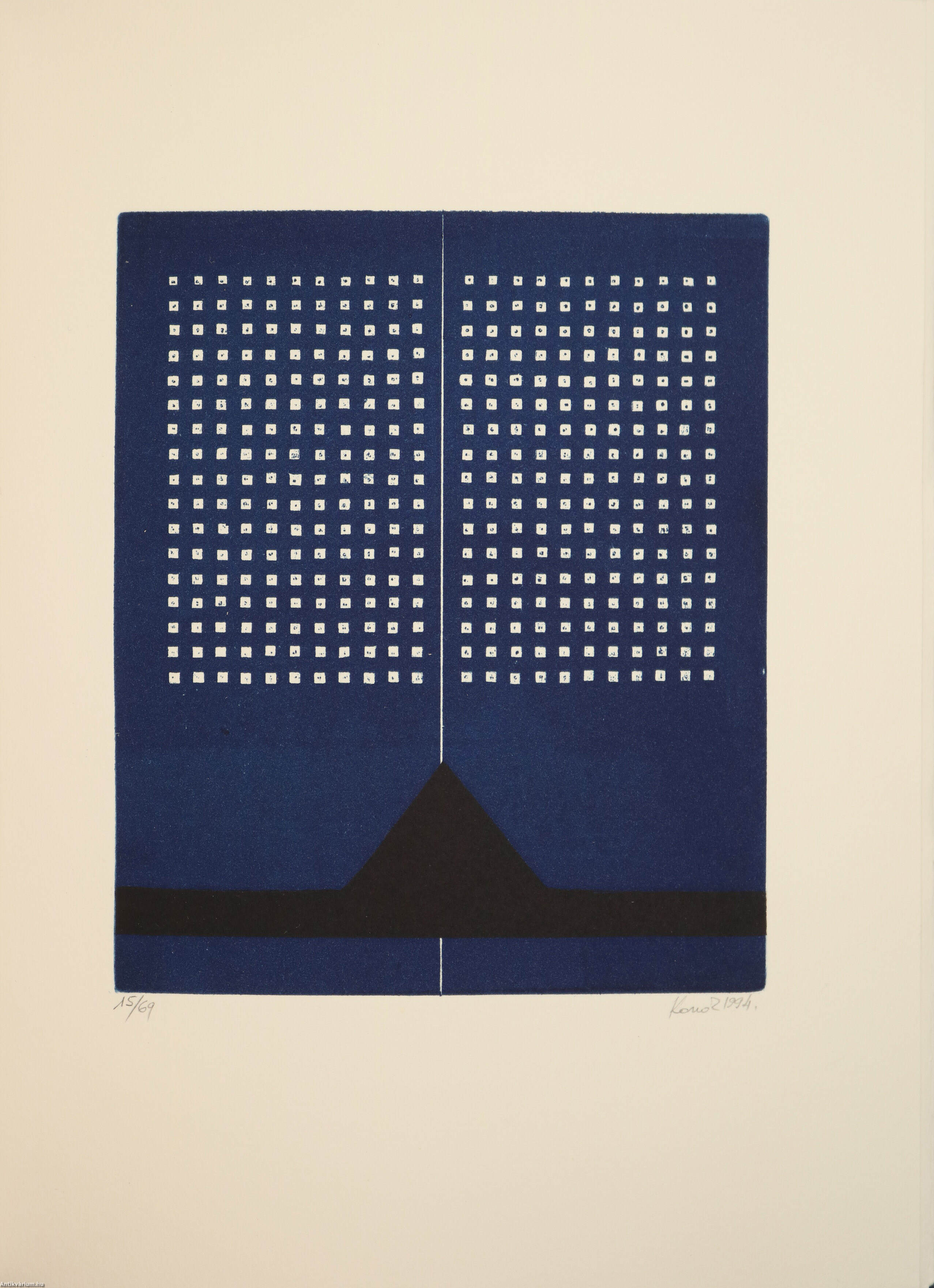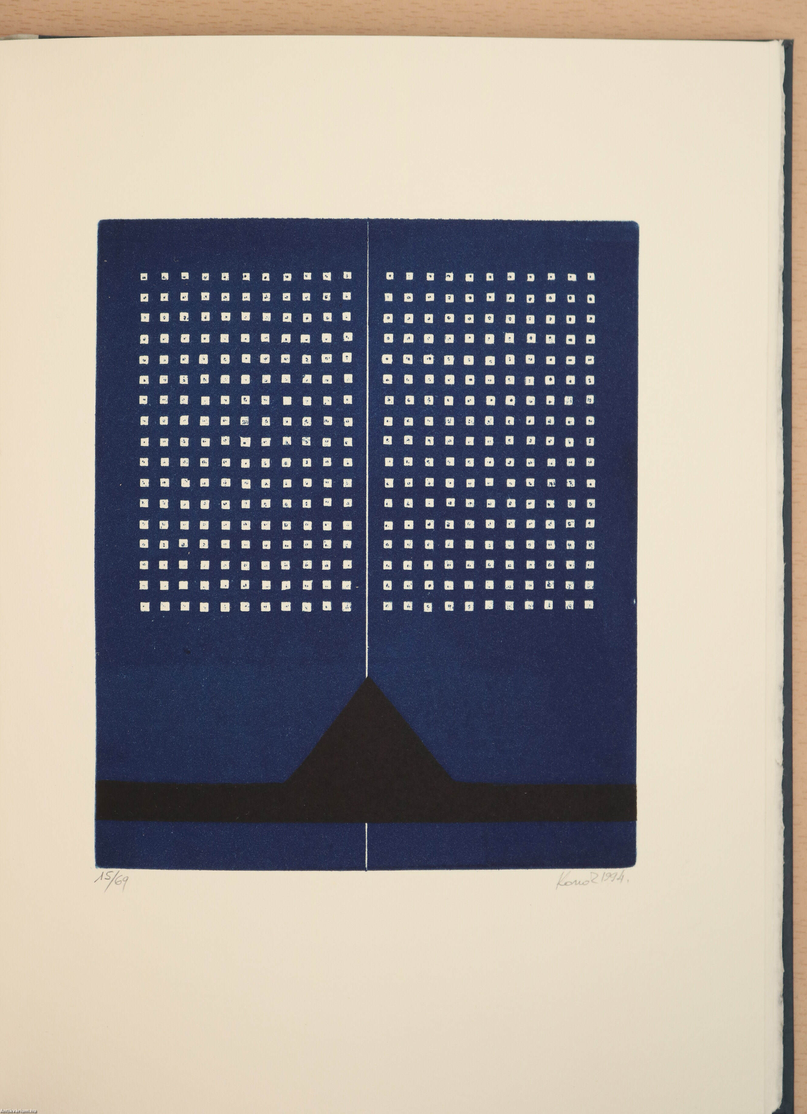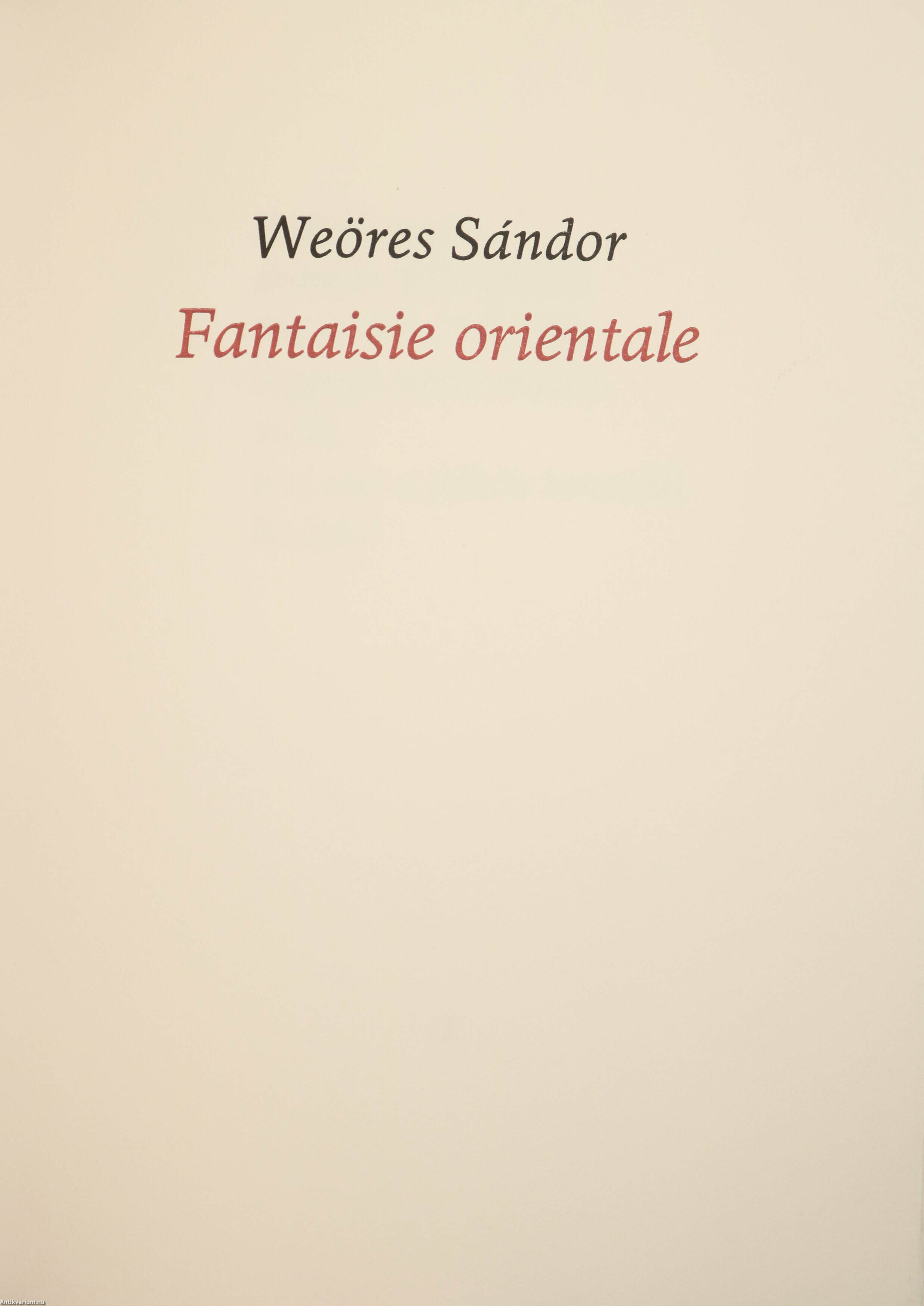 Konok Tamás számozott, aláírt akvatinta eljárással készült illusztrációjával ellátott példány. A Borda Antikvárium bibliofil kiadványainak harmadik darabja. Fantaisie orientale. Az egykori Jugoszláviában dúló polgárháború áldozatainak emlékére. Írta: Weöres Sándor. A kötetet illusztráló kép alatt a grafikus, Konok Tamás jól olvasható kézzel jegyzett számozása, valamint aláírása látható: "15/69" "Konok 1994."