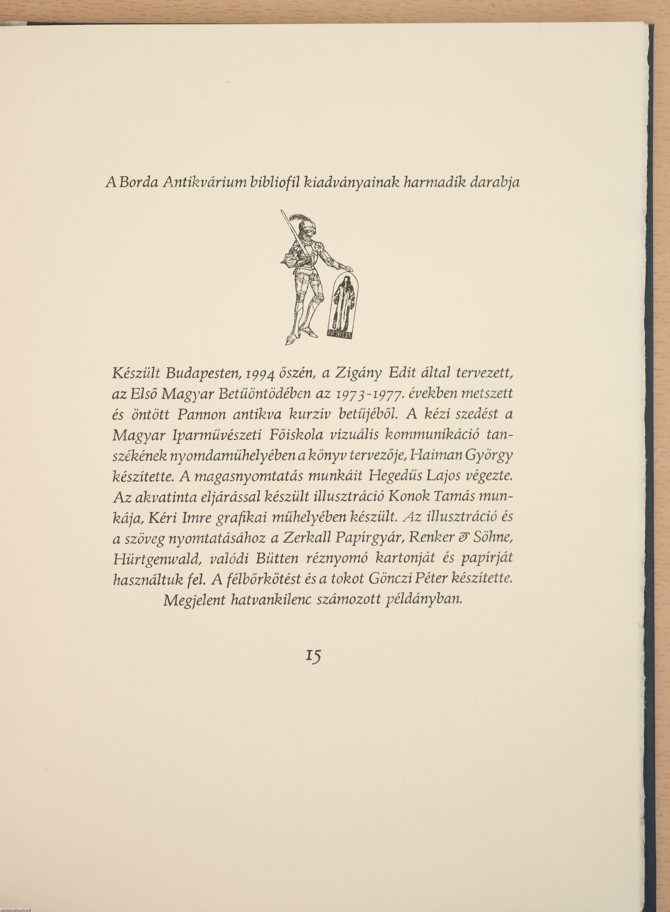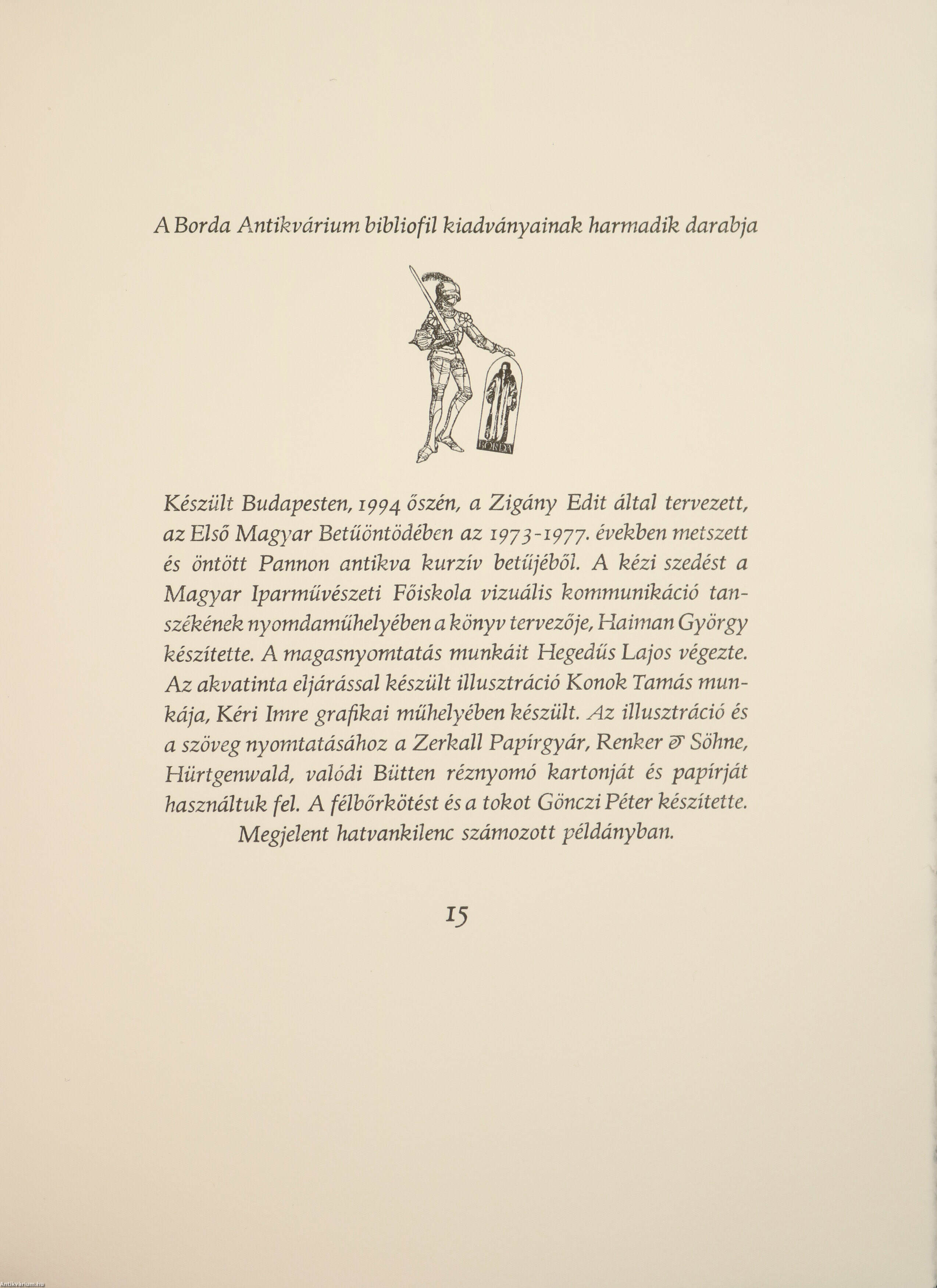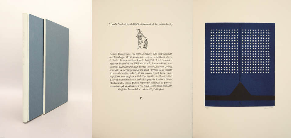 "Készült Budapesten, 1994. őszén, a Zigány Edit által tervezett, az Első Magyar Betűöntödében az 1973-1977. években metszett és Öntött Pannon antikva kurzív betűjéből. A kézi szedést a magyar Iparművészeti Főiskola vizuális kommunikáció tanszékének nyomdaműhelyében a könyv tervezője, Haiman György készítette. A magasnyomtatás munkáit Hegedűs Lajos végezte. Az akvatinta eljárással készült illusztráció Konok Tamás munkája, Kéri Imre grafikai műhelyében készült. Az illusztráció és a szöveg nyomtatásához a Zerkall Papírgyár, Renker & Söhne, Hürtgenwald, valódi Bütten réznyomó kartonját és papírját használtuk fel. A félbőrkötést és a tokot Gönczi Péter készítette. Megjelent hatvankilenc számozott példányban"