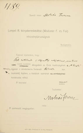 A Lampel R. könyvkereskedése (Wodianer F. és Fiai) részvénytársaság nyomtatott és tollal részben kitöltött, 6175-1905. számú, további tollal beírt számjelzéssel ellátott, a szerzői jogoknak a kiadóra történő átruházásáról rendelkező formanyomtatványa Molnár Ferenc (1878-1952) író tollal beírt, jól olvasható aláírásával és autográf bejegyzéseivel.
