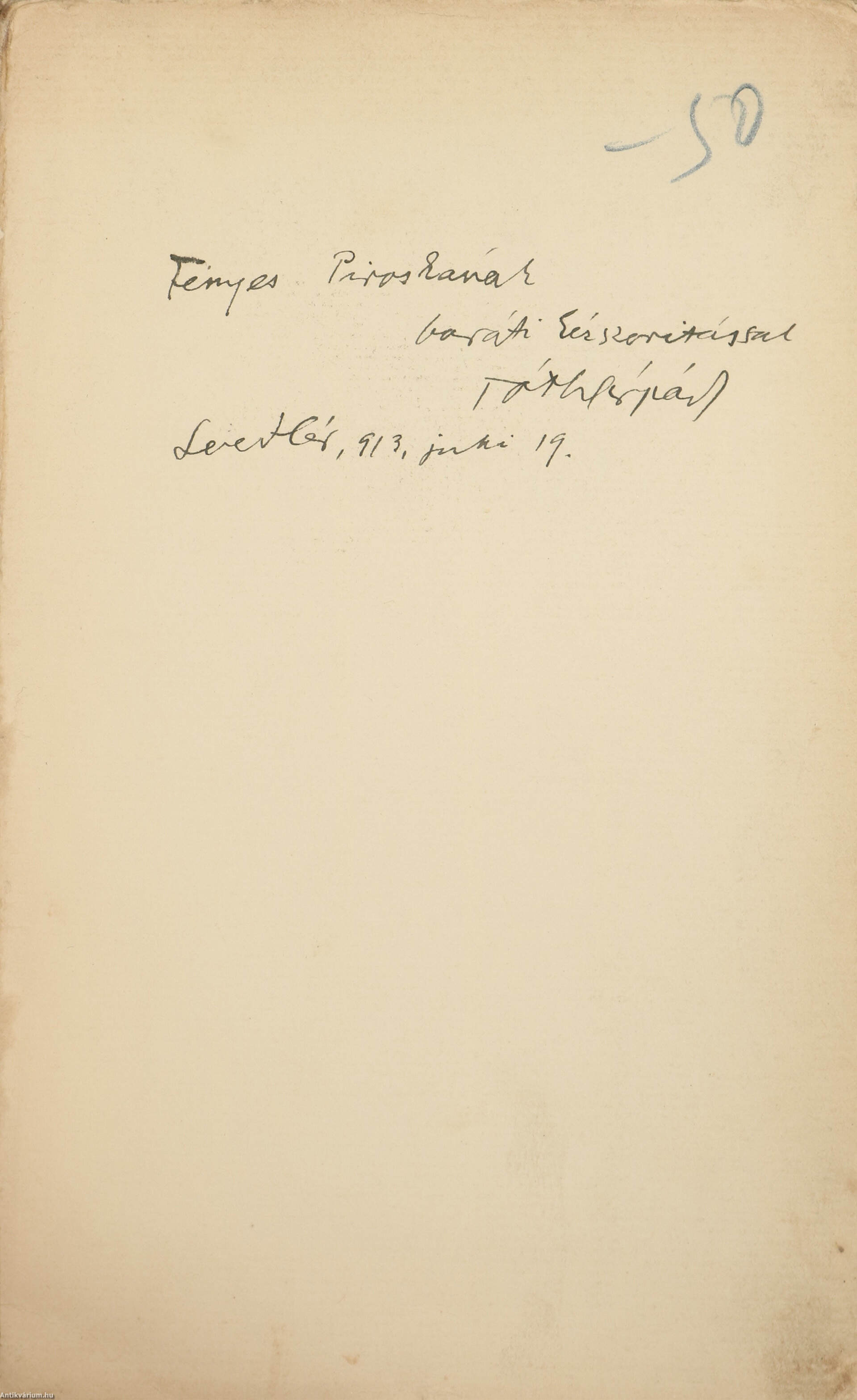 Fényes Piroskának / baráti kézszorítással / Tóth Árpád / Svedlér, 913, juni 19.