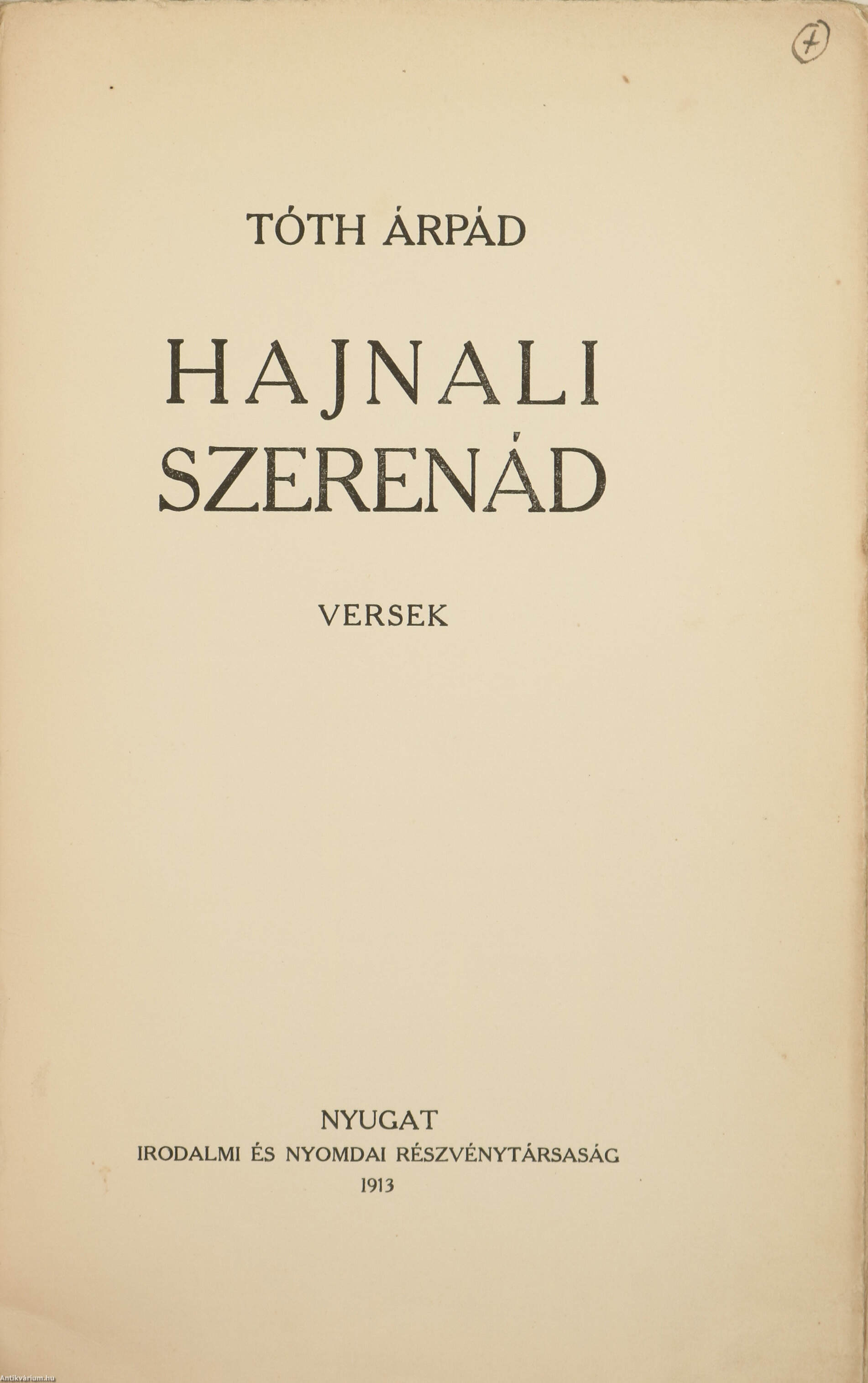 Szerző által dedikált példány. Első kiadás. Hajnali Szerenád. Versek. Írta: Tóth Árpád.