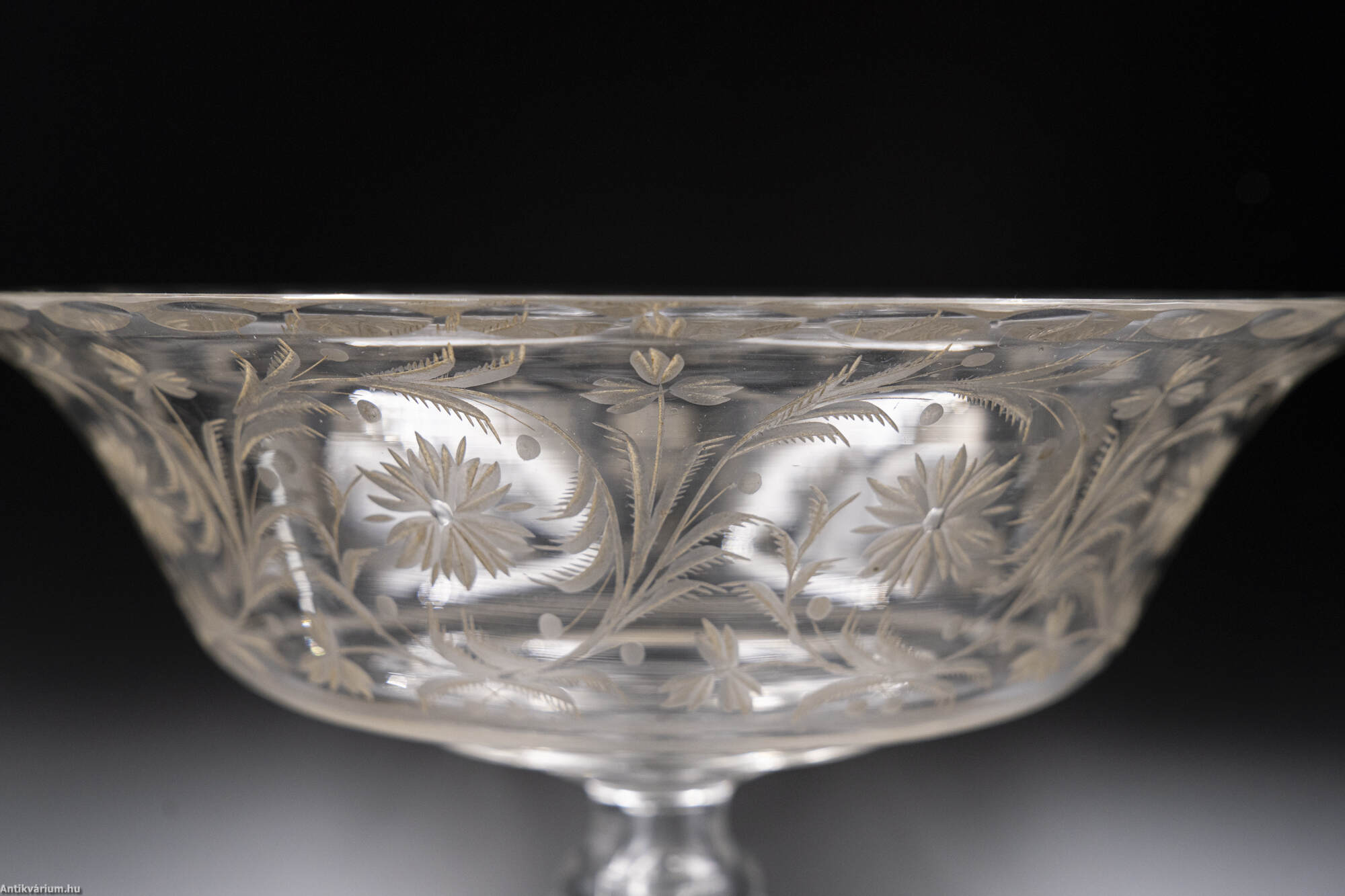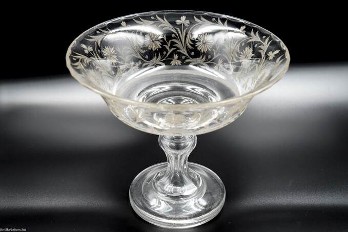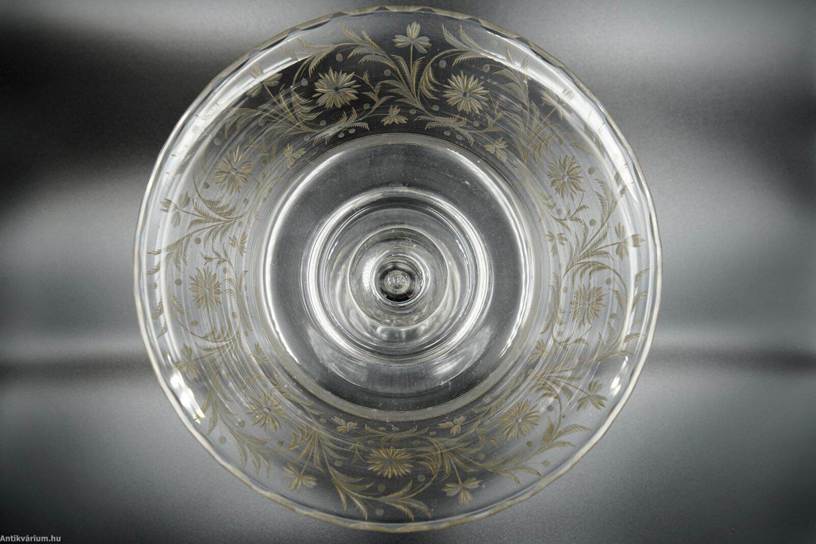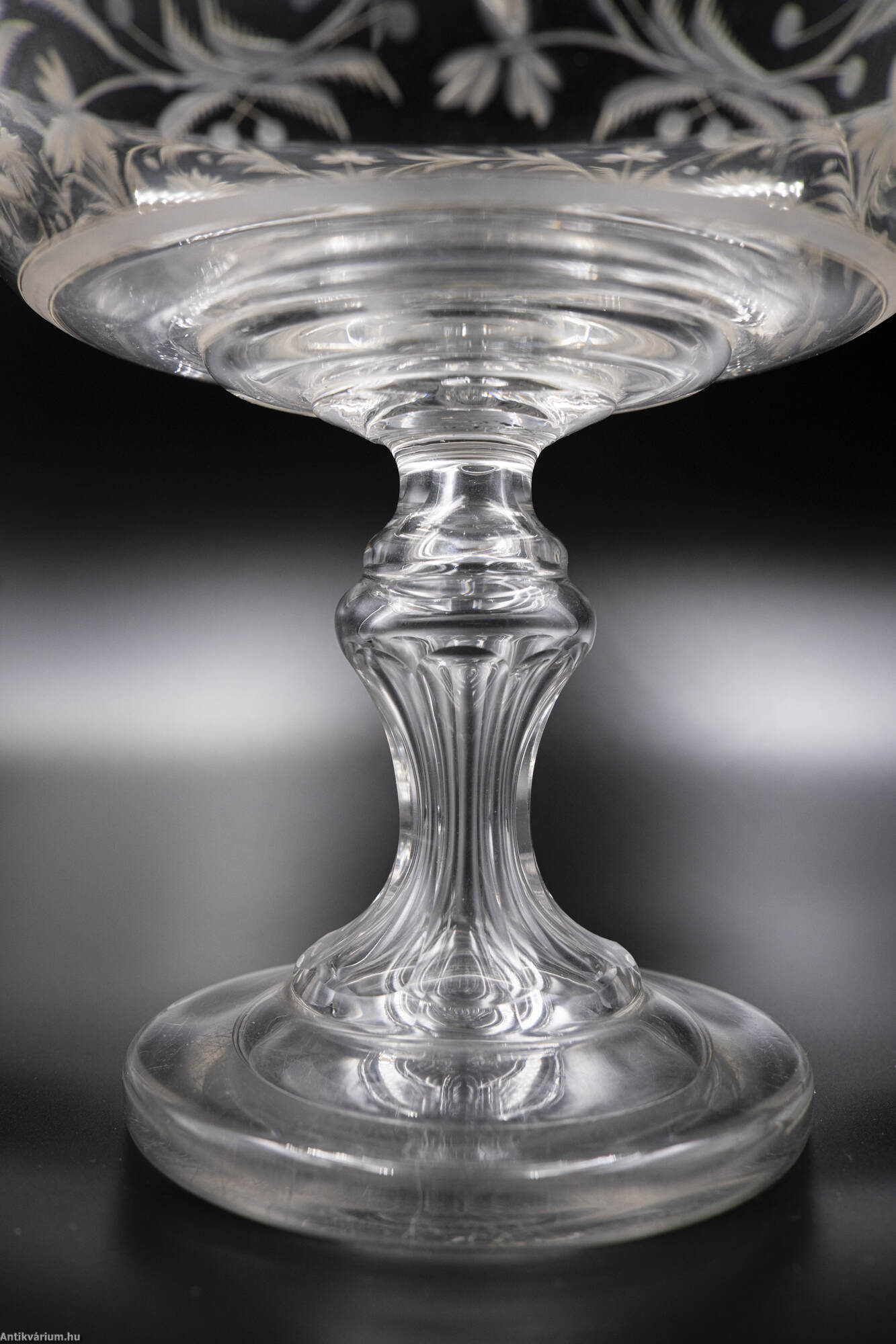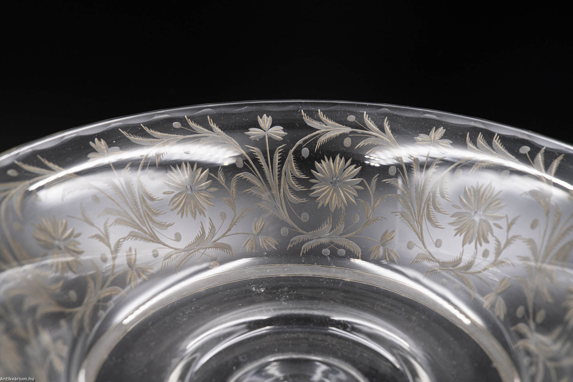 Hibátlan állapotú, fújt és kézzel formázott, valamint kézzel csiszolt, rendkívül igényesen megmunkált talpas asztalközép - üvegtál. Indákkal körbefont virágmotívum csiszolás díszíti, amellyel a csiszolás különleges minősége plasztikus érzetet kelt. 25 cm átmérőjű. Szárrésze és talpa lapra csiszolt, a talpán a fújás helye körkörösen kicsiszolva. Származási hely Osztrák-Magyar Monarchia.