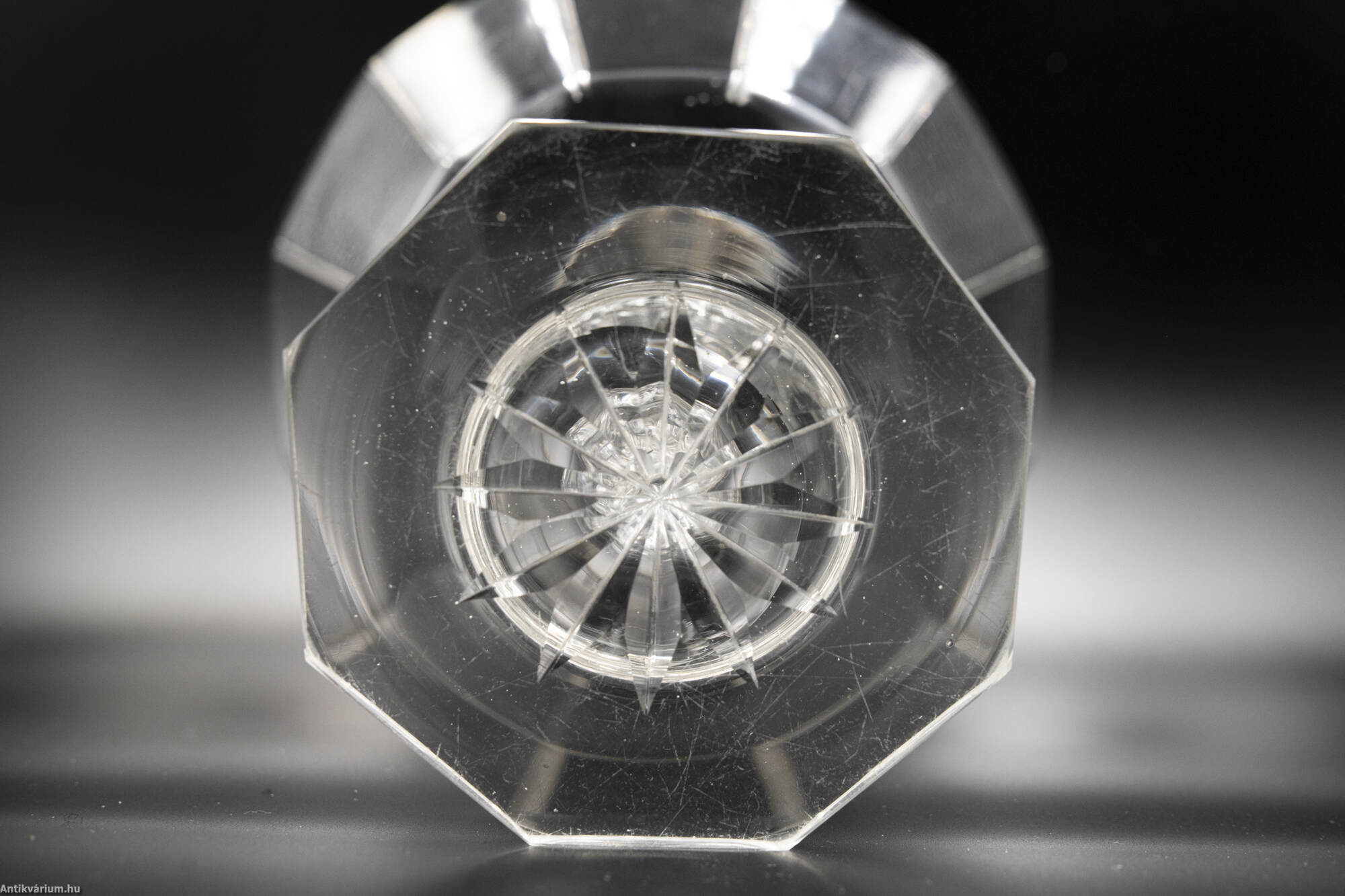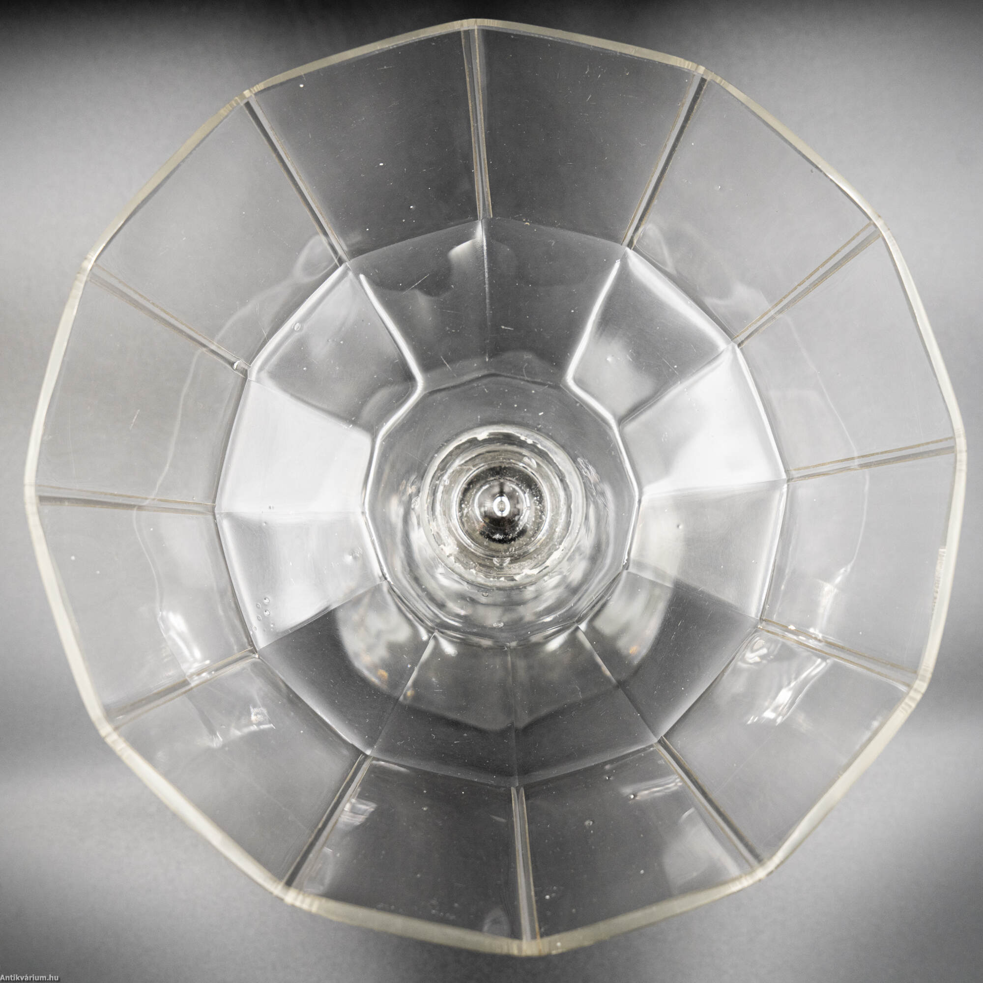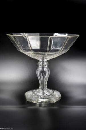 Hibátlan állapotú, fújt és kézzel formázott, átlátszó üvegből készült, csiszolt, igényesen megmunkált talpas Moser-Wiener Werkstatte üvegtál - asztalközép a 1920 körül. Szárrésze hámozott, felső részén 12 részre tagolt, lapra csiszolt osztás látható. Nyolcszögletű talpa lapra csiszolt. Származási hely az Osztrák-Magyar Monarchia. Korának formai jegyeit jellegzetesen magánviselő üveg dísztárgy.