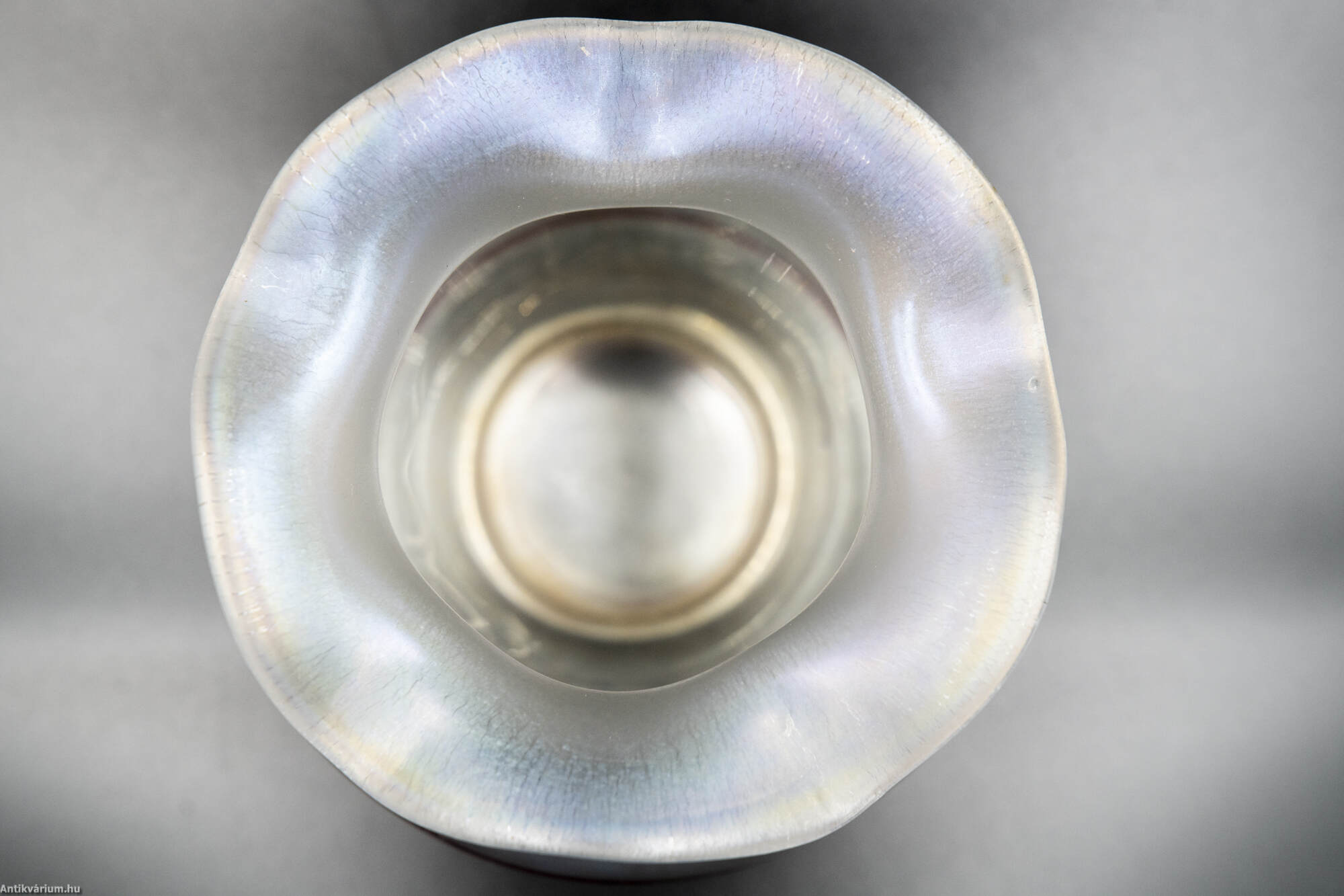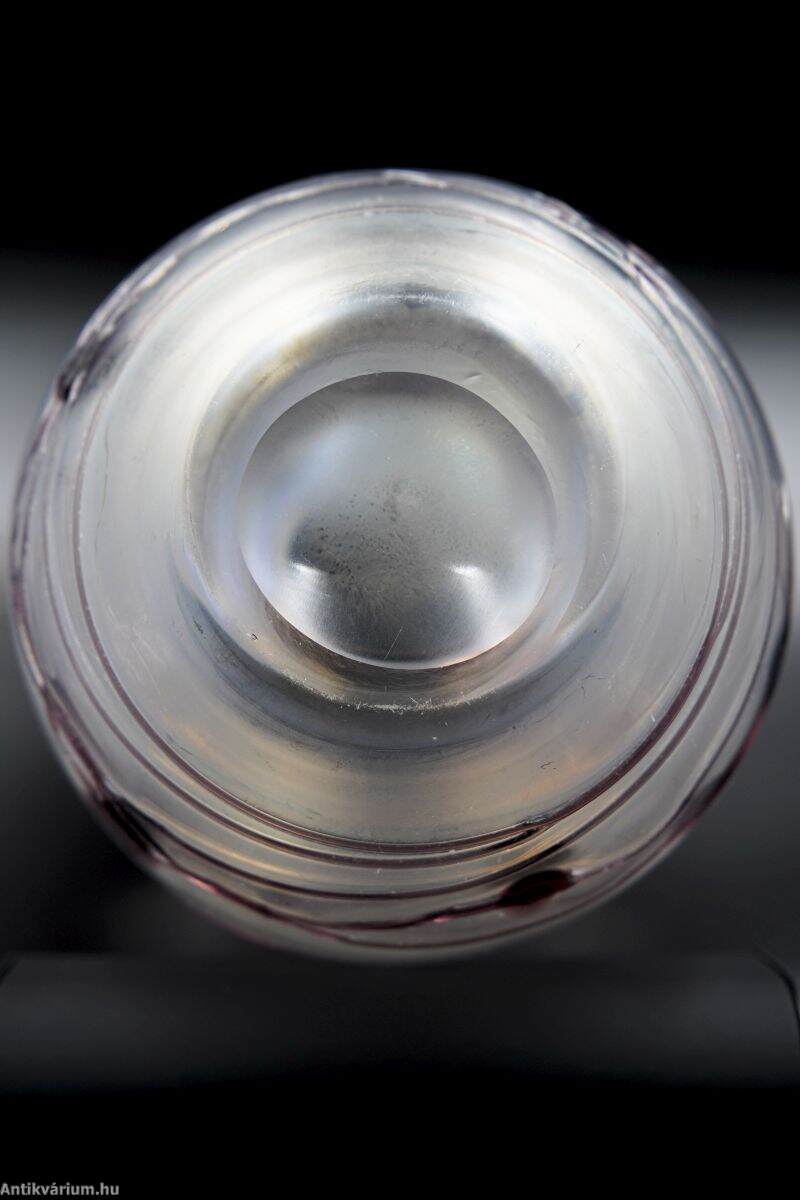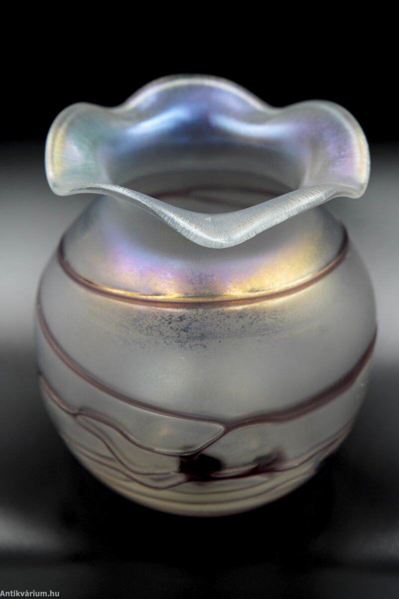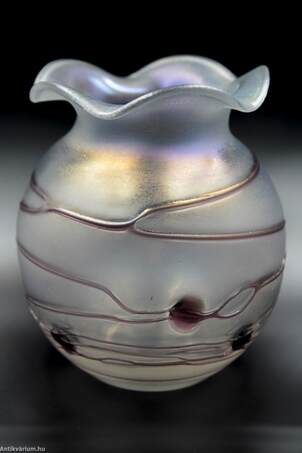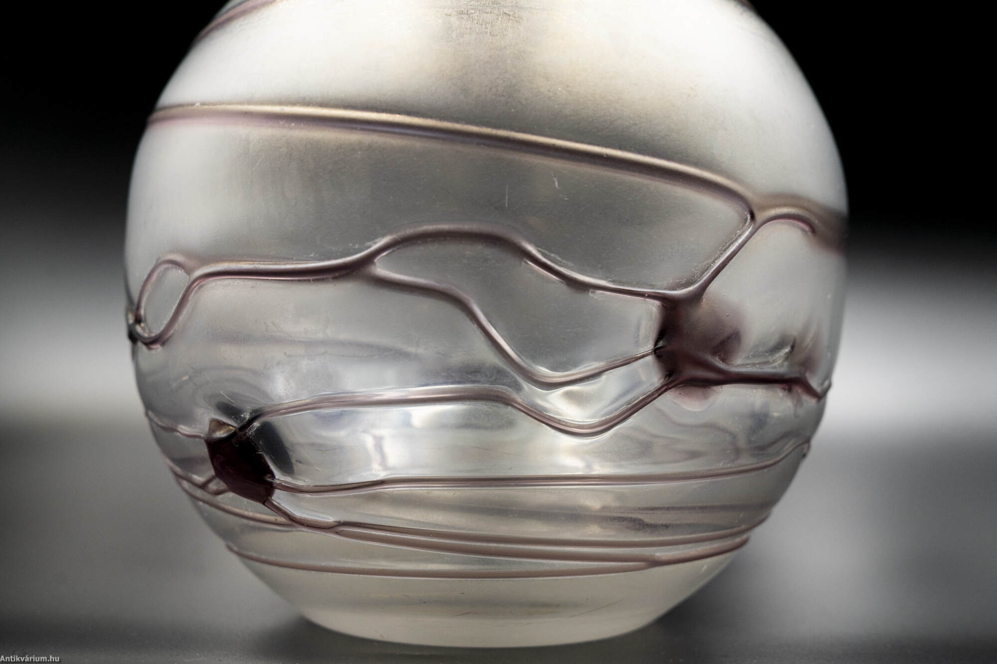 Hibátlan állapotú, Poschinger frauenaui üveggyárából származó szecessziós stílusú üveg váza. Fújt és kézzel formázott gömb formájú, felülete matt hatású. Irizált rétegét a teljes felületén körbefuttatott lila színű olvadt üvegszálak - és kerek minta díszíti. Alul a fújás helye (köldök) körkörösen van kicsiszolva. Kiszélesedő száj része hullámszerűen formázva. Finom pasztell harmónia és izgalmas fényjáték együttes hatása teszi különlegessé. Igényes gyűjteményes darab.