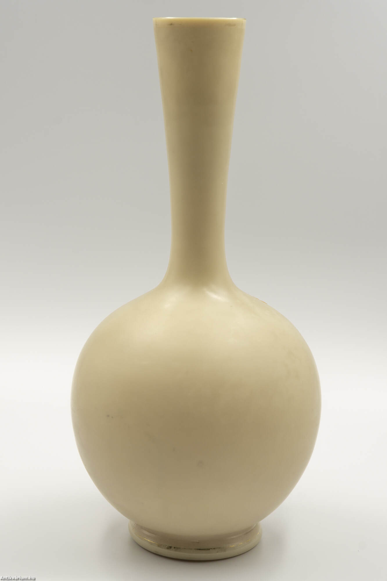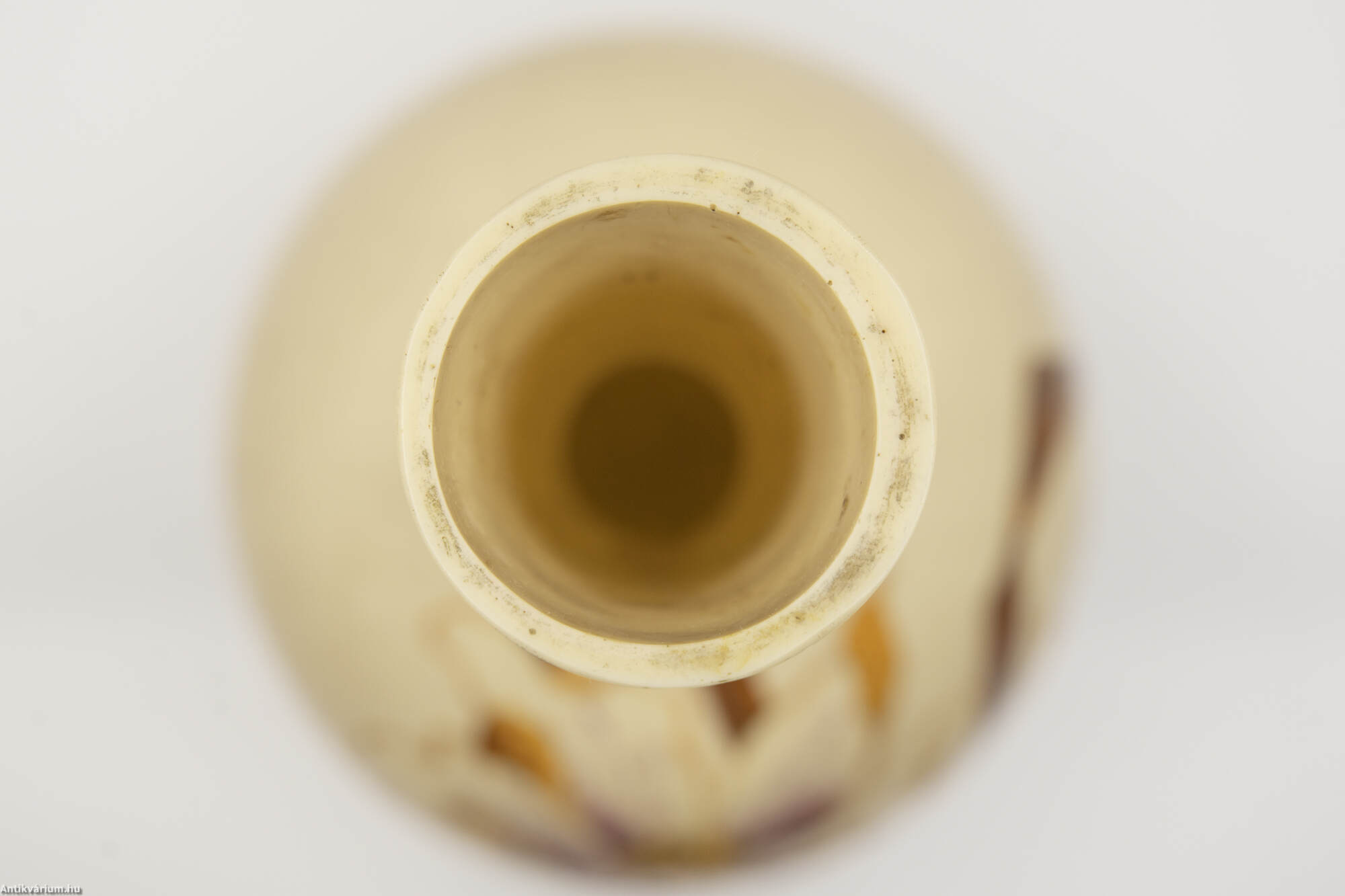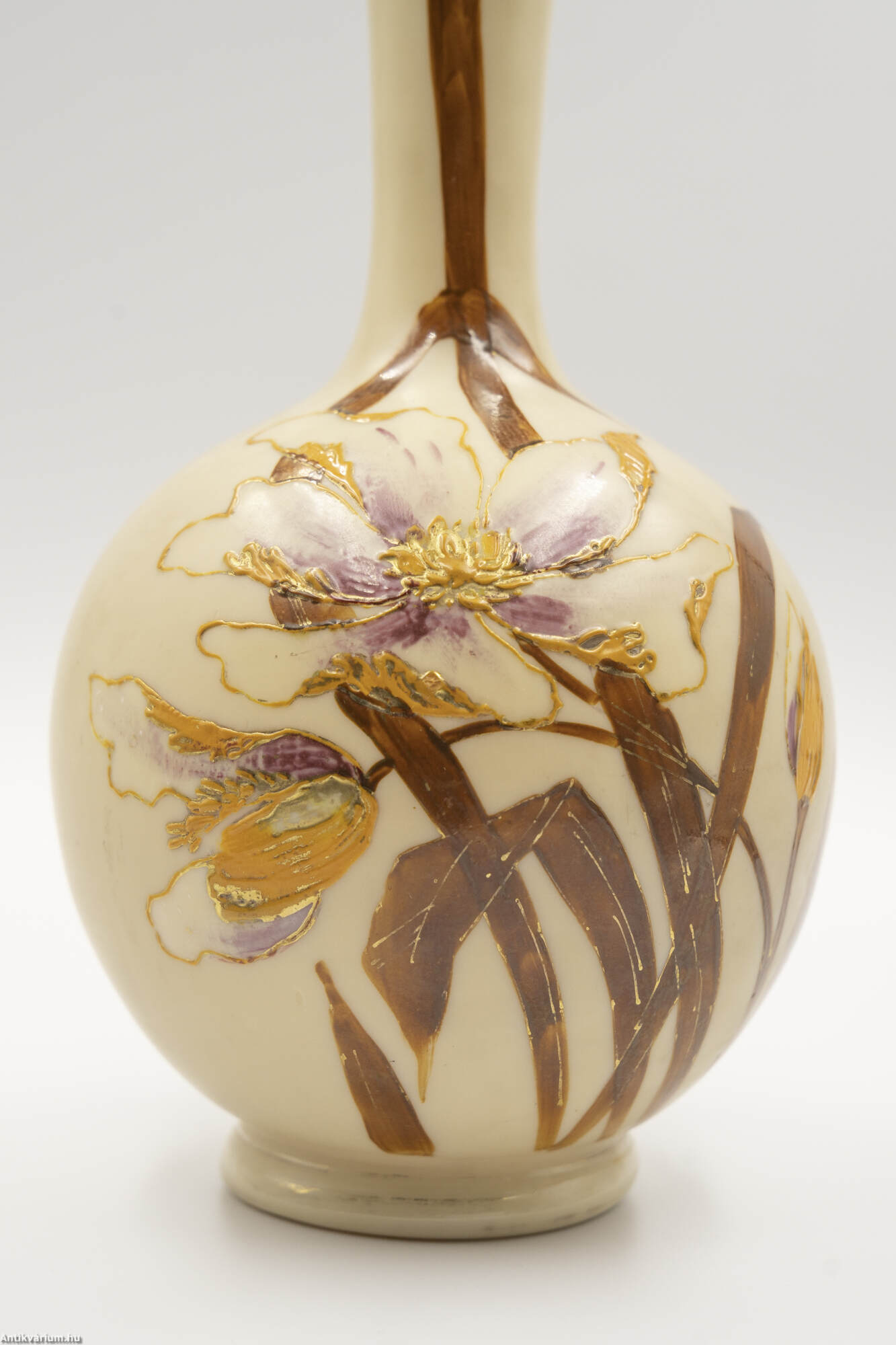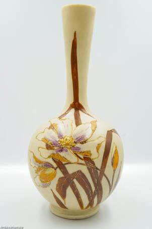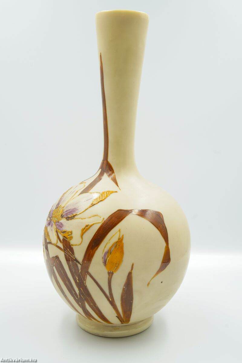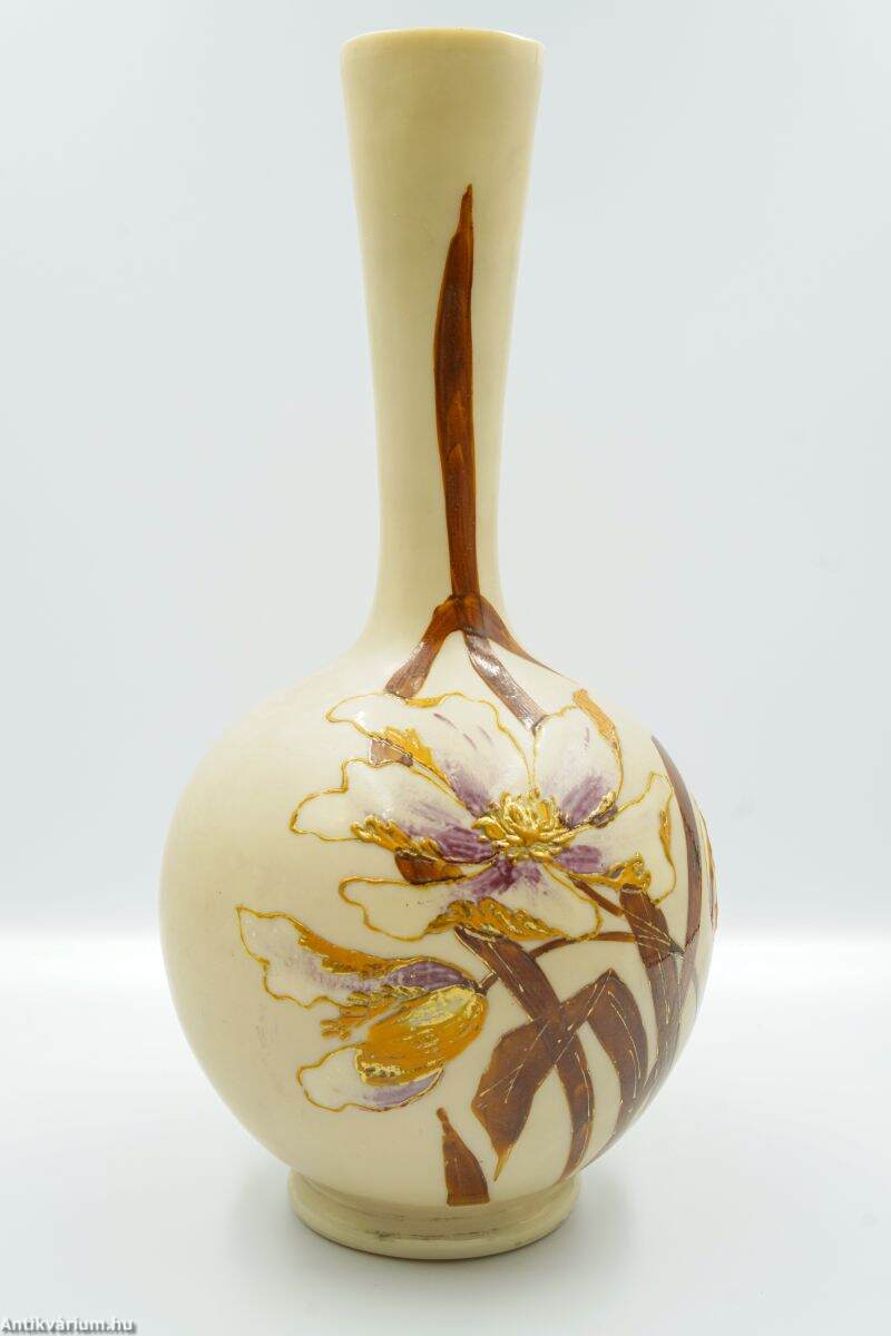 Hibátlan állapotú, fújt és kézzel formázott szecessziós üveg váza, amelyet a 19. század végén - 20. század elején készítettek. Kézzel festett, bézs színű átlátszatlan üveg növényi és virág ornamentikával díszítve a kor jellegzetes stílusában. Igényesen kivitelezett dekoratív váza. Származási hely valószínűsíthetően Franciaország.