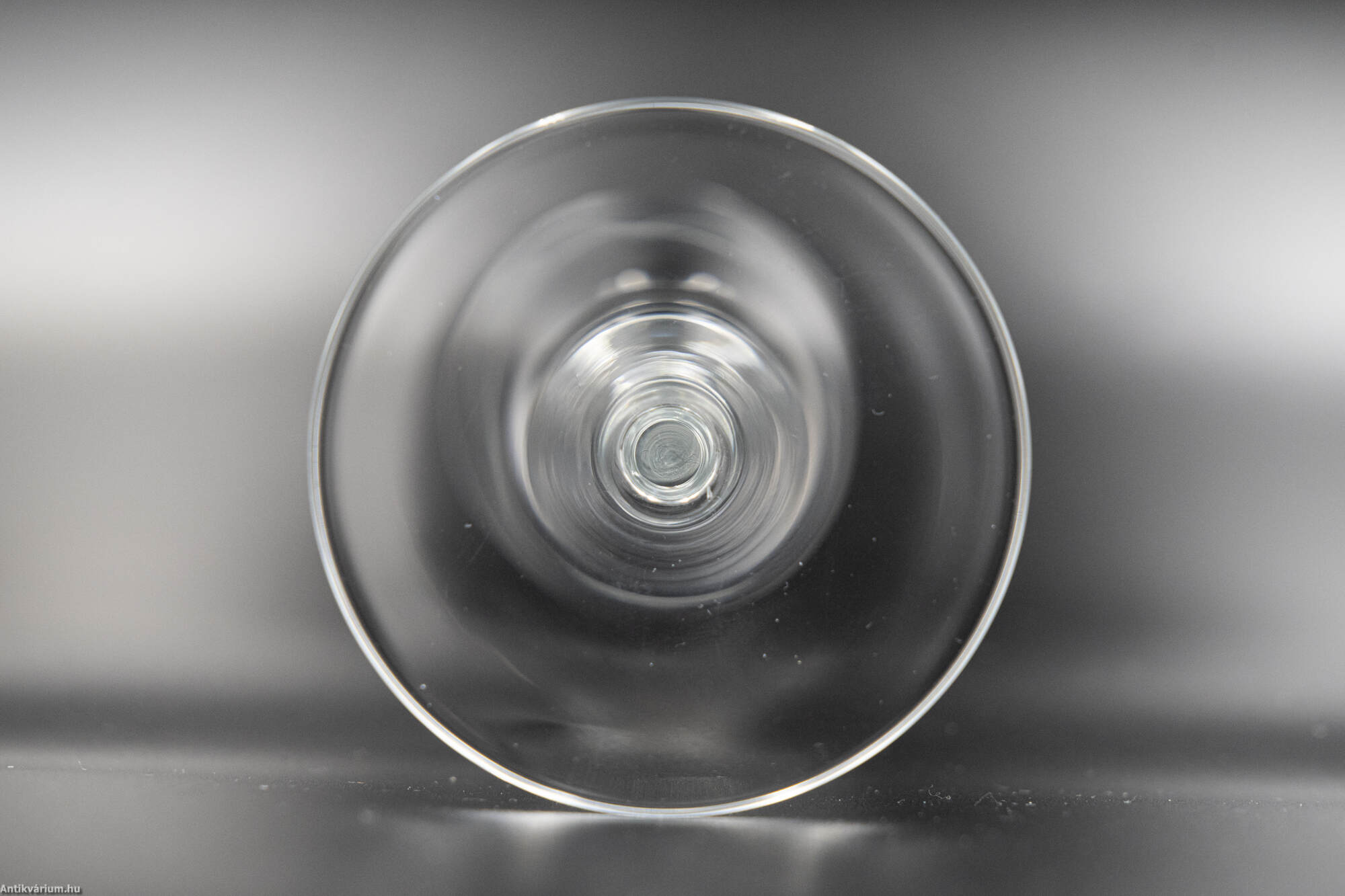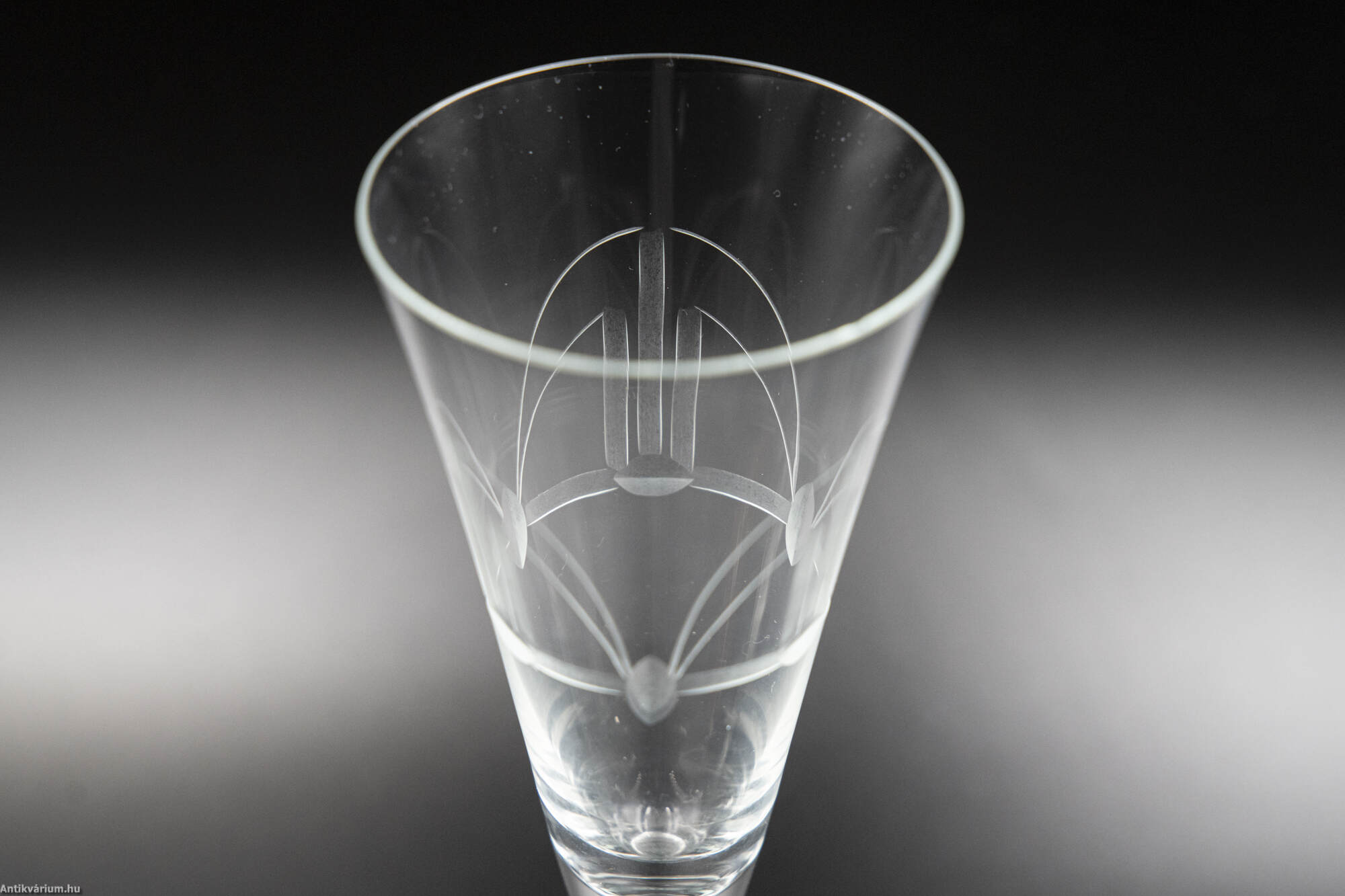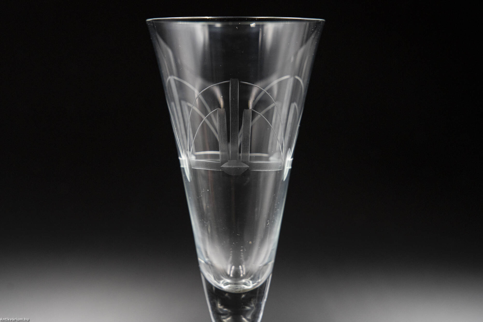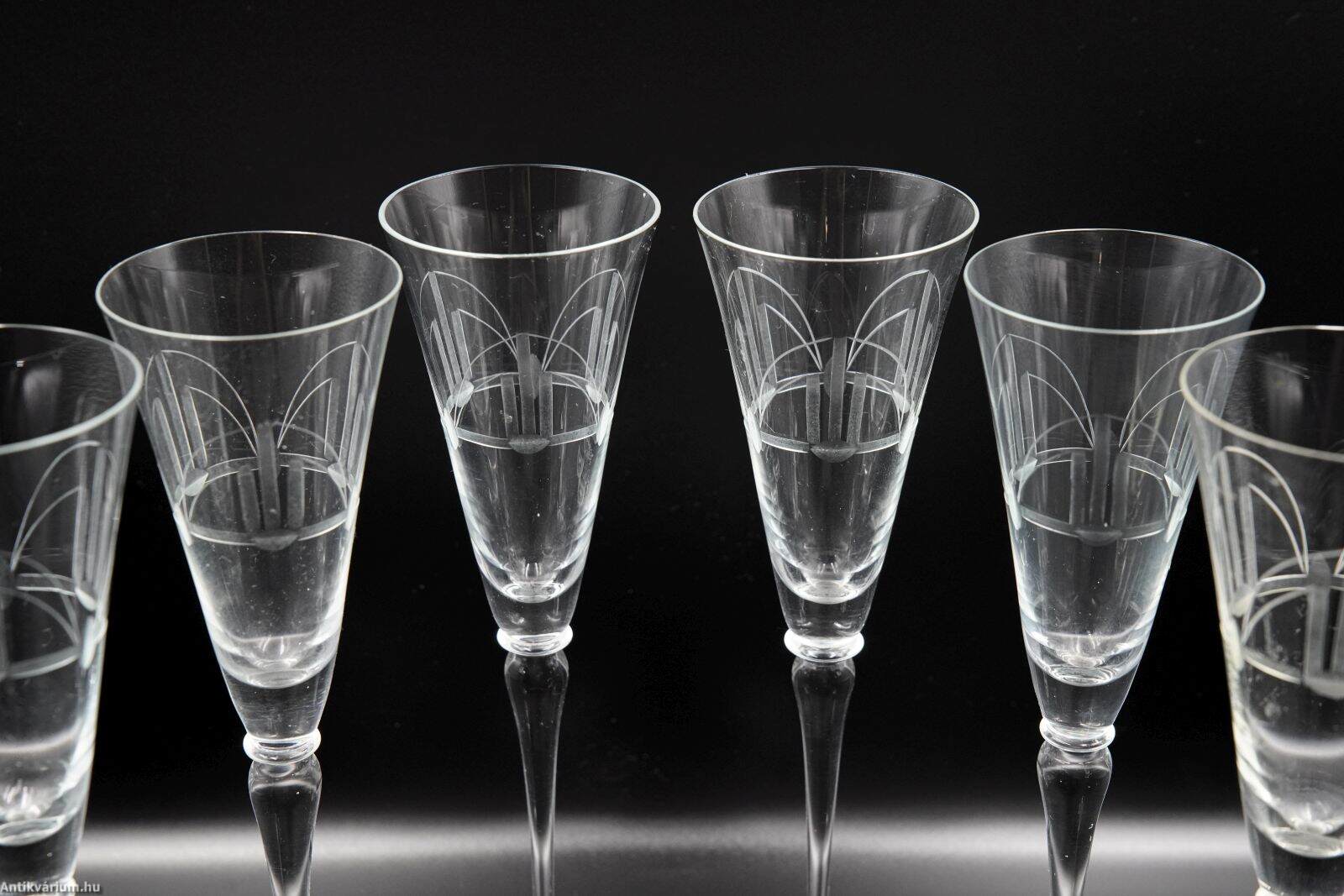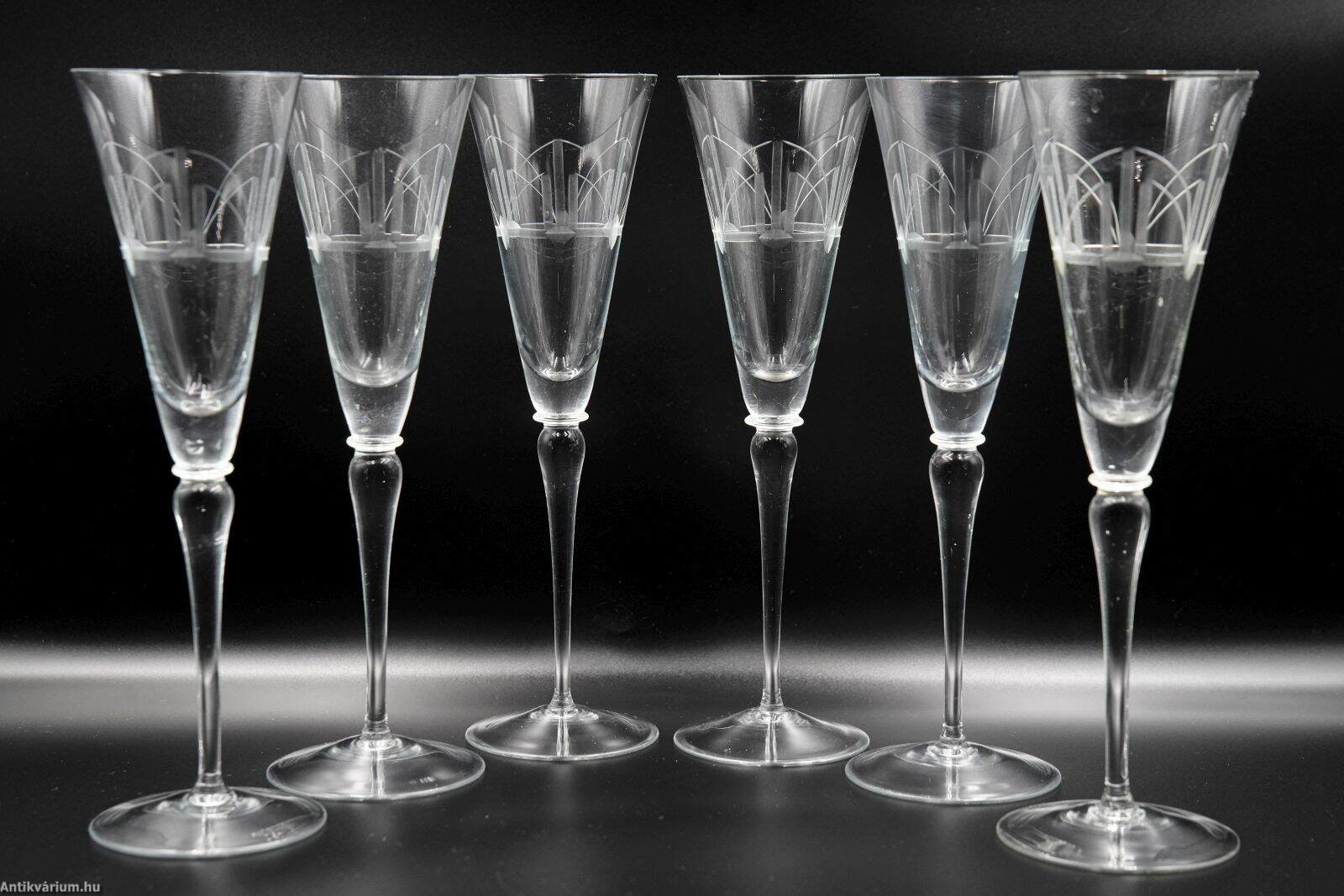 Hibátlan állapotú, fújt és kézzel formázott 6 darabos üveg pohárszett 20. század elejéről. Az art deco stílusú geometriai csiszolásokkal díszített átlátszó pezsgős pohár készlet.