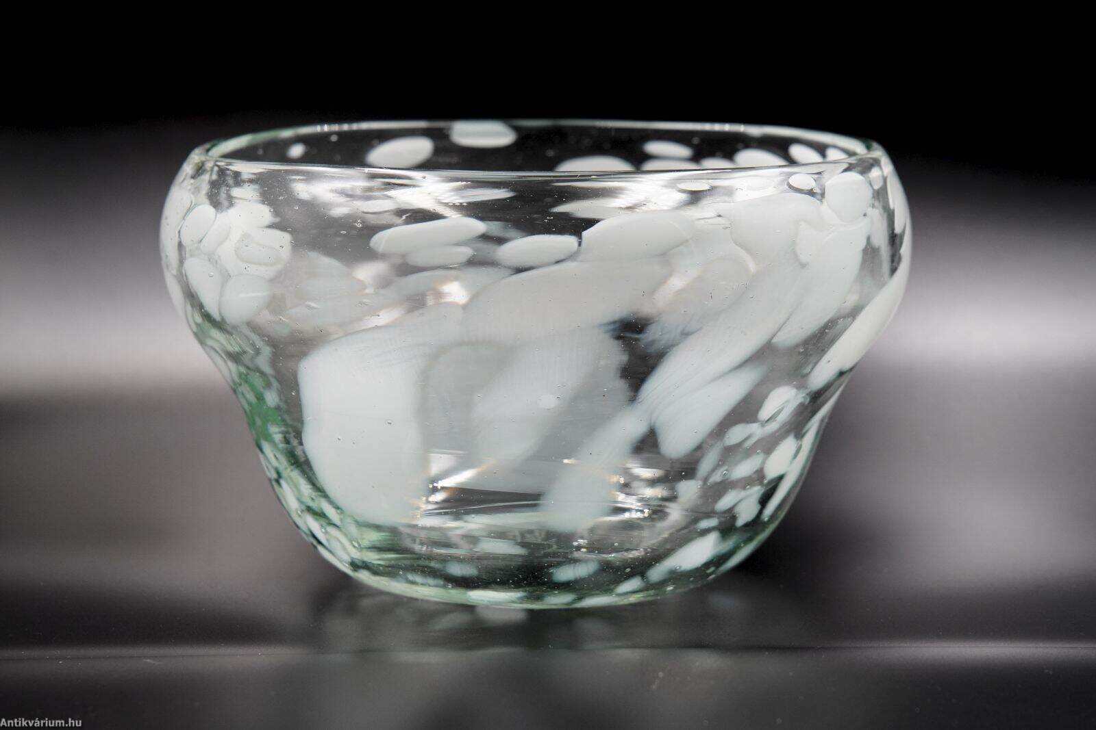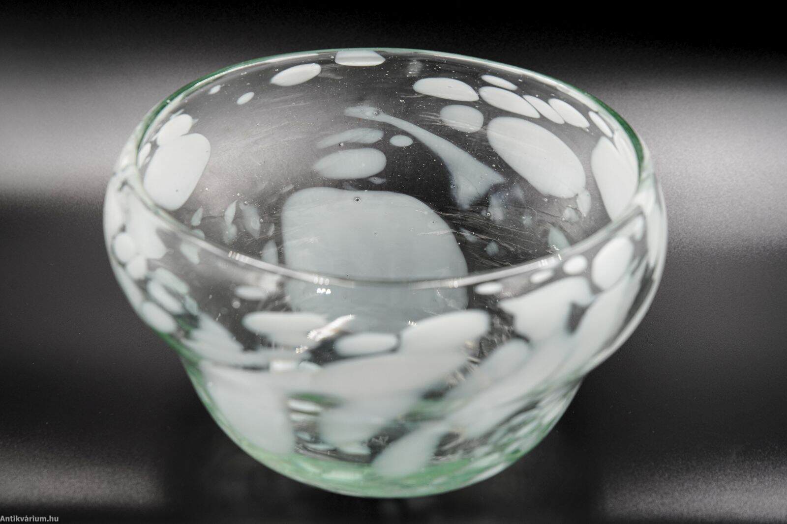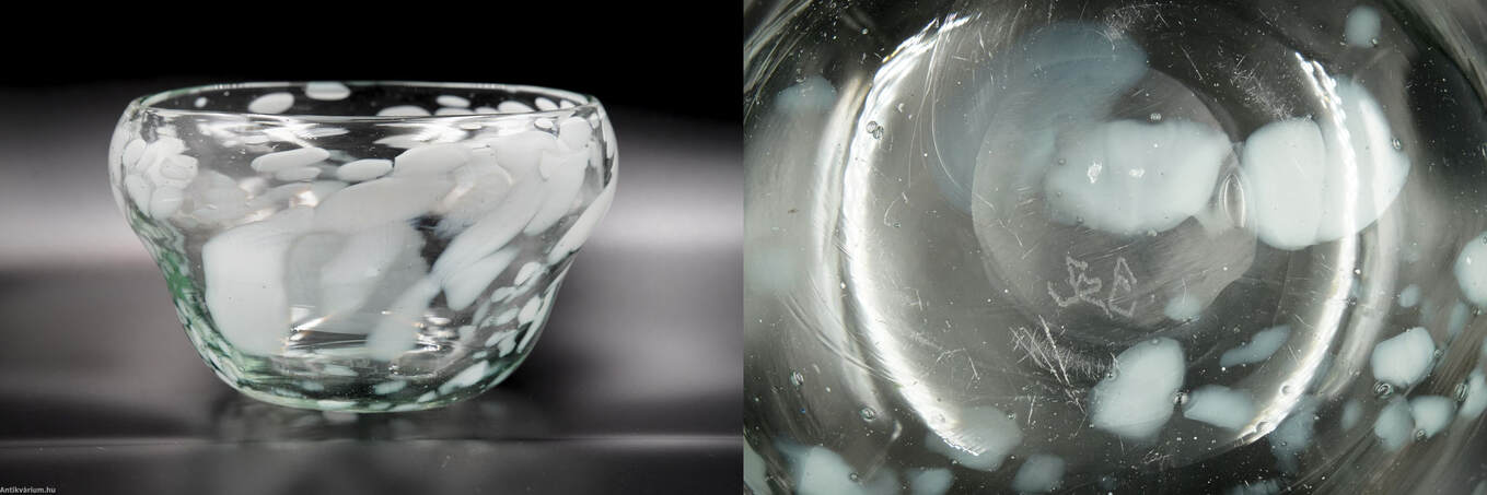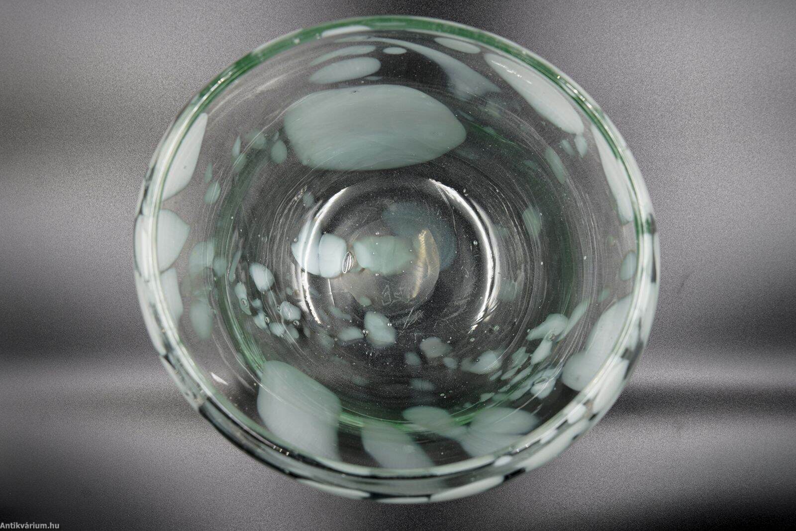 Hibátlan állapotú, fújt és kézzel szabadon formázott, szignált Szabó Erzsébet magyar üvegtervező és kivitelező iparművész alkotása. A pontil (a fújás helye) körkörösen kicsiszolva. Átlátszó, halványzöld formában vidám módon jelennek meg a fehér színű, szabálytalan elrendezésű üvegbetétek. Szabó Erzsébet nevéhez fűződik az ún. “hutakész” szabadkézi megmunkálás, akit 1960-ban Munkácsy-díjjal tüntették ki, 1984-ben pedig a Római Magyar Akadémia-ösztöndíjasa volt. Érdemes művész a magyar stúdióüveg mozgalom képviselője, a kortárs üvegművészet 1955-től alkotó, sokoldalú, kísérletező természetű alakja. Termékeny munkássága során dolgozott a Németországban (Düren üveggyár Peill&Putzler), a Moser üveggyárban Karlovy Varyban, Salviattinál Muranoban, de tanult Prágában is. Szabó Erzsébet munkássága sokrétű, messze túllépi a használati funkcióra koncentráló üvegtervezés határait. Az üvegművesség múltbeli hagyományait őrzi, ugyanakkor technológiai újításai, díszítő eljárásai folyamatosan meg is újítják azt. Alkotásai megtalálhatók a híres külföldi szakkollekciókban (London: British Museum, Victoria & Albert Museum; Párizs: Musée des Arts Décoratifs; Liege Musée du Verre; Düsseldorf Kunstmuseum; Prága Iparművészeti Múzeum), illetve a hazai közgyűjteményekben. (Budapesti Iparművészeti Múzeum)