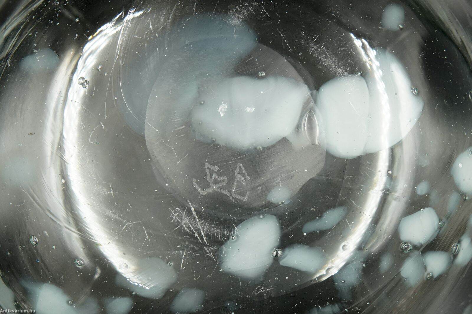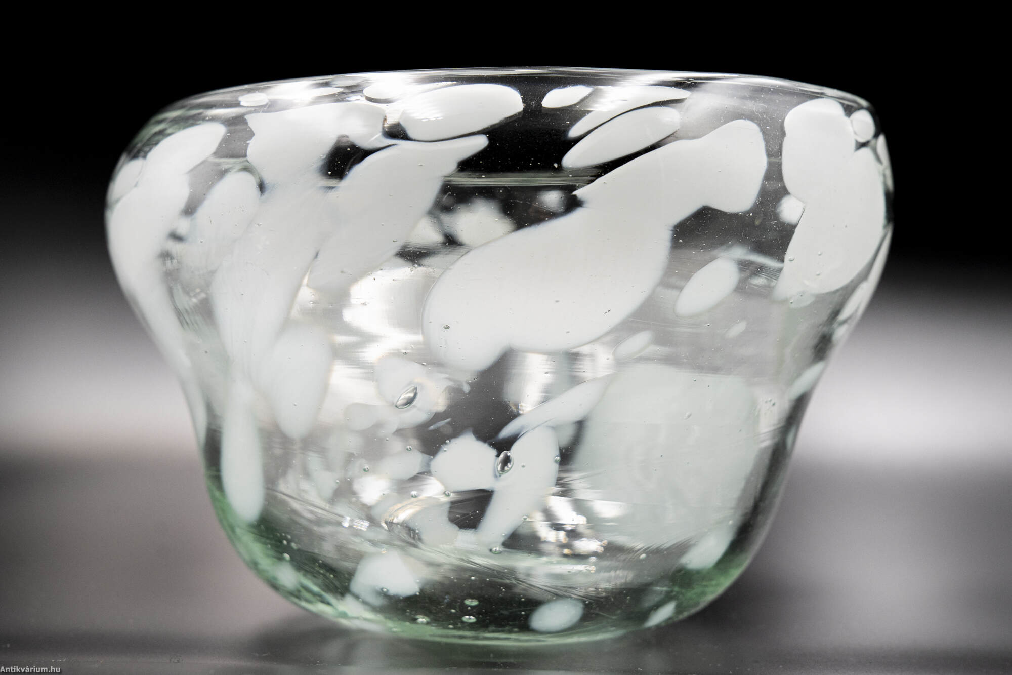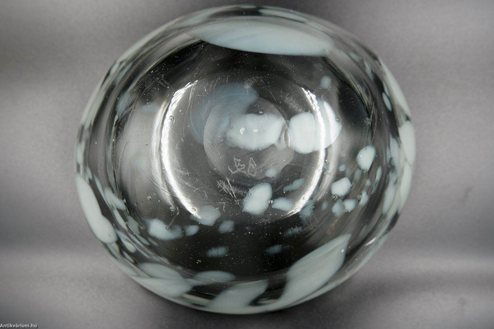 Hibátlan állapotú, fújt és kézzel szabadon formázott, szignált Szabó Erzsébet magyar üvegtervező és kivitelező iparművész alkotása. A pontil (a fújás helye) körkörösen kicsiszolva. Átlátszó, halványzöld formában vidám módon jelennek meg a fehér színű, szabálytalan elrendezésű üvegbetétek. Szabó Erzsébet nevéhez fűződik az ún. “hutakész” szabadkézi megmunkálás, akit 1960-ban Munkácsy-díjjal tüntették ki, 1984-ben pedig a Római Magyar Akadémia-ösztöndíjasa volt. Érdemes művész a magyar stúdióüveg mozgalom képviselője, a kortárs üvegművészet 1955-től alkotó, sokoldalú, kísérletező természetű alakja. Termékeny munkássága során dolgozott a Németországban (Düren üveggyár Peill&Putzler), a Moser üveggyárban Karlovy Varyban, Salviattinál Muranoban, de tanult Prágában is. Szabó Erzsébet munkássága sokrétű, messze túllépi a használati funkcióra koncentráló üvegtervezés határait. Az üvegművesség múltbeli hagyományait őrzi, ugyanakkor technológiai újításai, díszítő eljárásai folyamatosan meg is újítják azt. Alkotásai megtalálhatók a híres külföldi szakkollekciókban (London: British Museum, Victoria & Albert Museum; Párizs: Musée des Arts Décoratifs; Liege Musée du Verre; Düsseldorf Kunstmuseum; Prága Iparművészeti Múzeum), illetve a hazai közgyűjteményekben. (Budapesti Iparművészeti Múzeum)