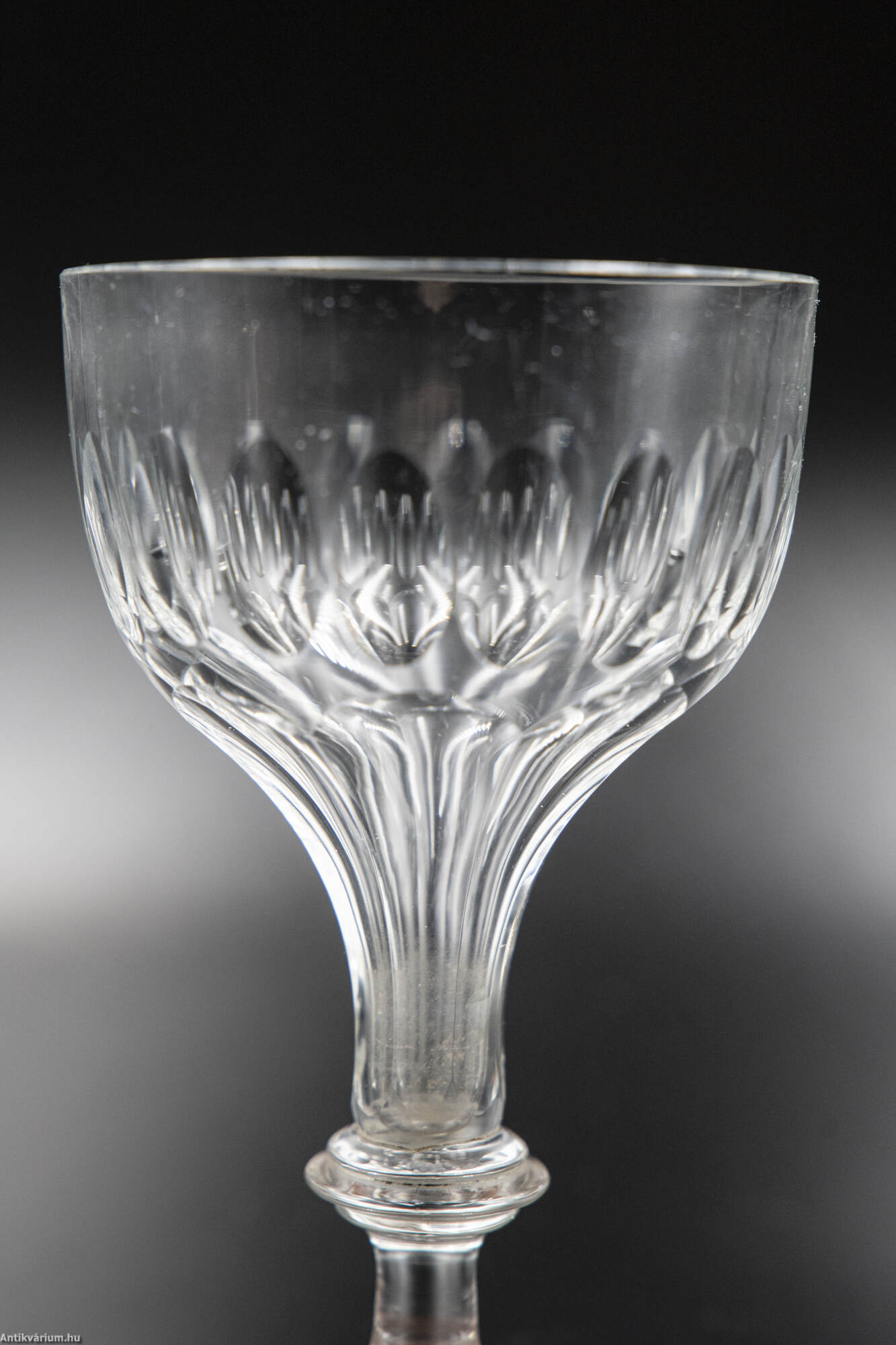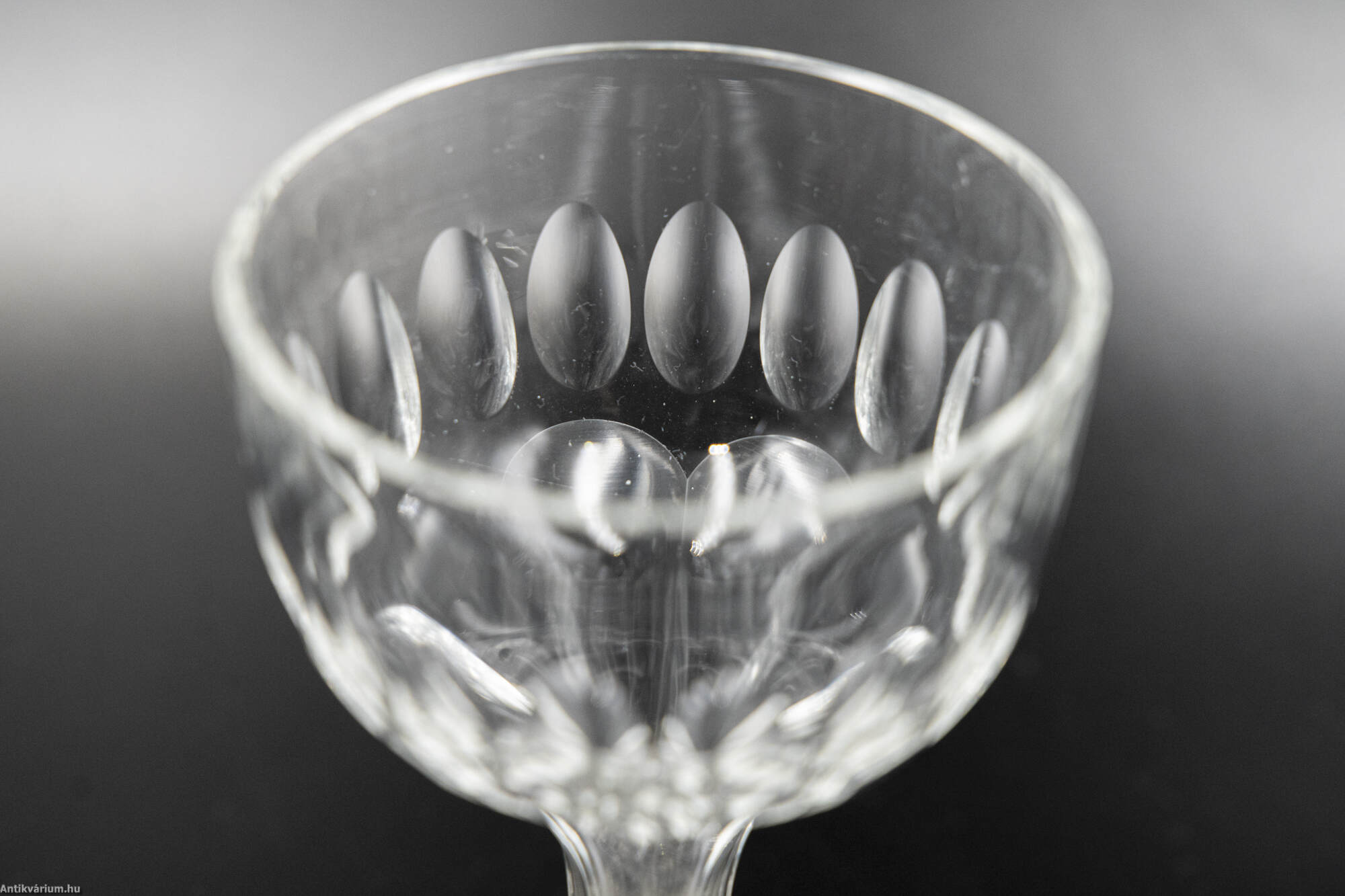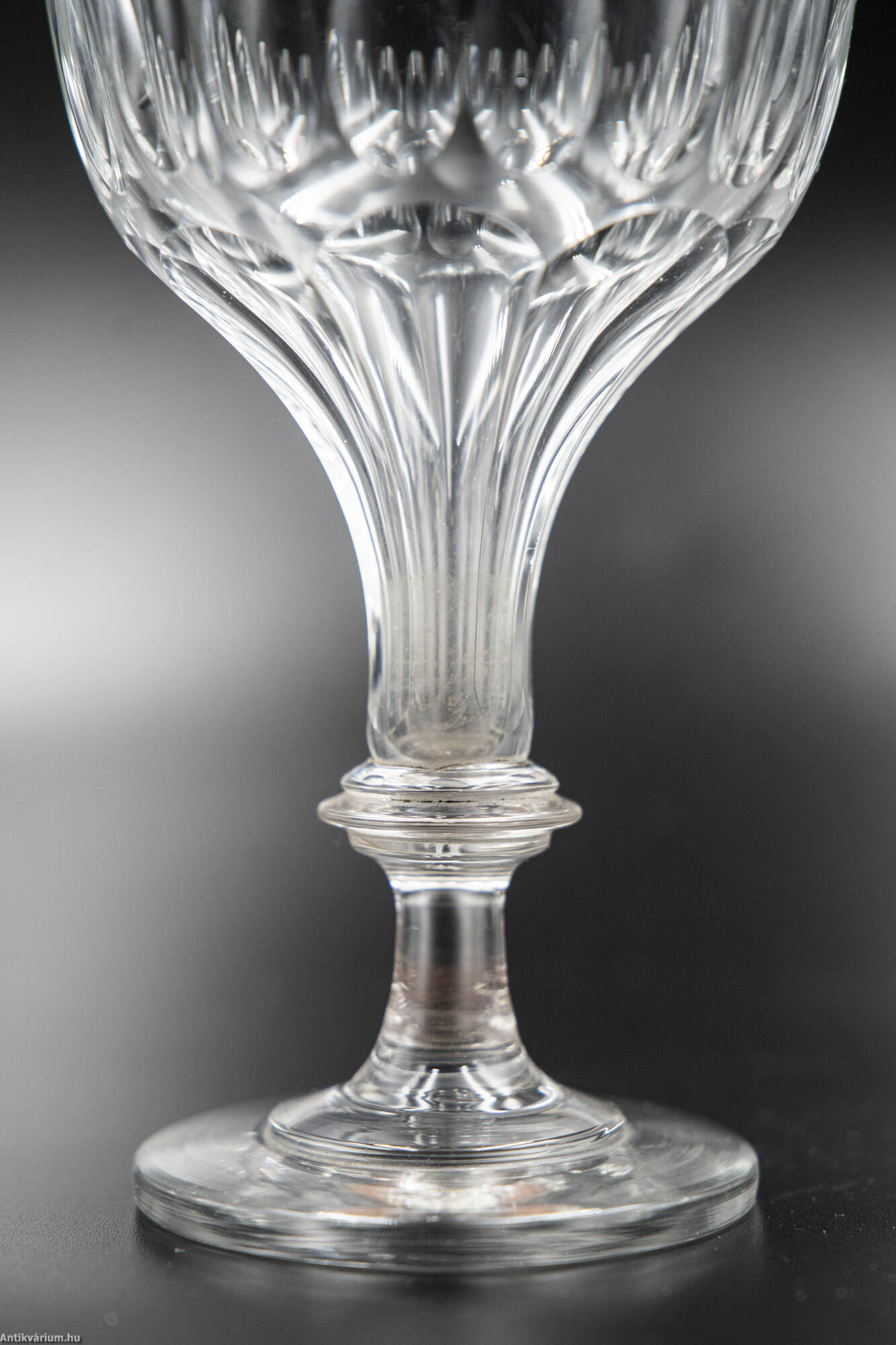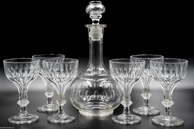 Hibátlan állapotú, fújt és kézzel formázott 7 darabból álló italos pohár készlet palackkal a 19. század második feléből. A palack és a poharak talpán a fújás helye kicsiszolt. A poharakat körkörösen díszítő cseppformájú kézzel készült csiszolási minta a palack felületén is megjelenik.