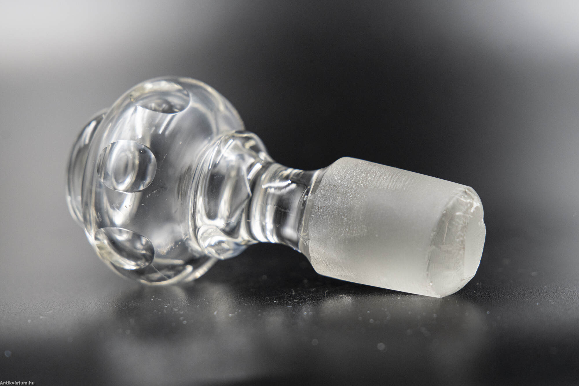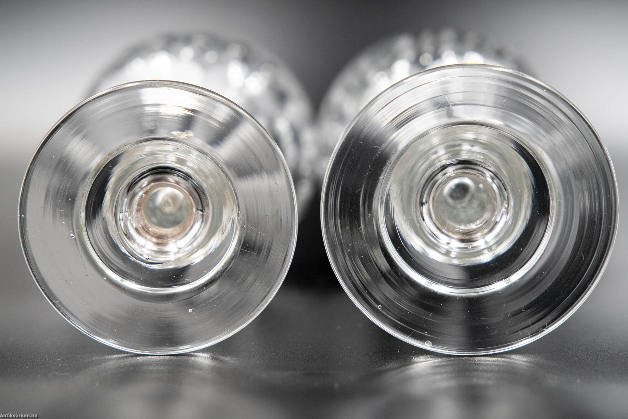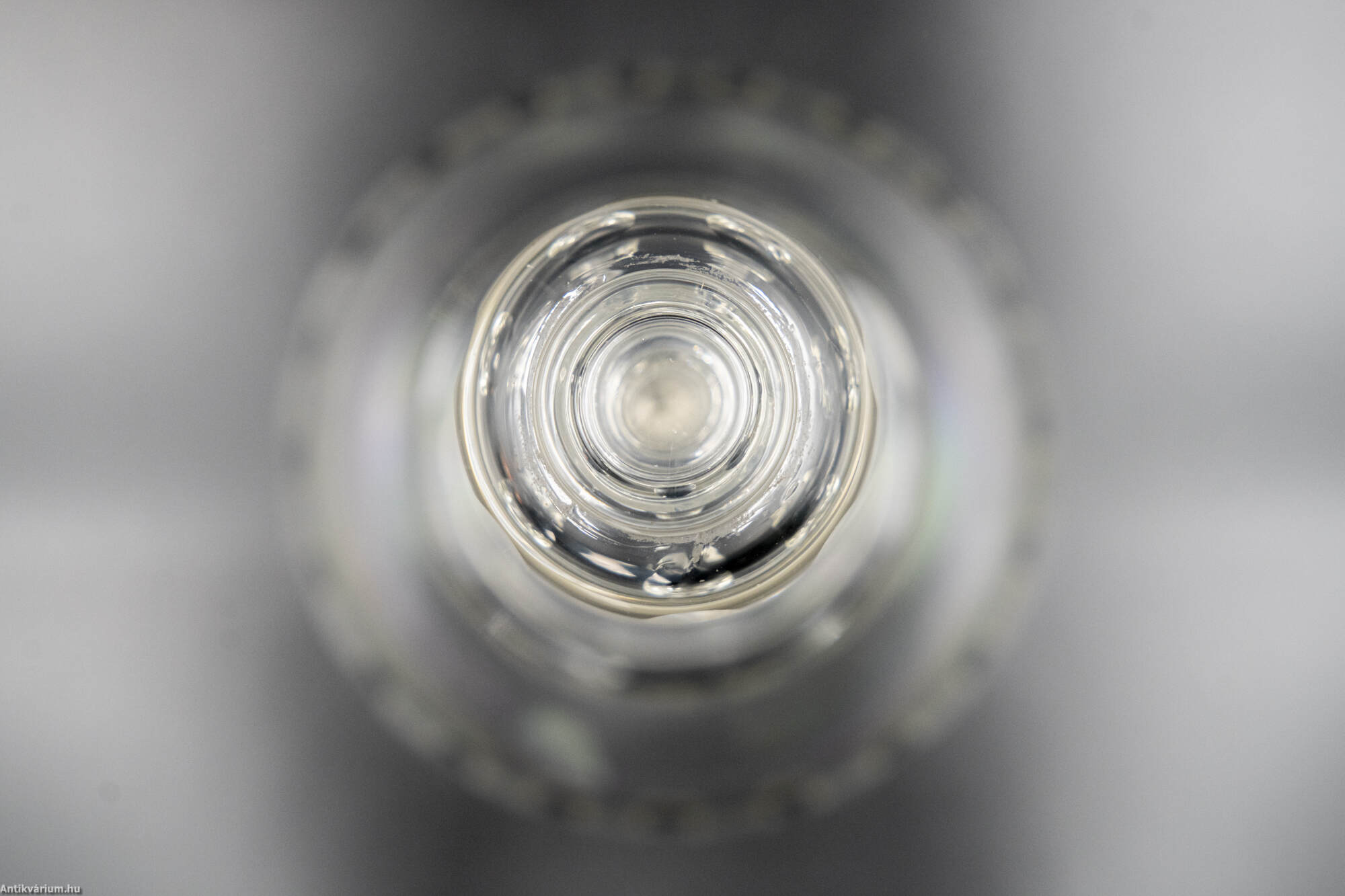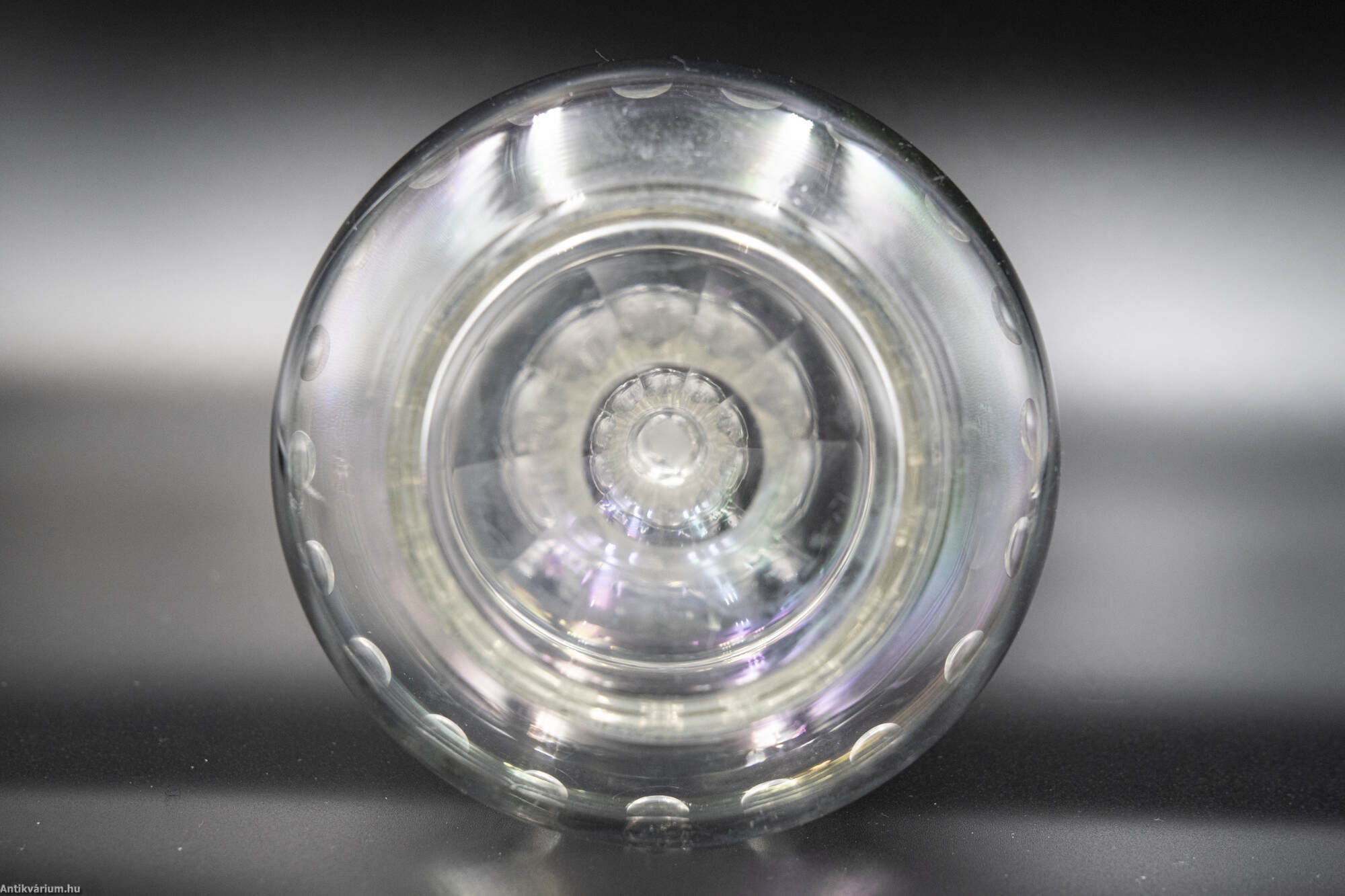 Hibátlan állapotú, fújt és kézzel formázott 7 darabból álló italos pohár készlet palackkal a 19. század második feléből. A palack és a poharak talpán a fújás helye kicsiszolt. A poharakat körkörösen díszítő cseppformájú kézzel készült csiszolási minta a palack felületén is megjelenik.