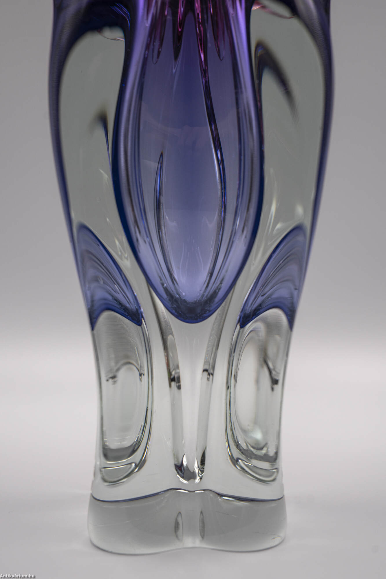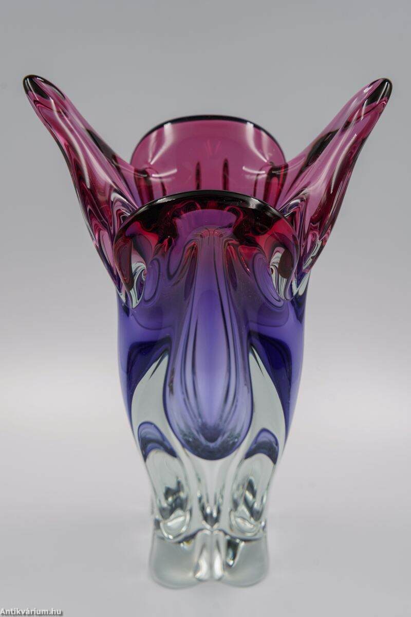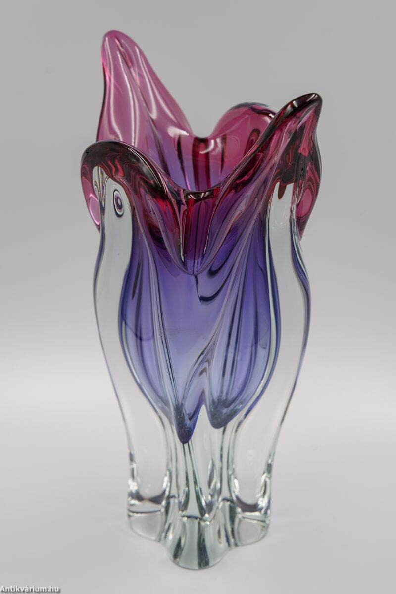 Hibátlan állapotú, Prof. Josef Hospodka által tervezett Sommerso üveg váza. Kézzel fújt és formázott, vastag üvegrétegében átlátszó, lila és ciklámen színezéssel. Felső része négyosztásos, kiszélesedő peremén két magasított hullámminta díszítéssel. Talpa simára csiszolva. Sommerso technikával készült, amely eljárás során a fújt üvegtárgyak több réteget kapnak. Ezek a rétegek általában különböző színűek. Ezt a hatást úgy érik el, hogy a tárgyat többször mártják különböző színű olvadt üvegbe. Ez nagyon vastag és nehéz üvegtárgyakat eredményez. A Sommerso szó szerint azt jelenti, hogy „elmerült”. A technika értelmet ad a névnek. A Chřibská üveggyárat, teljes nevén Sklarna Chřibská 1414-ben alapították Chřibská városában, amely eredetileg Csehországhoz tartozott, majd 1919-ben Csehszlovákia része lett. A gyárat bezárásáig Európa legrégebbi üveggyáraként ismerték. Josef Hospodka az 1950-es években csatlakozott a gyárhoz, eleinte a chřibskái üvegipari iskolát vezette, majd 1958-1970 között a Chřibská vezető tervezője lett egészen 1989-ben bekövetkezett haláláig. Ebben az időszakban számos organikus, szoborszerű fúvott üvegtervet készített, amelyek nagyon népszerűnek bizonyultak.