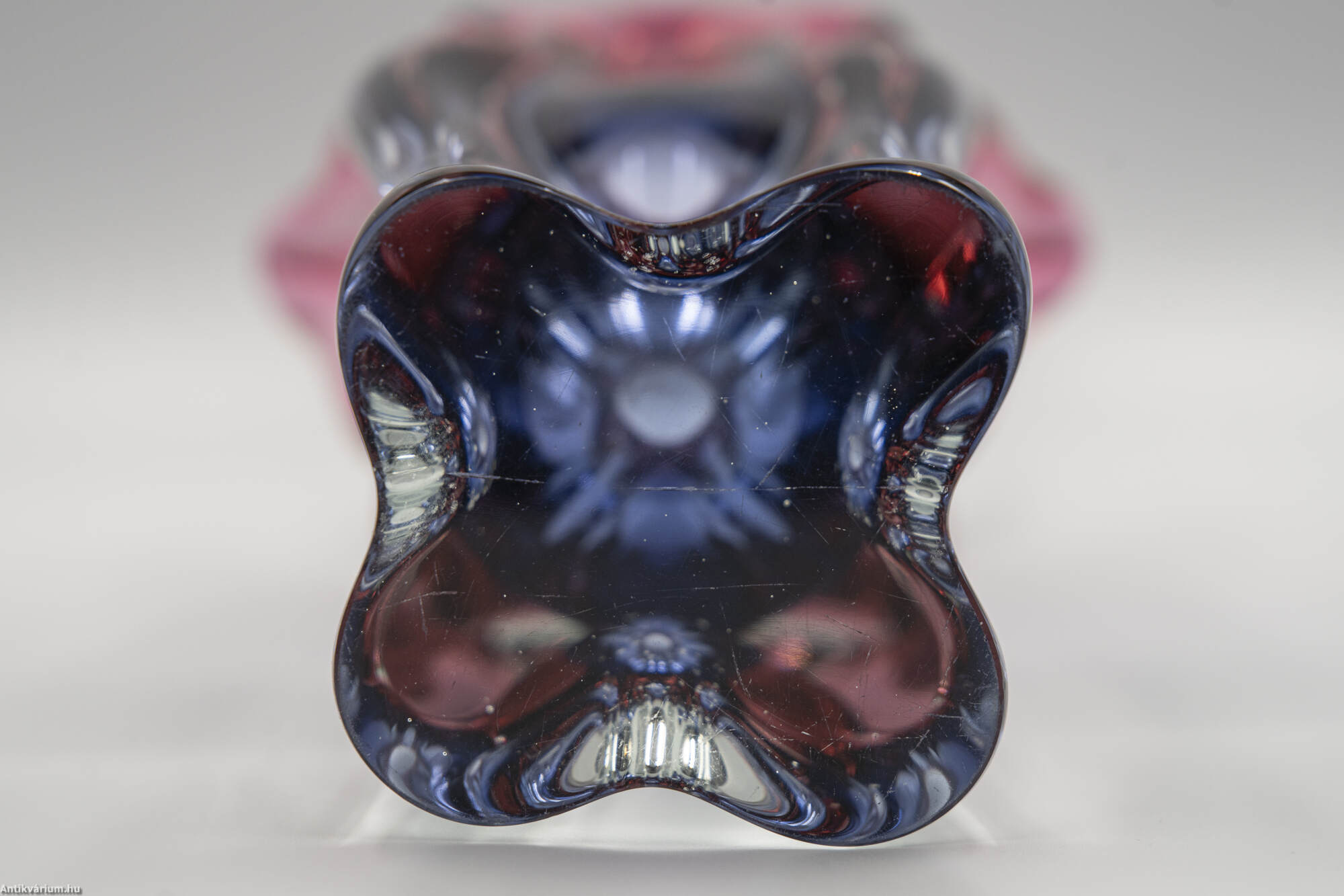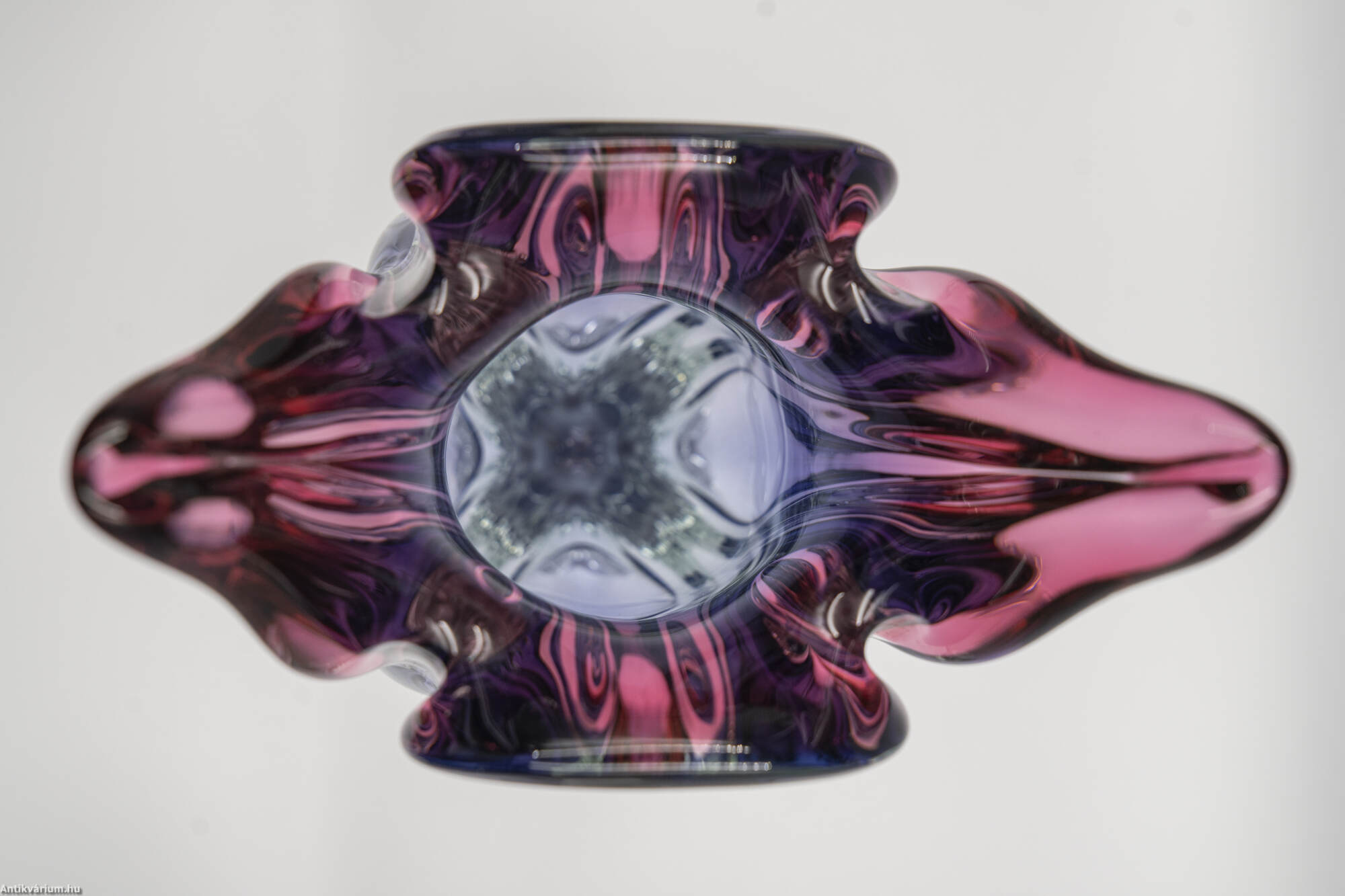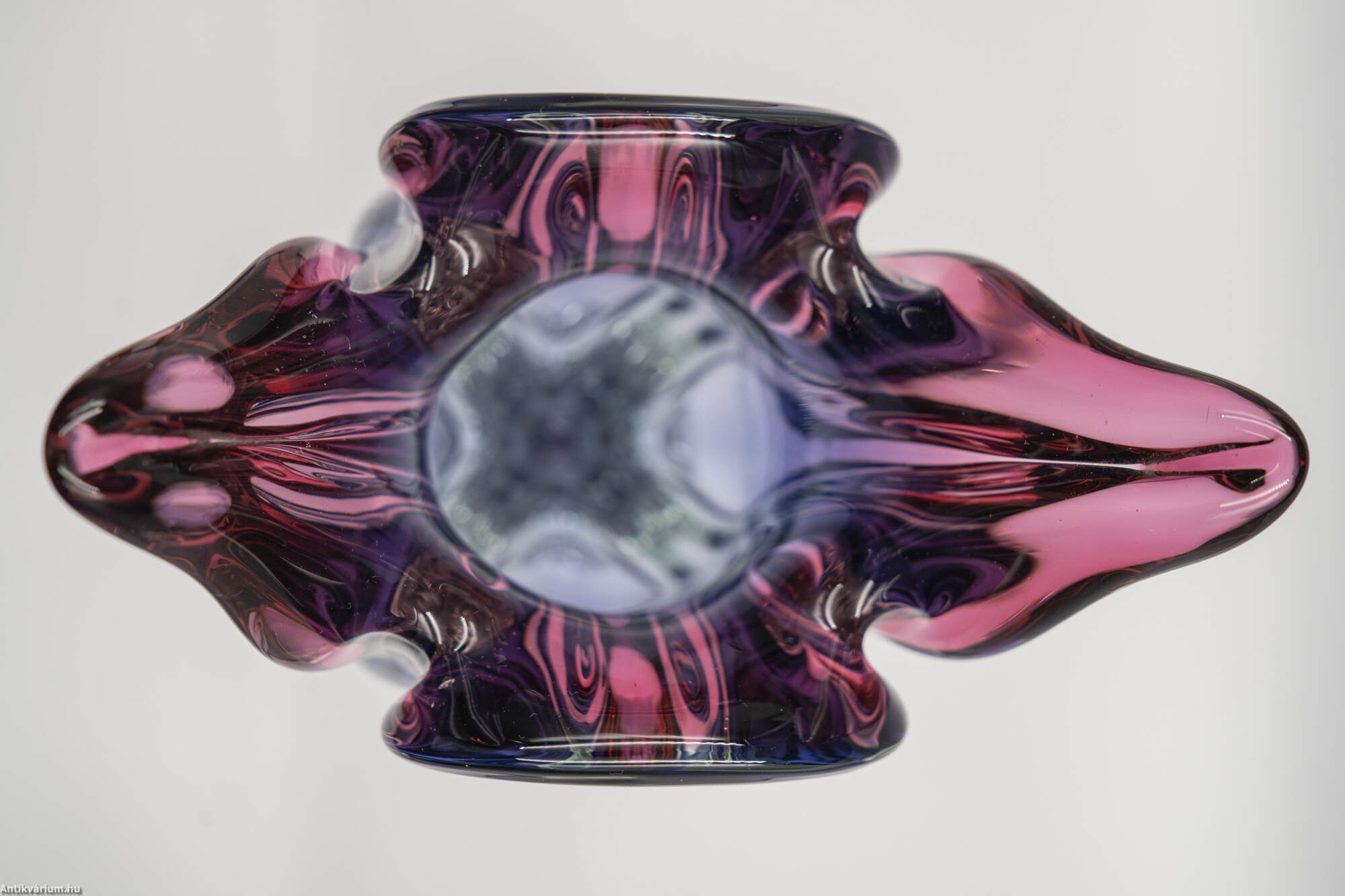 Hibátlan állapotú, Prof. Josef Hospodka által tervezett Sommerso üveg váza. Kézzel fújt és formázott, vastag üvegrétegében átlátszó, lila és ciklámen színezéssel. Felső része négyosztásos, kiszélesedő peremén két magasított hullámminta díszítéssel. Talpa simára csiszolva. Sommerso technikával készült, amely eljárás során a fújt üvegtárgyak több réteget kapnak. Ezek a rétegek általában különböző színűek. Ezt a hatást úgy érik el, hogy a tárgyat többször mártják különböző színű olvadt üvegbe. Ez nagyon vastag és nehéz üvegtárgyakat eredményez. A Sommerso szó szerint azt jelenti, hogy „elmerült”. A technika értelmet ad a névnek. A Chřibská üveggyárat, teljes nevén Sklarna Chřibská 1414-ben alapították Chřibská városában, amely eredetileg Csehországhoz tartozott, majd 1919-ben Csehszlovákia része lett. A gyárat bezárásáig Európa legrégebbi üveggyáraként ismerték. Josef Hospodka az 1950-es években csatlakozott a gyárhoz, eleinte a chřibskái üvegipari iskolát vezette, majd 1958-1970 között a Chřibská vezető tervezője lett egészen 1989-ben bekövetkezett haláláig. Ebben az időszakban számos organikus, szoborszerű fúvott üvegtervet készített, amelyek nagyon népszerűnek bizonyultak.