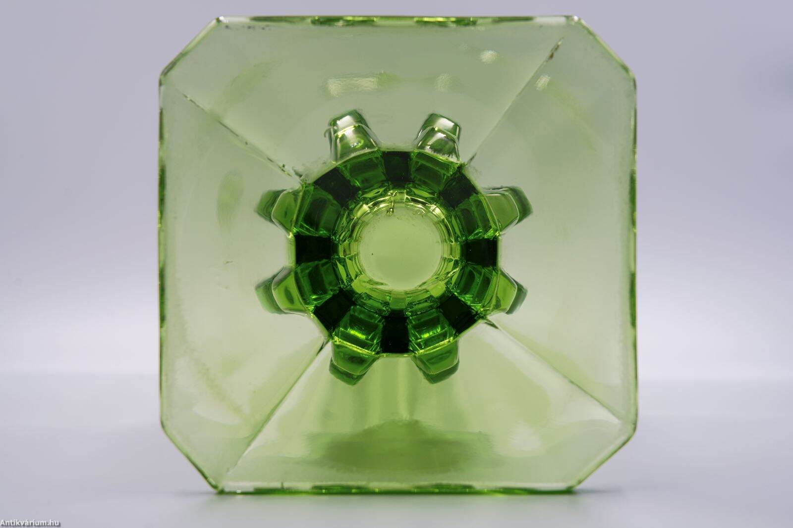 Hibátlan állapotú, formába préselt art deco stílusú zöld üveg váza az 1930-as évekből. Négyszögletes talpból kiinduló jellegzetes art deco motívumokkal díszített nagy méretű üveg váza, amelynek felső részén osztott részek láthatóak. Dekoratív méretét és formáját figyelembe véve ritkának számító műtárgy. Az üveg formába préselt megmunkálása egy bonyolult üvegtechnikai eljárás, amelynek legfontosabb része a présforma elkészítése. Ennek jellegzetes képviselői az angol és amerikai üveg dísztárgy készítő műhelyek, ahol magas színvonalú technikai tudással rendelkeztek.