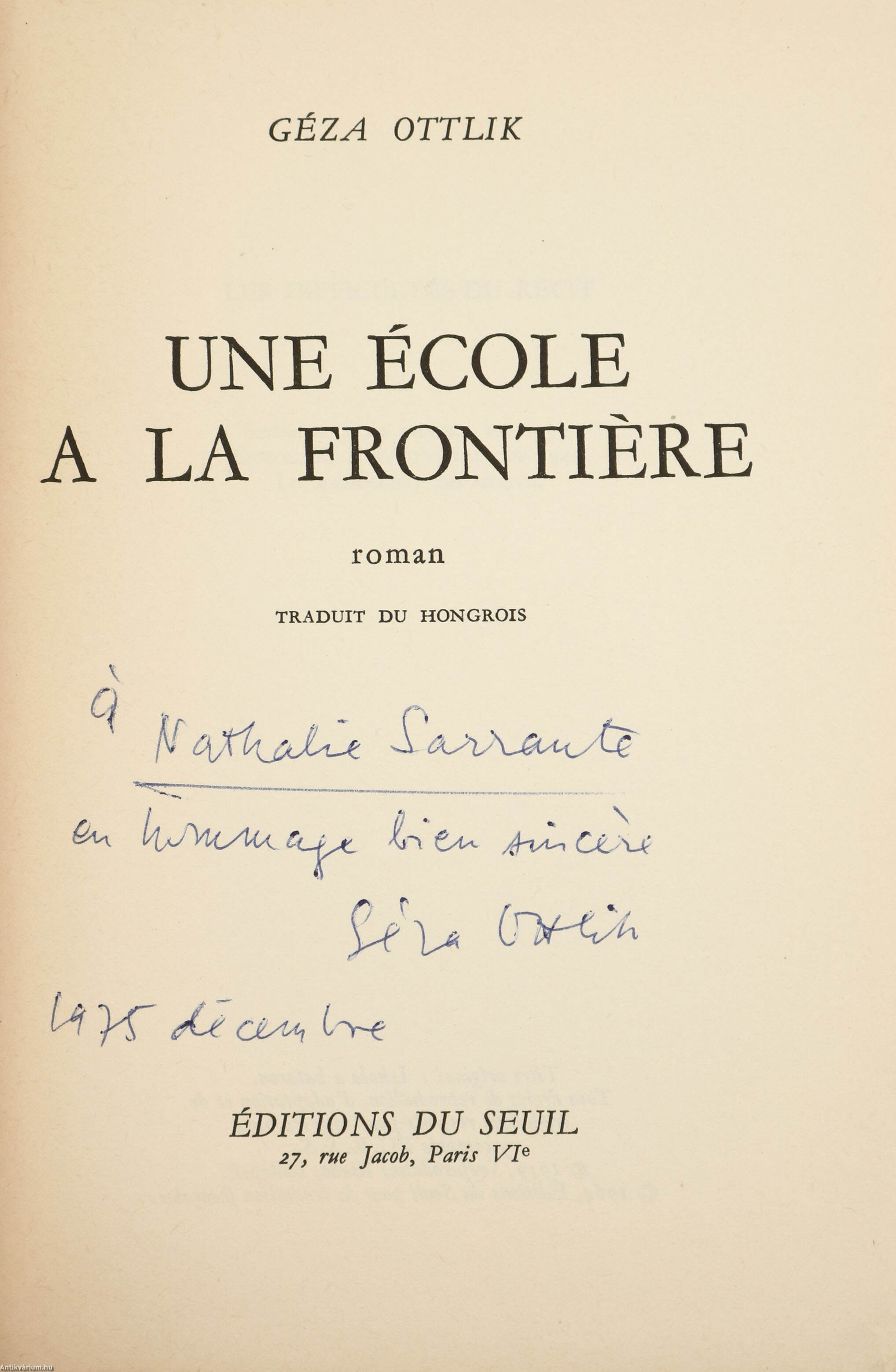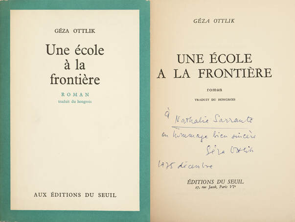 Szerző által dedikált példány. Une école á la frontiére / Iskola a határon. Írta: Ottlik Géza.
