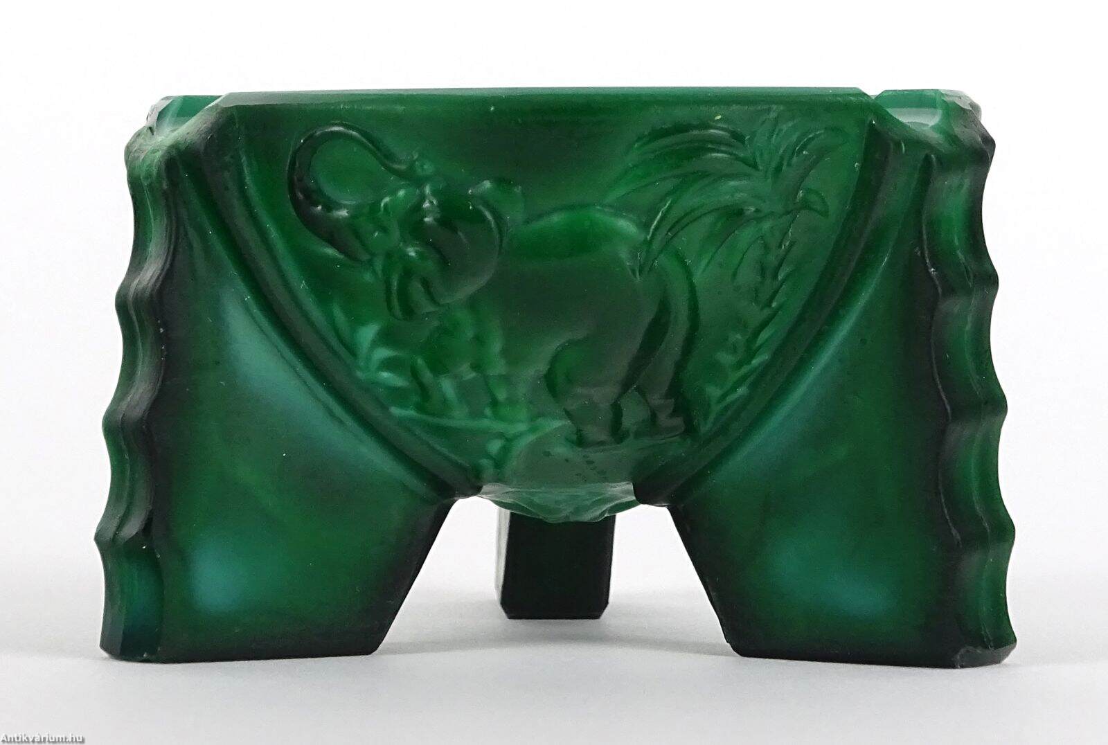 Malachit (smaragd zöld színű, matt felületű ásvány) zöld, art deco polírozott hamutál, figurális kompozícióval, a 20. század elejéről. A három, hullámos szélű lábon álló hamuzó oldalait elefánt ábrázolás díszíti. Heinrich Hoffmann (1875 – 1939) a 20. század fordulóján nyitott üvegékszereket árusító üzletet Párizsban. A gablonzi üvegkészítési tanulmányok után René Lalique művészeti irányzatának impulzusa nyomán dekoratív préselt formákra és flakonokra bővítette termékeit.
