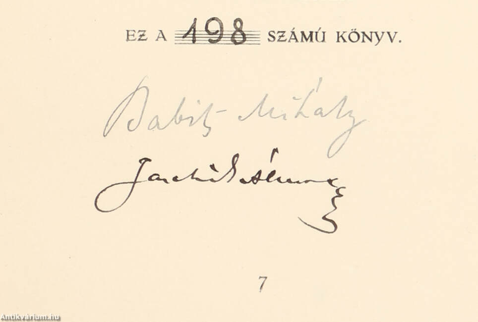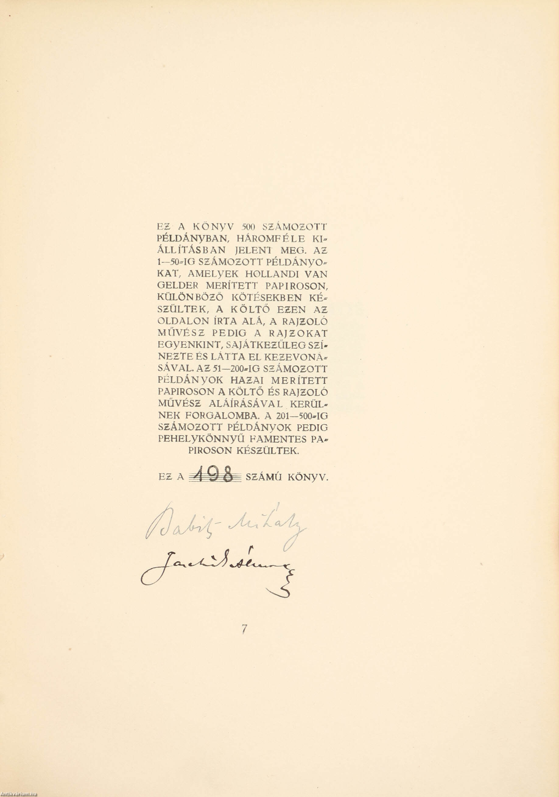 A 7. oldalon a számozás alatt a szerző, Babits Mihály és a grafikus, Jaschik Álmos tollal beírt, jól olvasható aláírása látható.