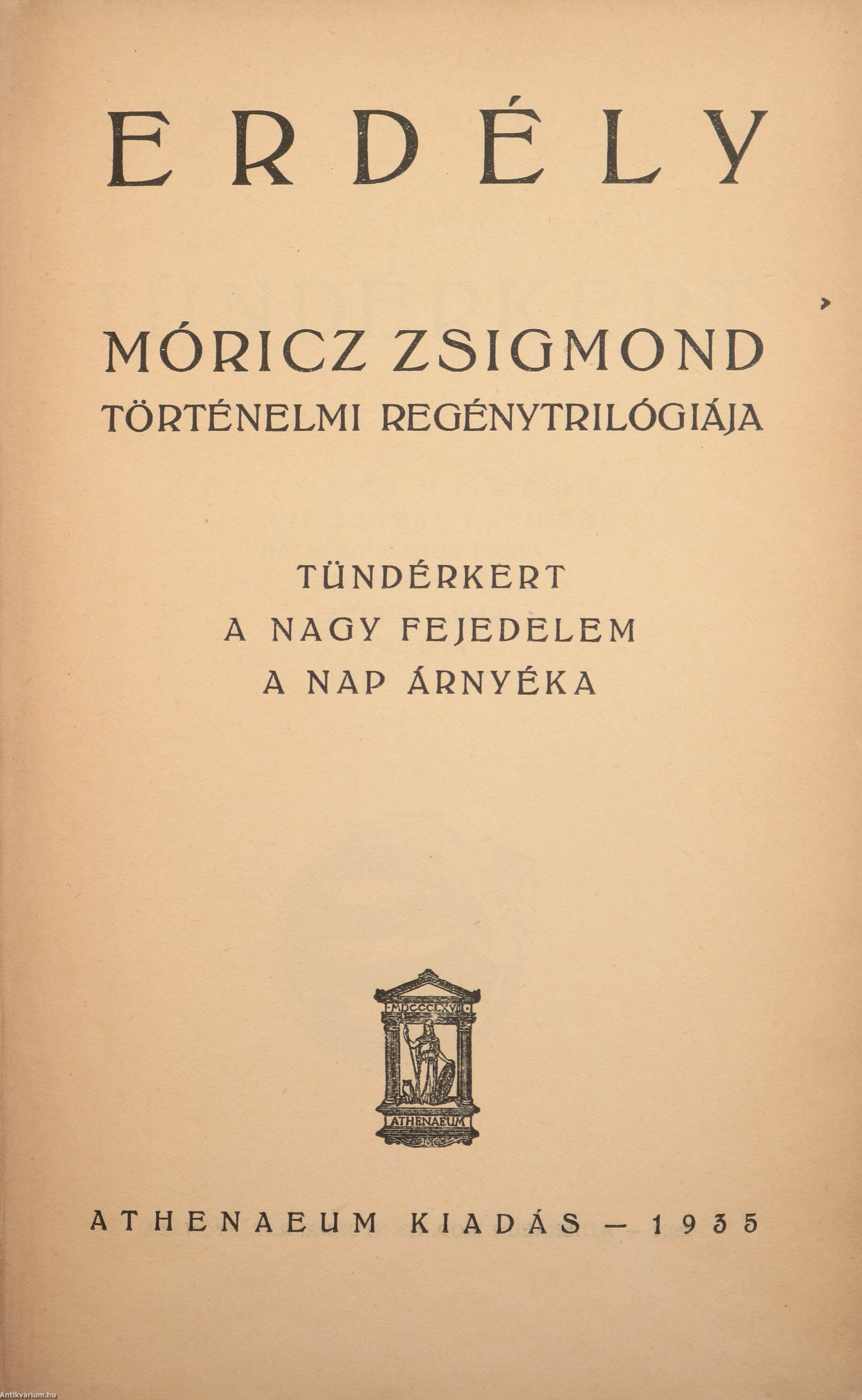 I. kötet: Tündérkert.Történelmi regény a XVII. század elejéről. Báthory Gábor erdélyi fejedelemsége. Bethlen Gábor ifjúkora. A címlapon a Báthory-család sárkányfogas címere látható. II. kötet: A nagy fejedelem. A Tündérkert virágbaborul. Bethlen Gábor dicsősége. Zsuzsanna fejedelem. Asszony szenvedése eljő. A címlapon az iktári Bethlen-család címere látható. III. kötet: A nap árnyéka. Az asszonyi állat az ő urának dicsőségében láthatatlan lesz. - Minél jobb s tökéletesebb, annál jobban s tökéletesebben: Íme a regény. A címlapon a Károlyi-család régi címere látható.