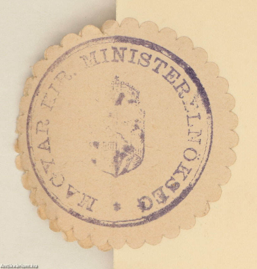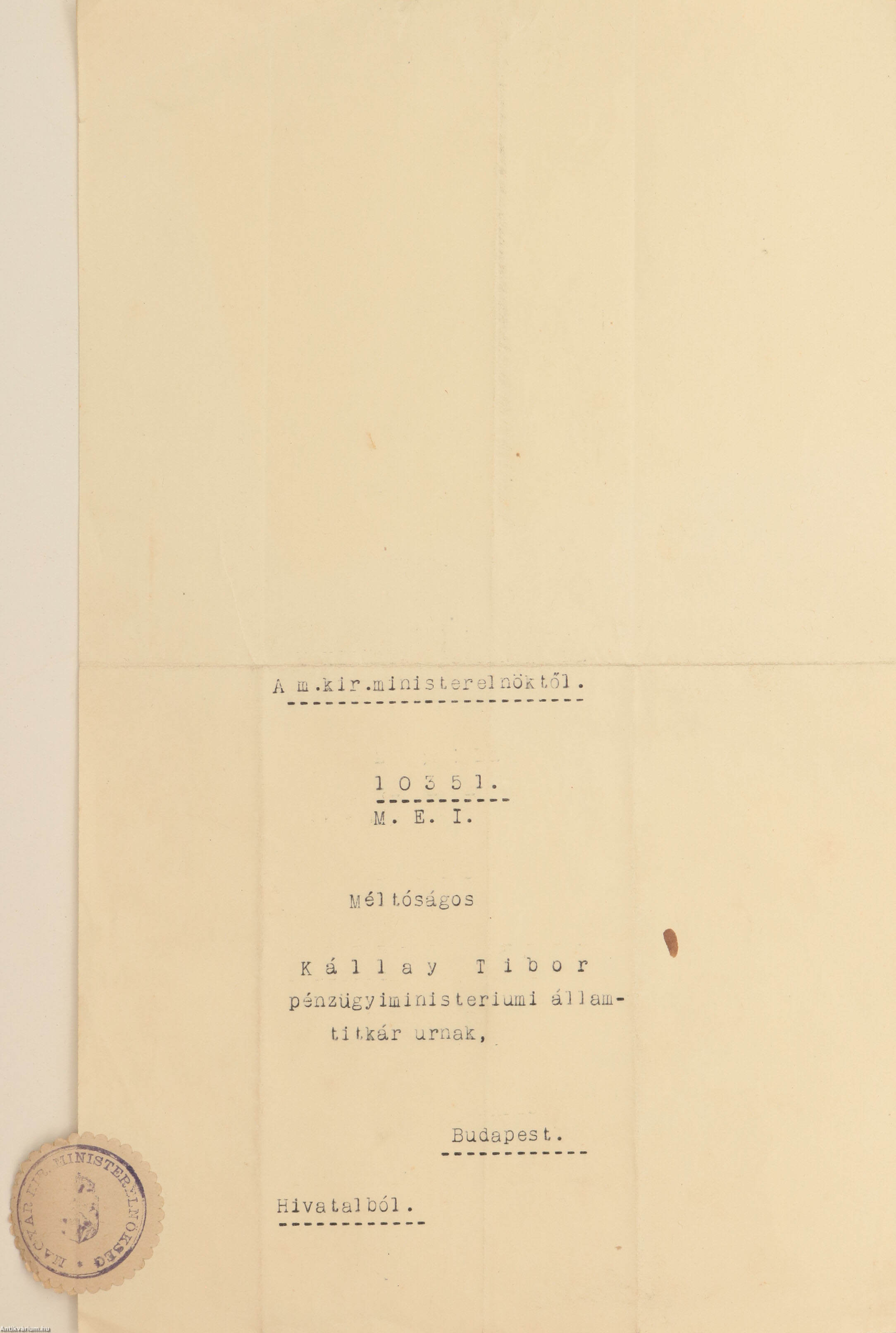 Hajtogatott, "A Magy. Kir. Ministerelnökség" szárazbélyegzős fejléccel, géppel írt címzéssel, valamint a Magyar Kir. Ministerelnökség pecsétjével (ragasztott címkén) ellátott, 10351 M. E. I. iktatószámmal rendelkező, belső papírra gépelt levél.