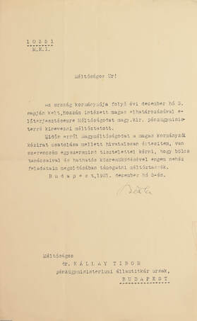 Az ország kormányzója folyó évi december hó 3. napján kelt, hozzám intézett magas elhatározásával előterjesztésemre Méltóságodat magy. kir. pénzügyministerré kinevezni méltóztatott.