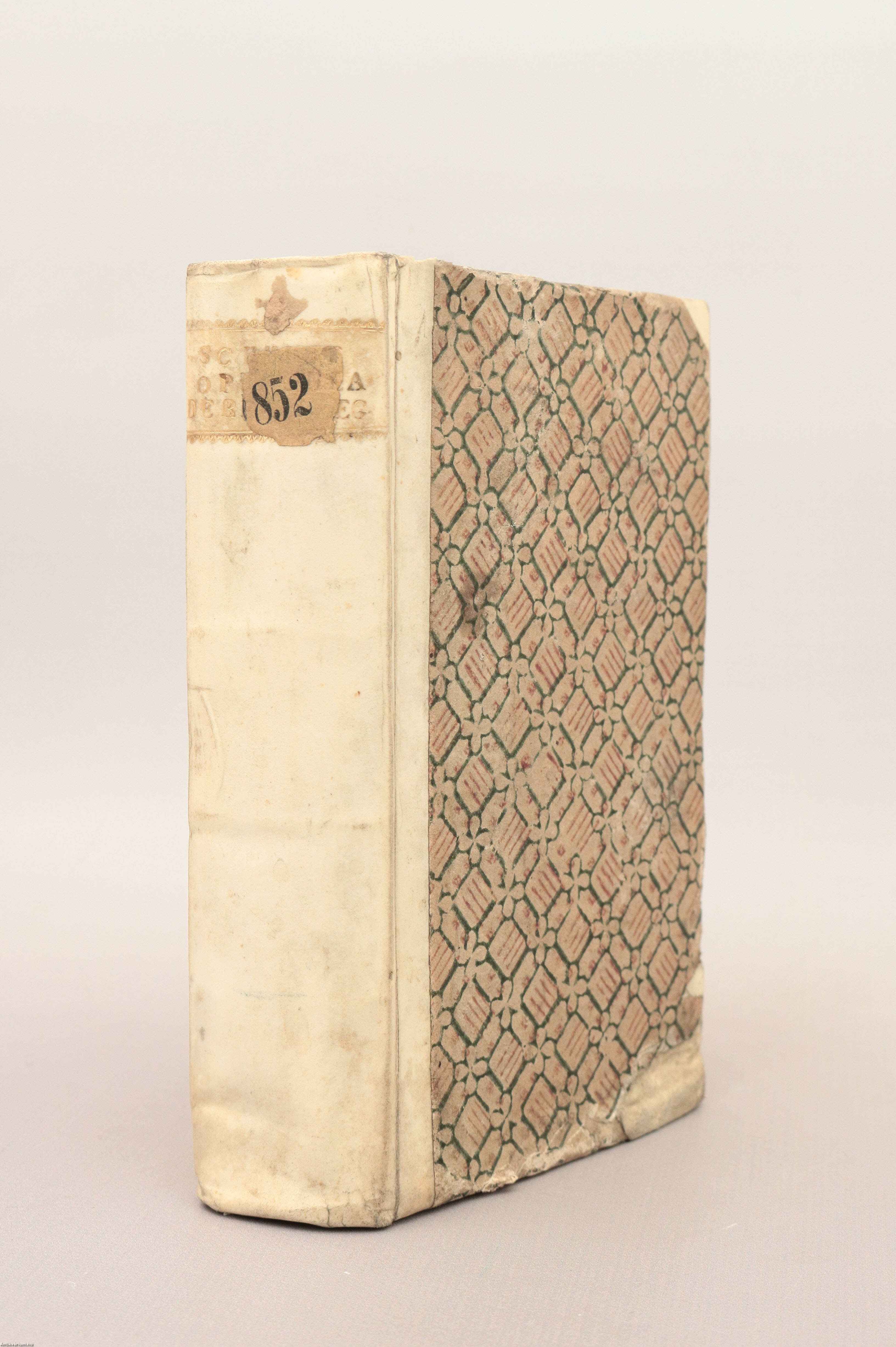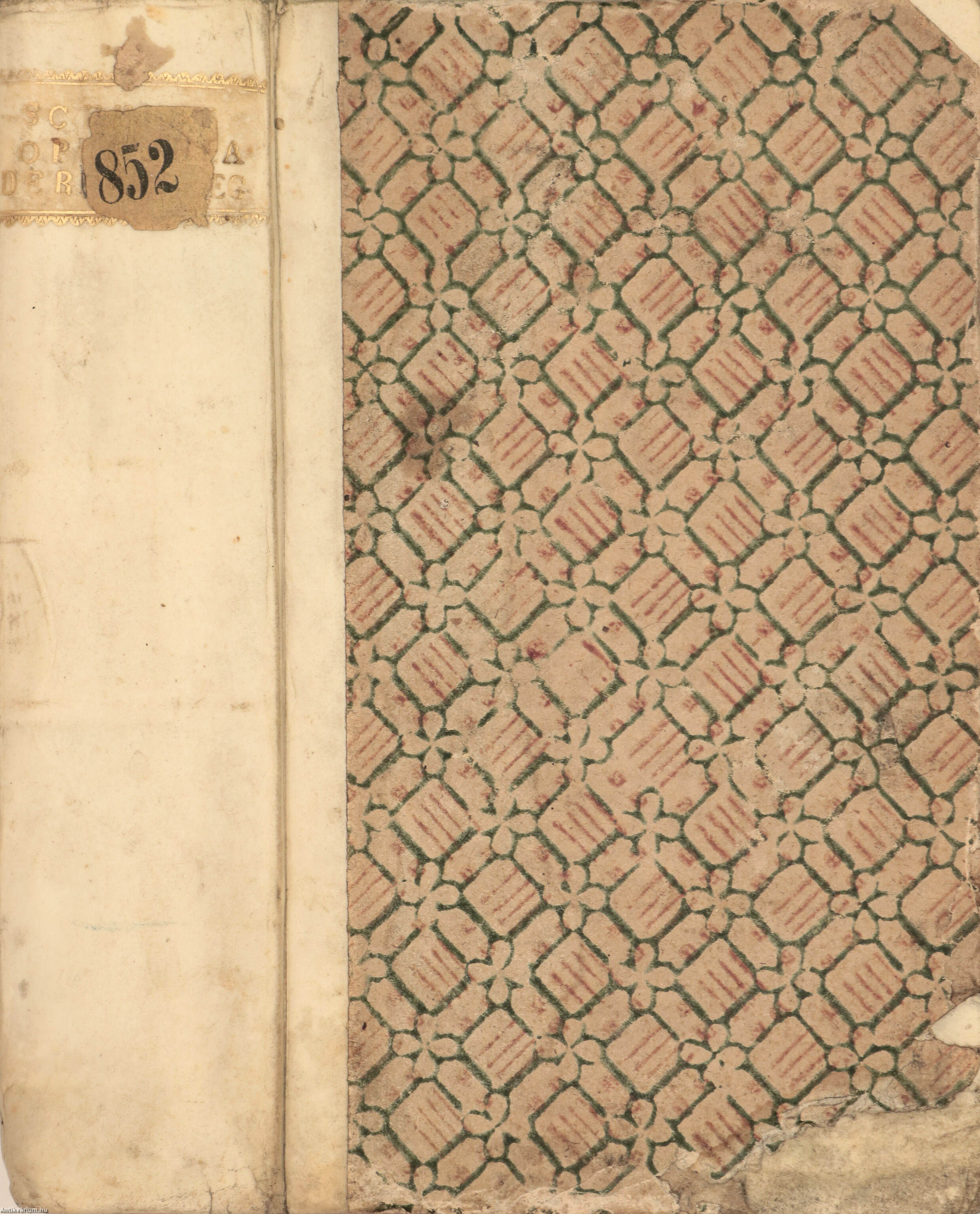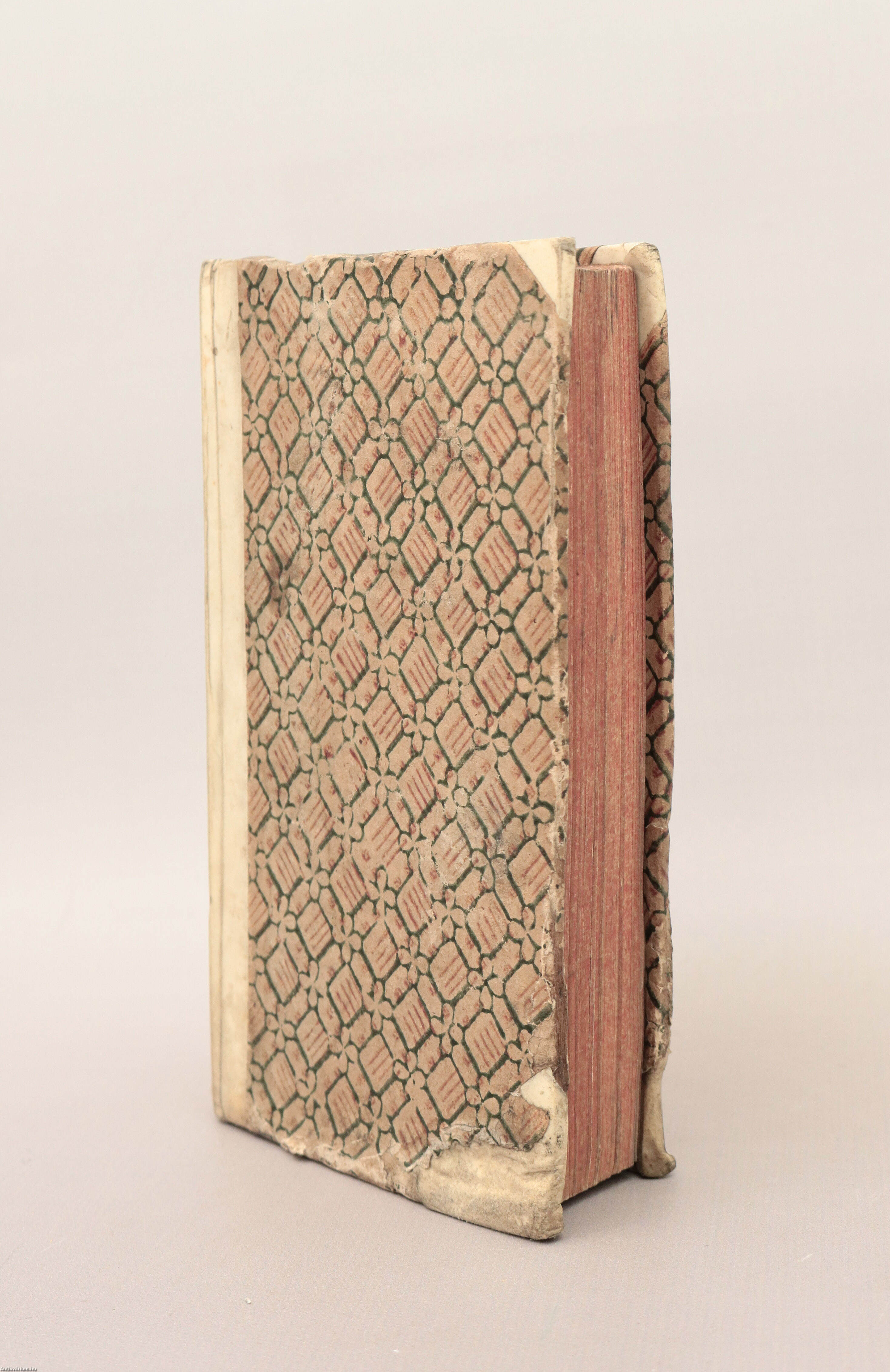 Korabeli félpergamen kötésben lévő példány feliratozatlan, színes, mintás, az alsó sarkain sérült címfedéllel és hátlappal, aranyozott feliratozású, számjelzéses címkét tartalmazó könyvgerinccel, színezett lapélekkel, tiszta belívekkel, hiánytalan állapotban.