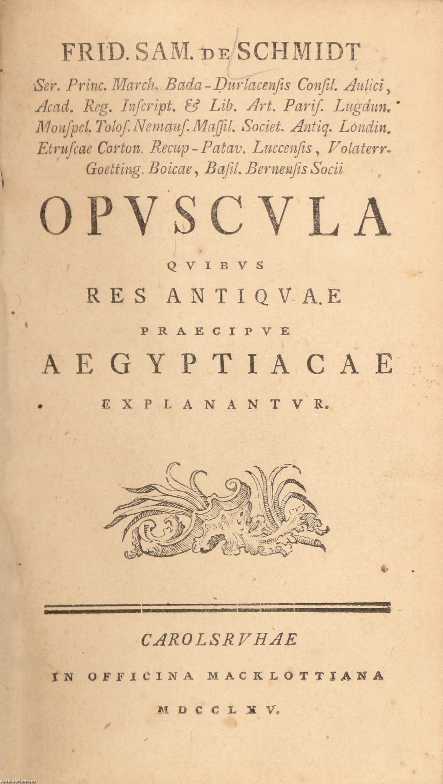 Opuscula quibus res antiquae praecipue Aegyptiacae explanantur. / Értekezések, amelyekben az antik világ dolgai, különösen az egyiptomiak kerülnek kifejtésre. Írta: Friedrich Samuel Schmidt.
