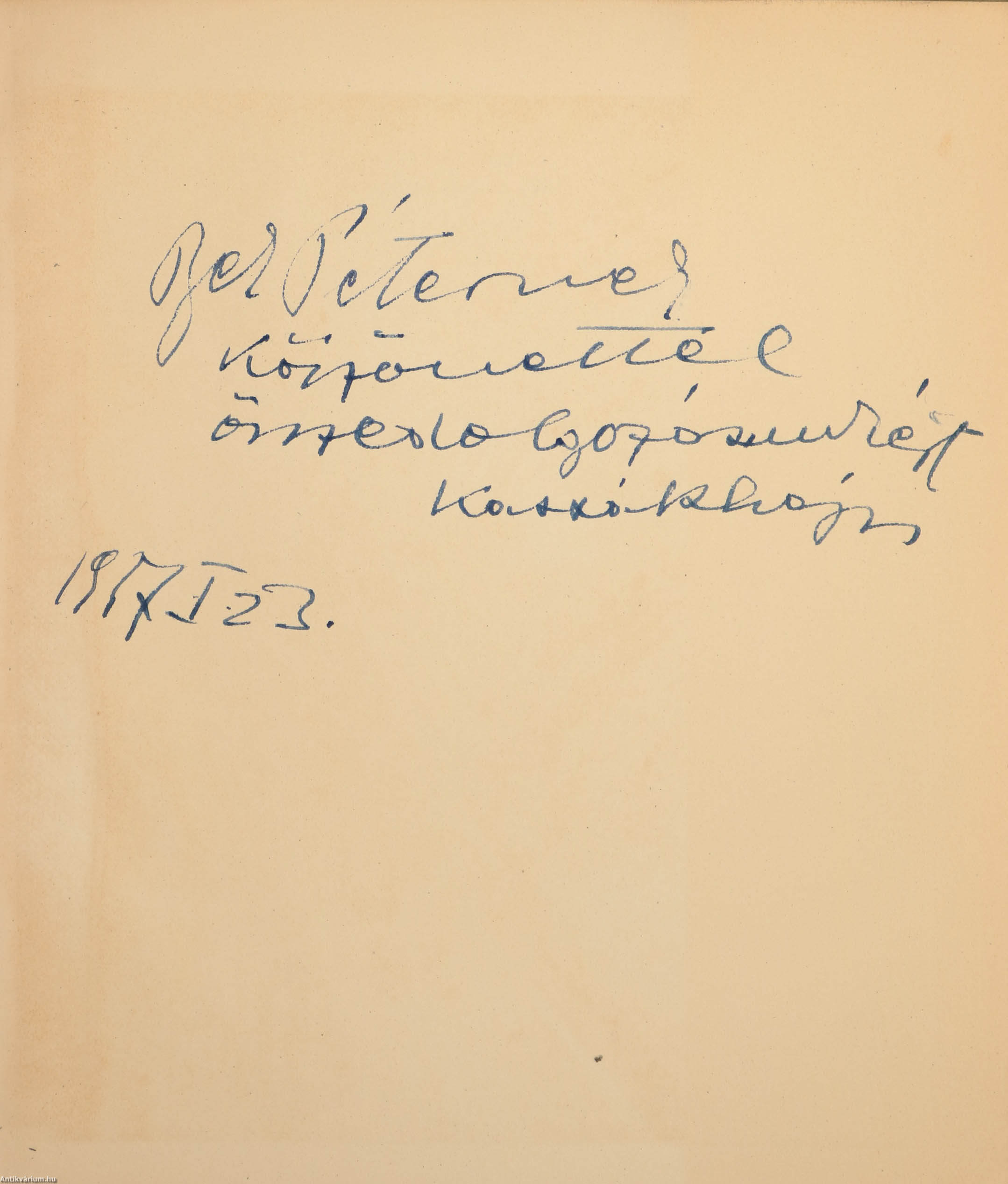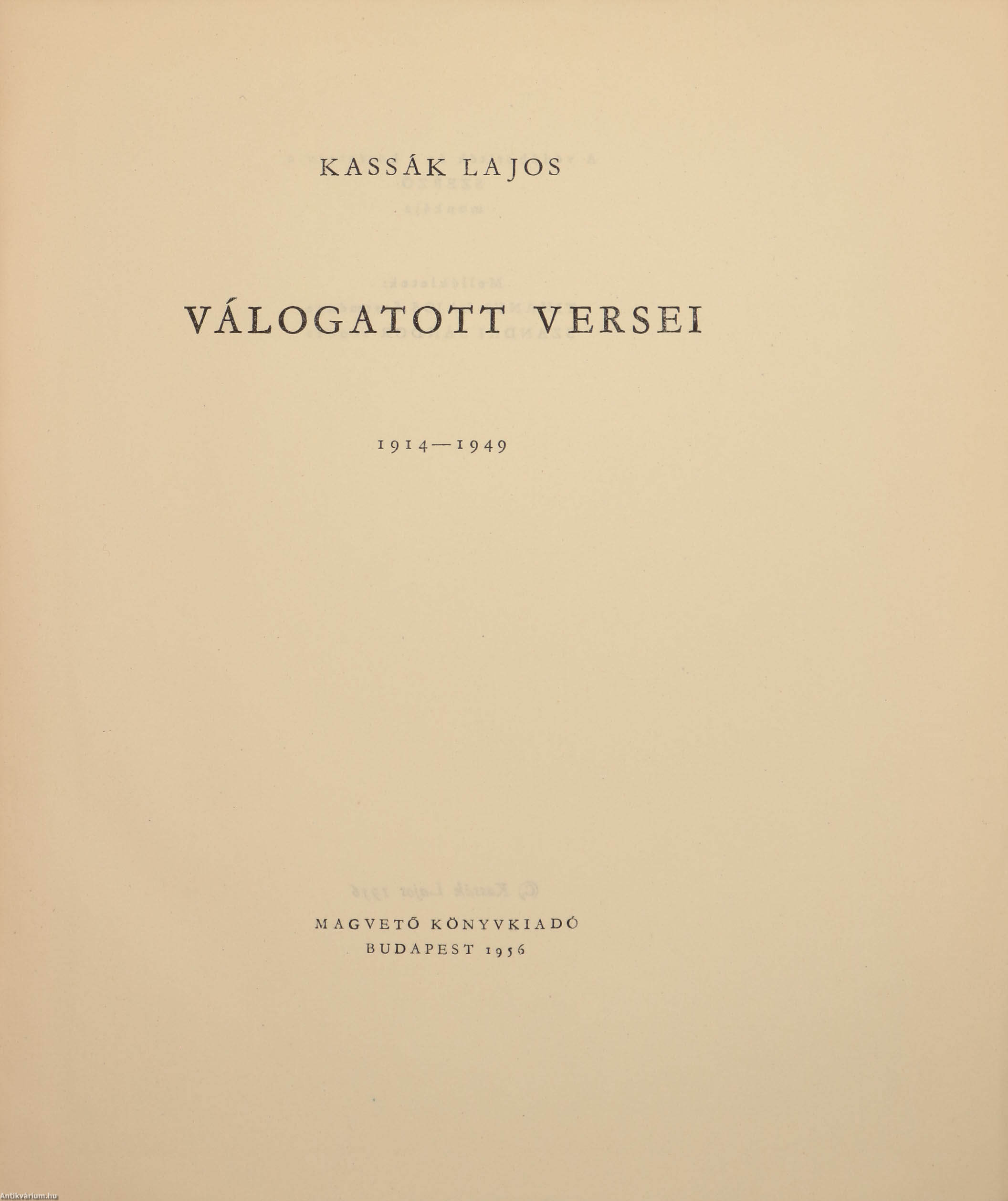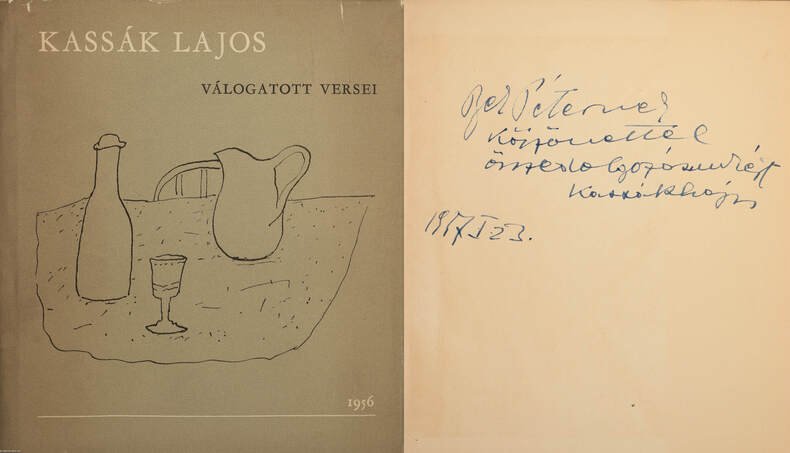 Szerző által dedikált példány. Kassák Lajos válogatott versei. 1914-1949. Az előzéklapon a szerző, Kassák Lajos tollal beírt, névre szóló dedikációja olvasható: "Beck Péternek köszönettel összedolgozásunkért Kassák Lajos. 1957. I. 23.".
