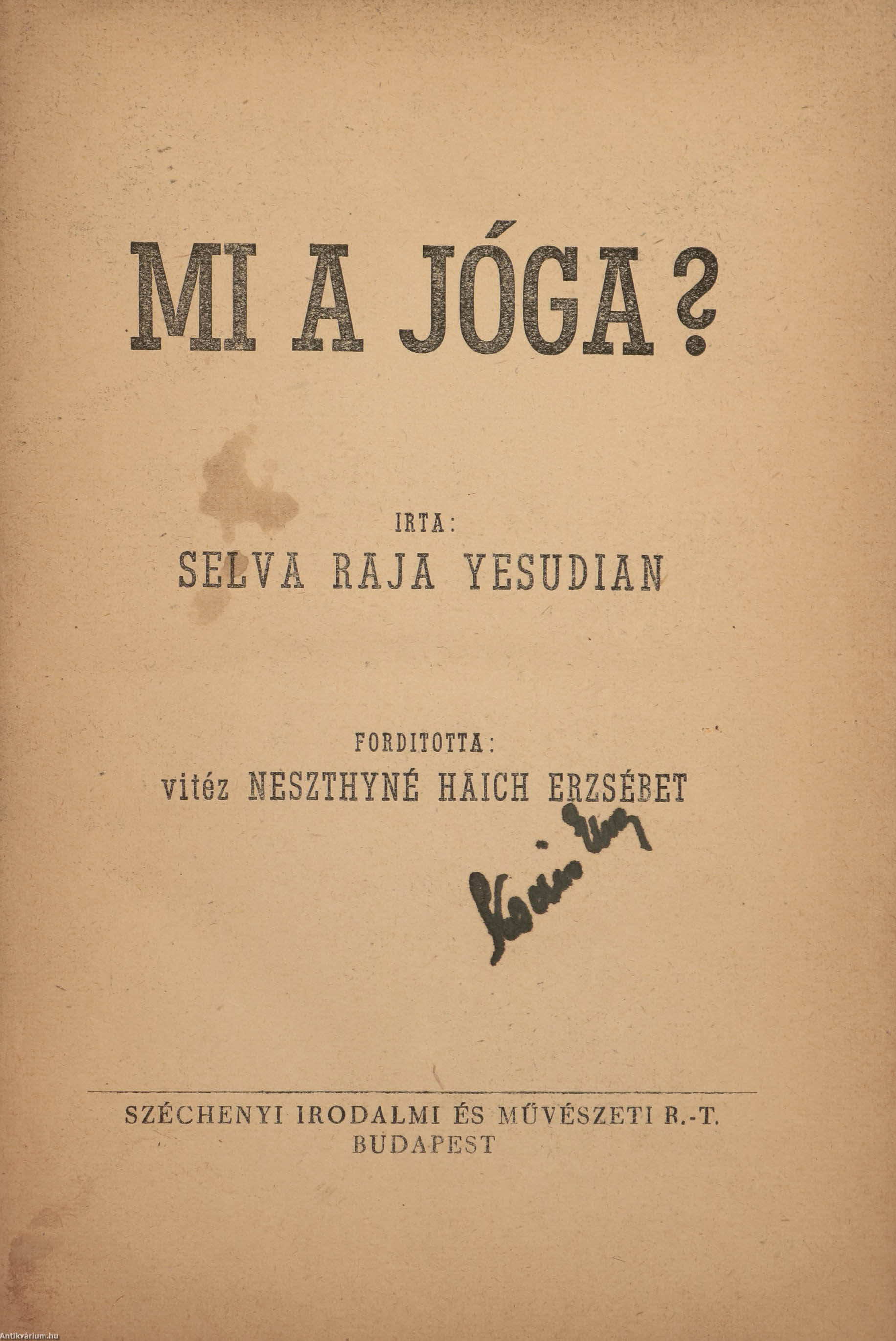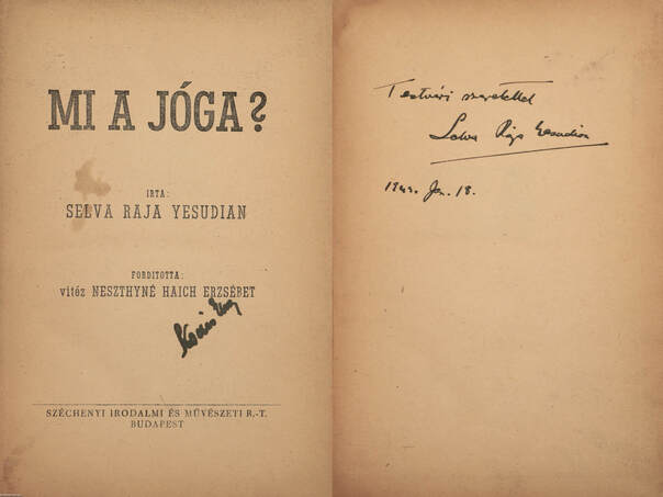 Szerző által dedikált példány. Első magyar nyelvű kiadás. Mi a jóga? Írta: Selva Raja Yesudian. Fordította: vitéz Neszthyné Haich Erzsébet. Az előlap előtti lapon a szerző, Selva Raja Yesudian tollal beírt dedikációja olvasható: "Testvéri szeretettel Selva Raja Yesudian 1944. jan. 18." A szerző fekete-fehér portréjával, 10 fekete-fehér, feliratos képtáblával és néhány szövegközti, fekete-fehér ábrával illusztrált, valamint előszóval és korabeli könyvhirdetésekkel kiegészített kiadás. A címlapon tulajdonosi bejegyzés, az utolsó oldalon ceruzával készített egyedi illusztráció látható. Nyomtatta a Betnár Béla "Grafikai"-nyomda, Nagyváradon. Könyvkötői félvászon kötésben lévő példány, feliratozatlan címfedéllel, hátlappal és könyvgerinccel, új előzéklapokkal, néhány foltos lappal, hiánytalan állapotban. A kötet szerzője, Selvarajan Yesudian (Sholinghur-Madrász, 1916. február 25. – Zürich, 1998. október 26.) indiai származású jógatanító és író. 1937-ben érkezett Magyarországra, hogy egyetemi tanulmányokat végezzen. Az itteni tartózkodása alatt tökéletesen elsajátította a magyar nyelvet, valamint itt jelent meg a nagy sikerű "Sport és jóga" c. könyve. 1941-ben Haich Erzsébet (1897-1994) budapesti műtermében megalapították Európa első jógaiskoláját. Yesudian által Indiából elhozott jóga a keresztény hiten és az indiai egészségmegőrző hagyományon alapult. 1948-ban Haich Erzsébettel együtt elhagyta Magyarországot. Svájcban telepedtek le, ahol több városban is jógaiskolát alapítottak és minden évben nemzetközi tábort is tartottak. Selva Raja Yesudian élete végéig (1998-ig) tanított a zürichi jógaiskolájában.