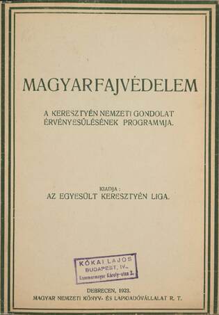 Egyetlen kiadás. Magyar Fajvédelem. A keresztyén nemzeti gondolat érvényesülésének programmja. Az Egyesült Keresztyén Nemzeti Liga antiszemita politikai kiadványa. A kötetbe kötött, eredeti borítófedélen és a címlapon kereskedelmi bélyegzés látható. Könyvkötői félvászon kötésben lévő példány feliratozatlan, színes, foltos címfedéllel és hátlappal, aranyozott feliratozású könyvgerinccel, színezett lapélekkel, tiszta belívekkel, hiánytalan állapotban. A könyvbe bekötötték az eredeti, feliratos borítófedelet is. Az Egyesült Keresztyén Nemzeti Liga egy 1919-ben alakult (hivatalosan 1920-ban bejegyzett), jobboldali, fajvédő, antiszemita egyesület, amelynek legfőbb célja a Horthy kormányzósága alatt kiépülő keresztény-nemzeti eszmerendszer és ideológia védelme és támogatása volt. A szervezet elnökségében olyan prominens személyiségek is szerepet vállaltak, mint Teleki Pál és Bárdossy László miniszterelnökök. Az egyesületet hivatalosan 1946-ban szüntették meg.