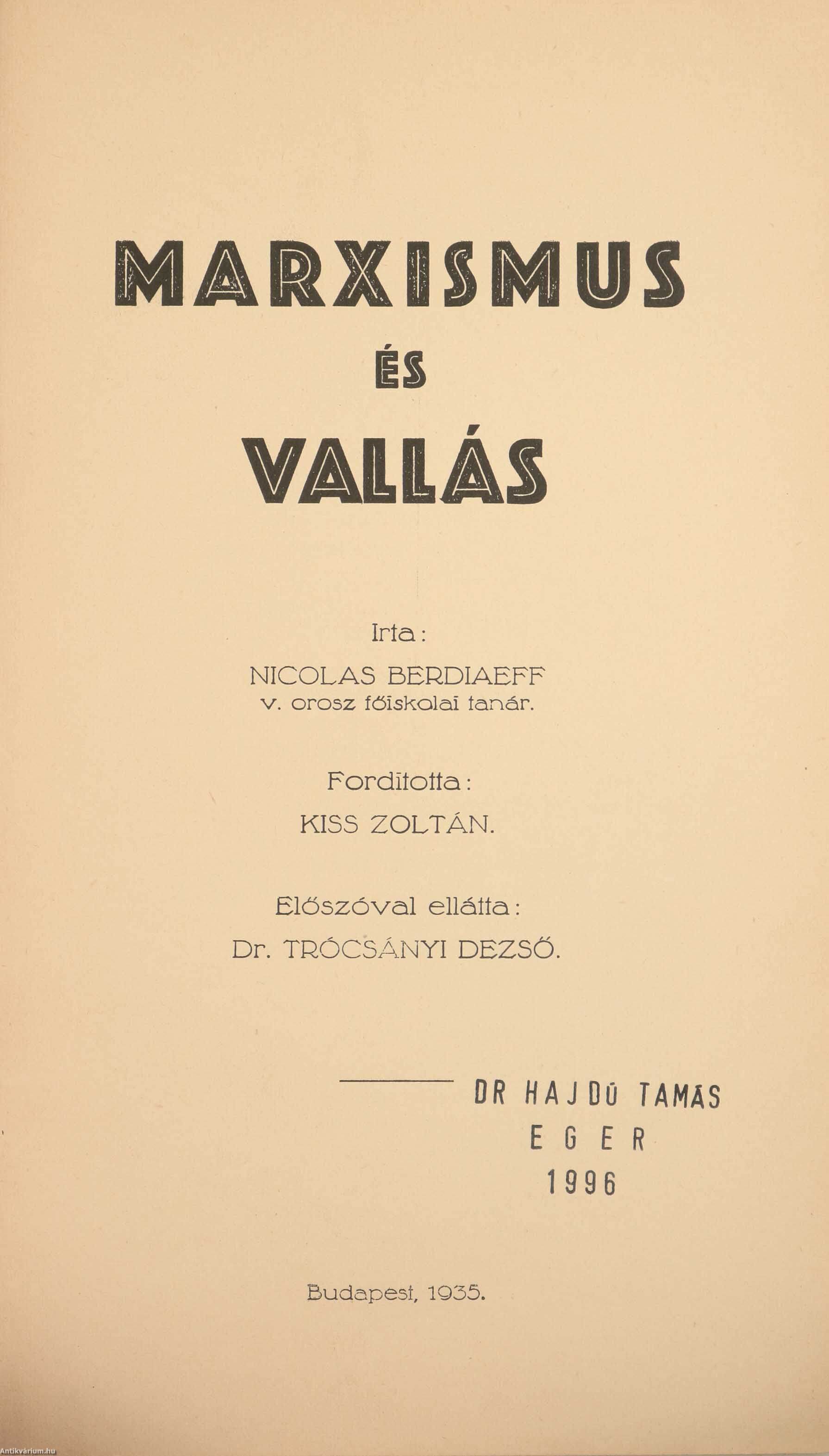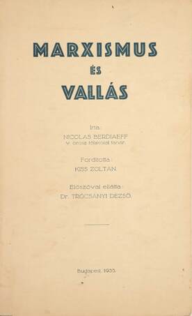 Első kiadás. Marxismus és vallás. Írta: Nicolas Berdiaeff [Nyikolaj Alekszandrovics Bergyajev]. Fordította: Kiss Zoltán. Előszóval ellátta: Dr. Trócsányi Dezső.