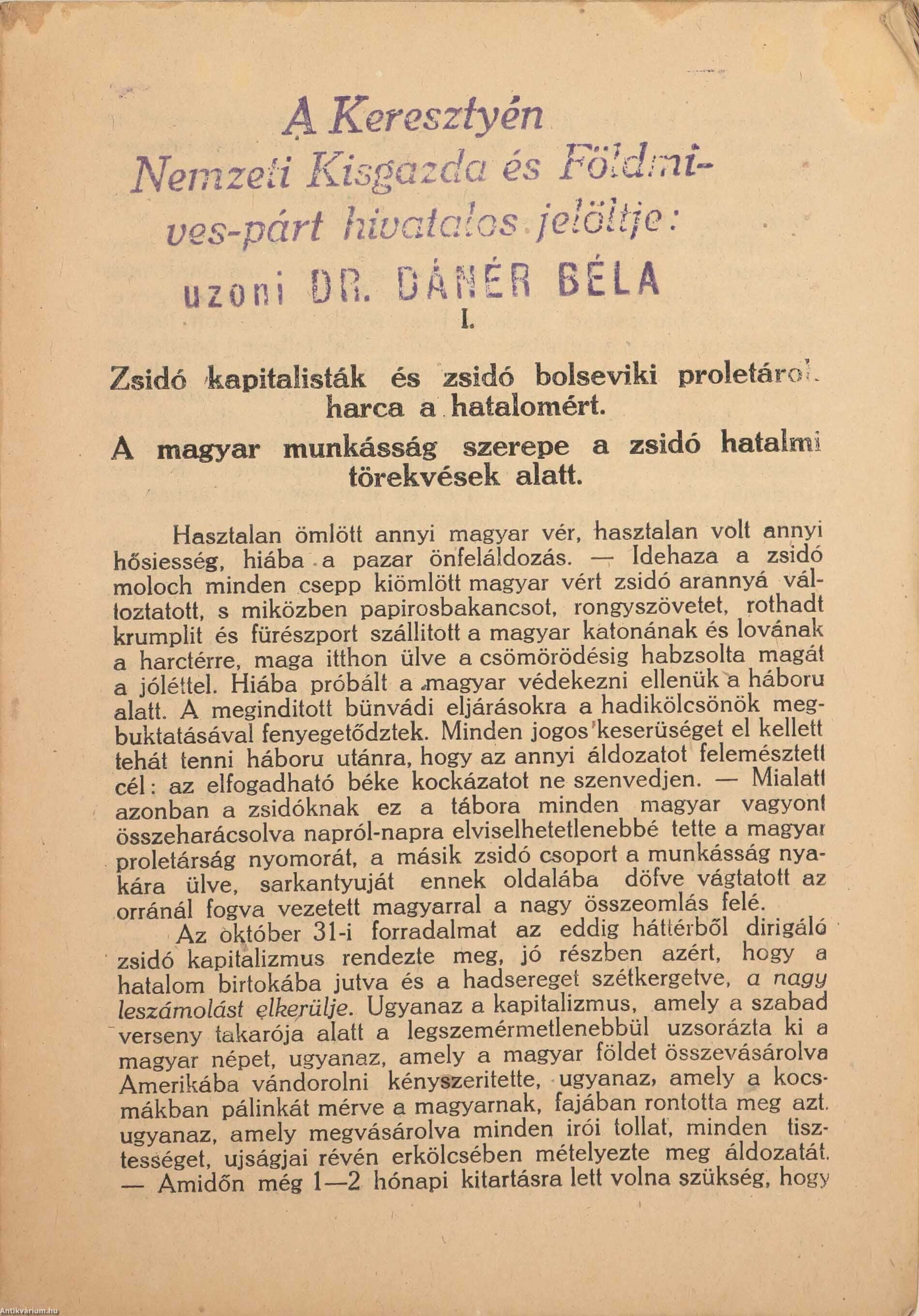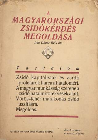 Egyetlen kiadás. A magyarországi zsidókérdés megoldása. Írta: Dr. Dánér Béla.