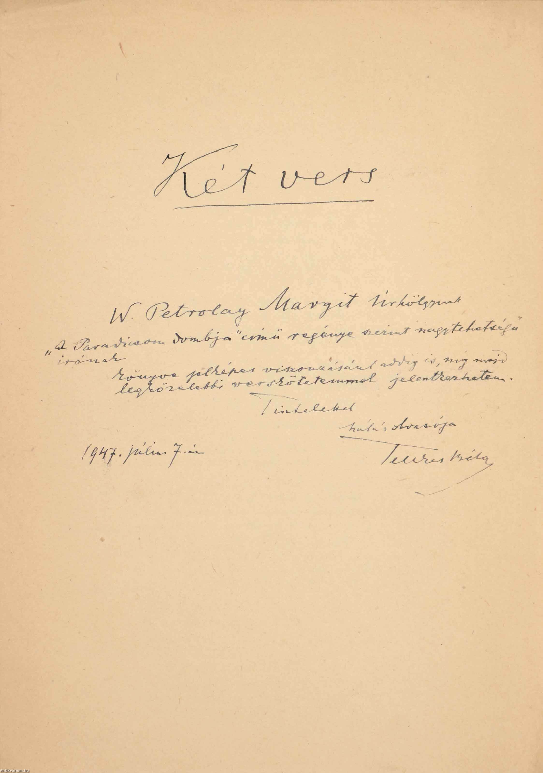 A levélt szövege: "W. Petrolay Margit Úrhölgynek „a Paradicsom dombja” című regénye szerint nagytehetségű írónak könyve jelképes viszonzásául addig is, míg majd legközelebbi verseskötetemmel jelentkezhetem. Tisztelettel hálás olvasója Telekes Béla. 1947. július 7-én".