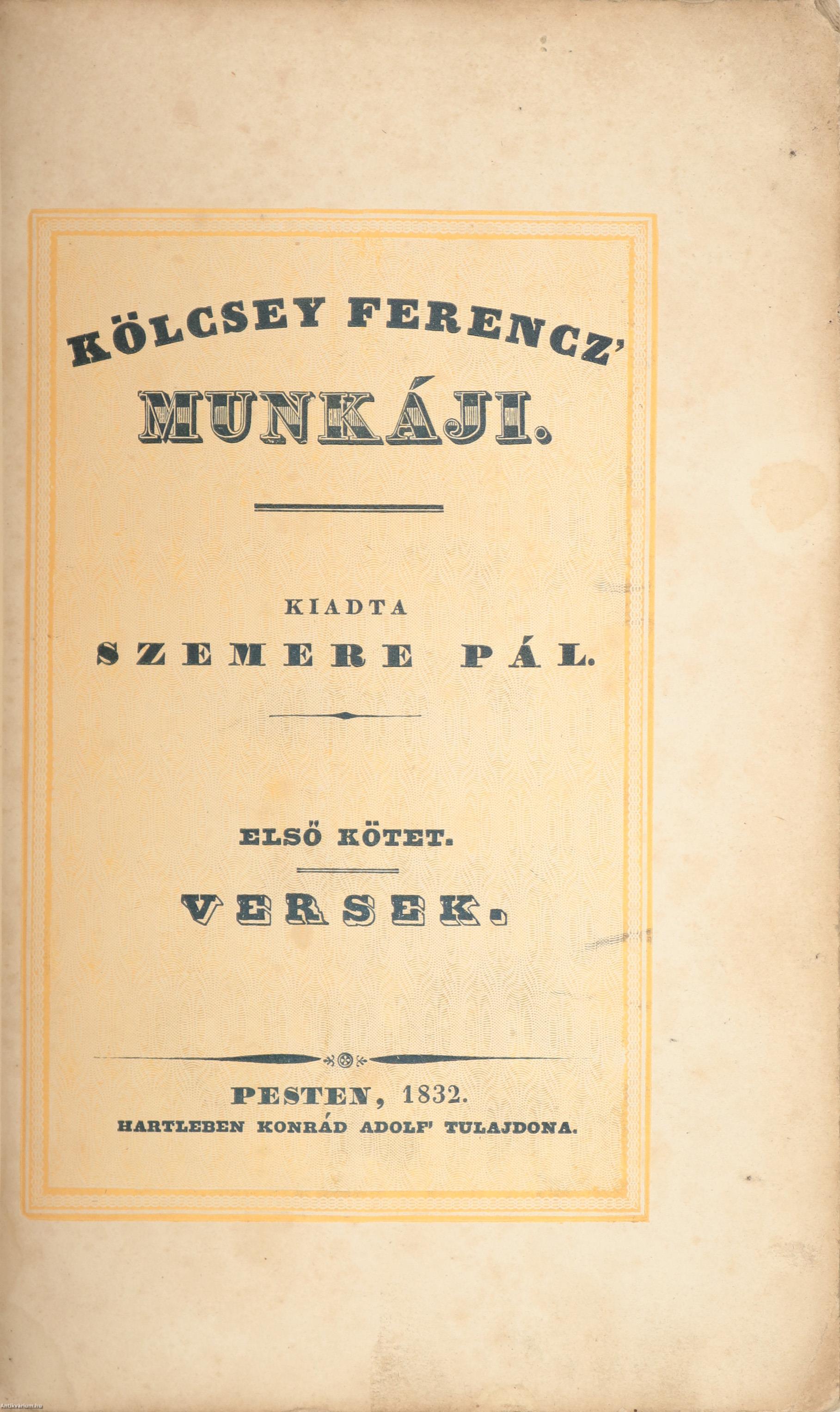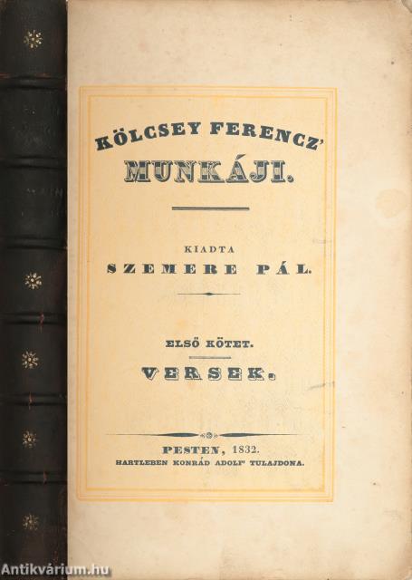 Kiadói unicus kiadás. Kölcsey Ferencz' Munkáji. Első kötet. Versek. Kiadta: Szemere Pál. Két színnel nyomott díszcímlappal és kötetvégi tartalomjegyzékkel. Az előlapon és a címlap előtti lapon tollal beírt, régi tulajdonosi bejegyzések láthatók. Kölcsey munkáinak jelen, Hartleben-féle kiadásából több kötet nem jelent meg. A 176-193. oldalig terjedően a lapok bekötési rendje eltér az eredeti bekötési rendtől.