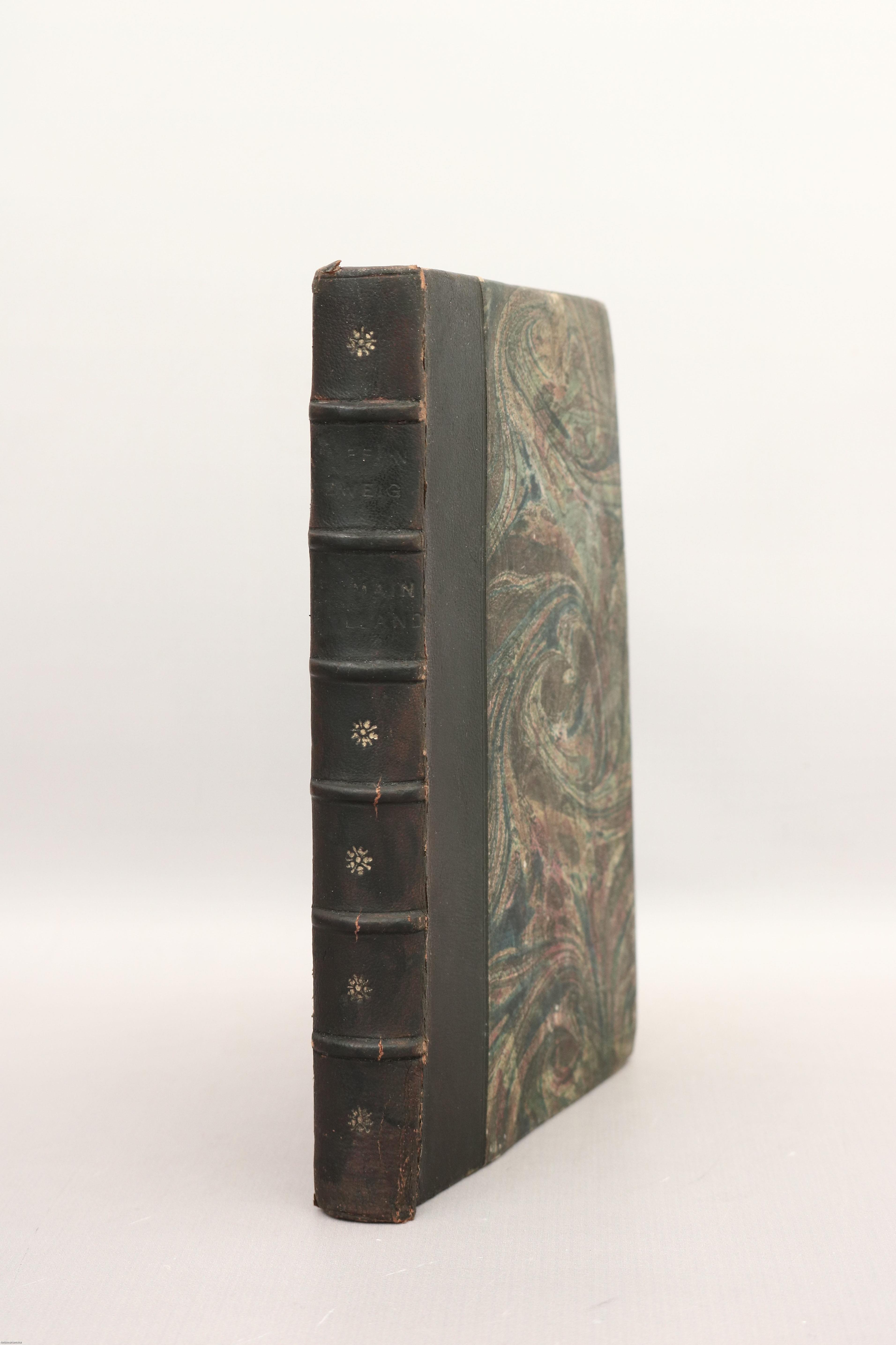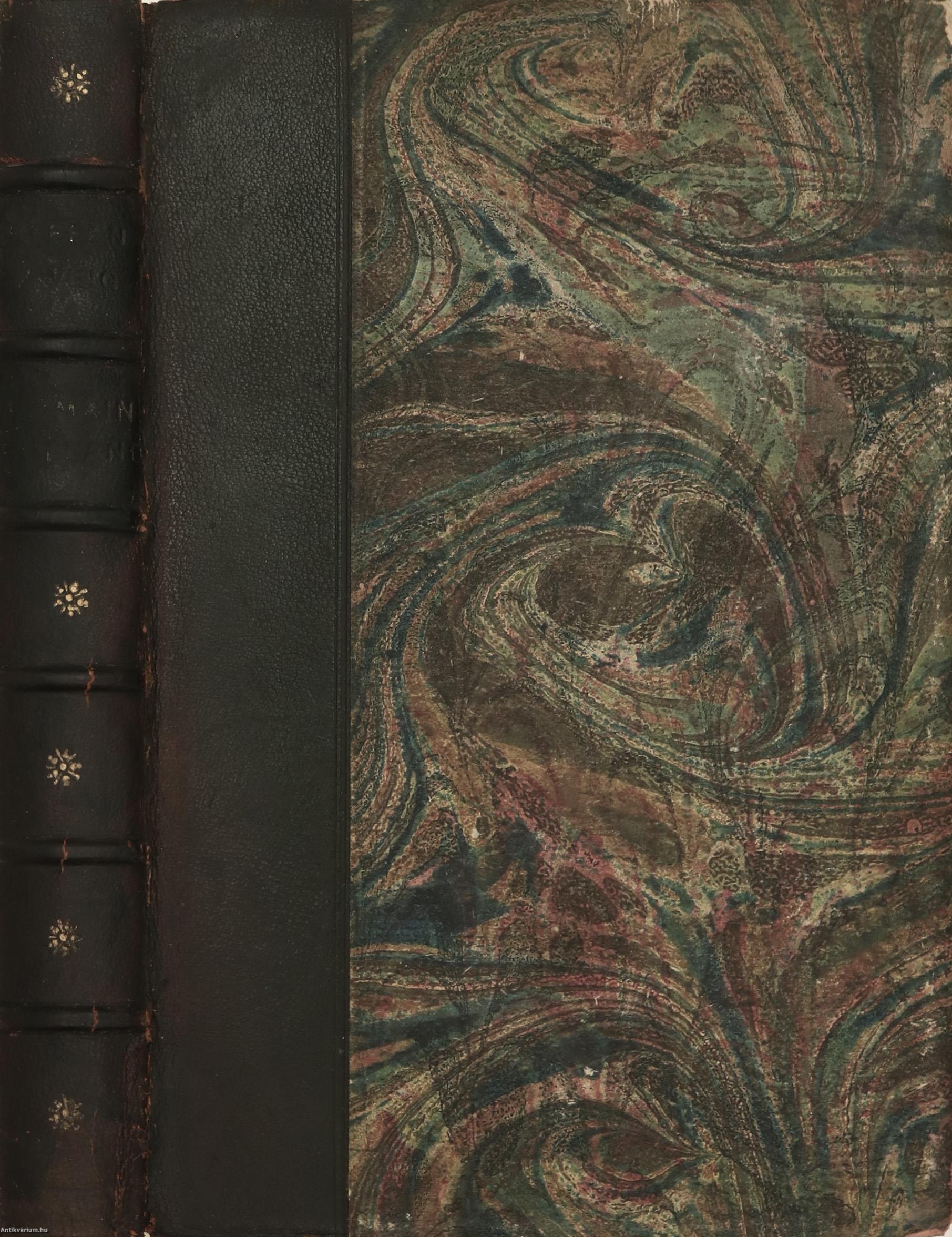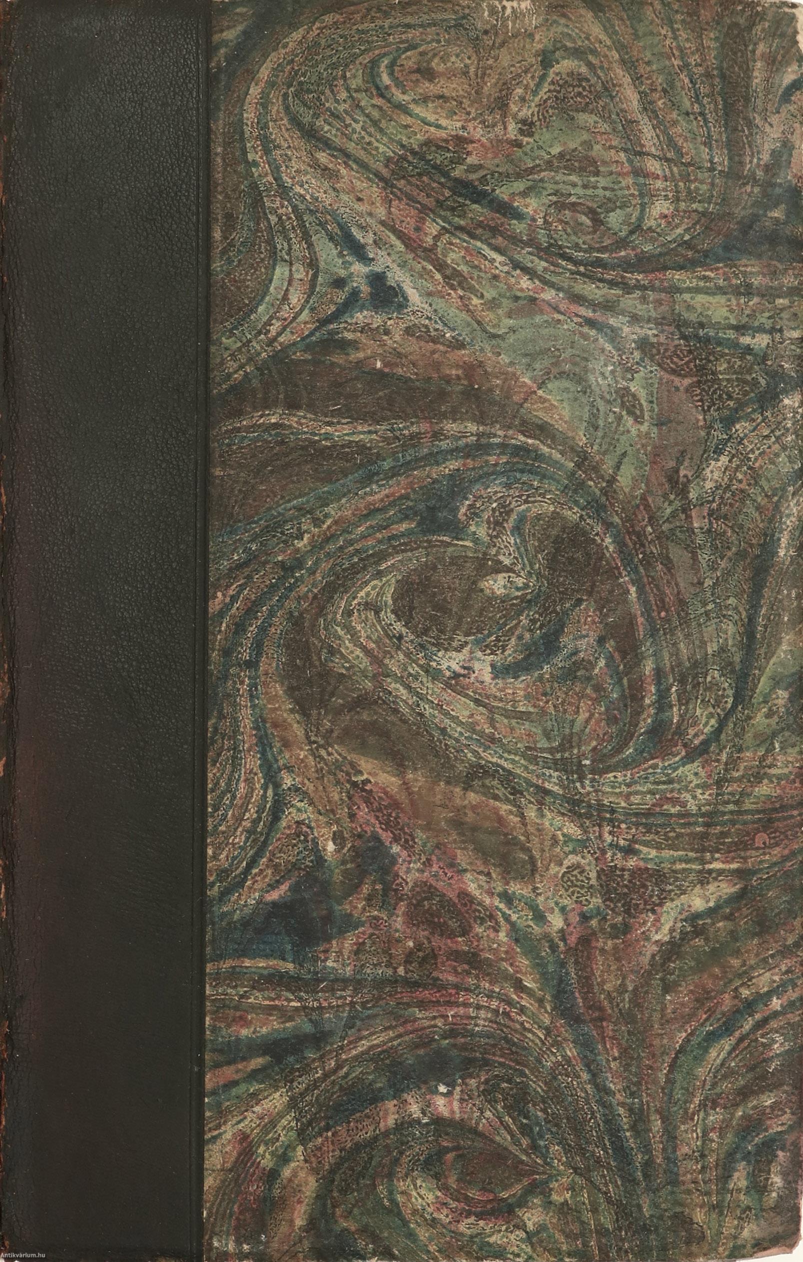 Könyvkötői félbőr kötésben lévő példány feliratozatlan, színes, mintás címfedéllel és hátlappal, feliratos, aranyozással díszített, sérült könyvgerinccel, színes, mintás előzéklapokkal, sérült, hiányos előlappal, több helyen nedvességtől foltos belívekkel, hiánytalan állapotban, utólagosan készült, sérült papír védődobozban.