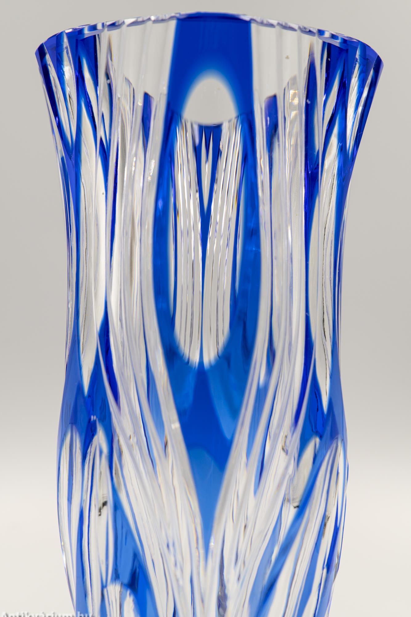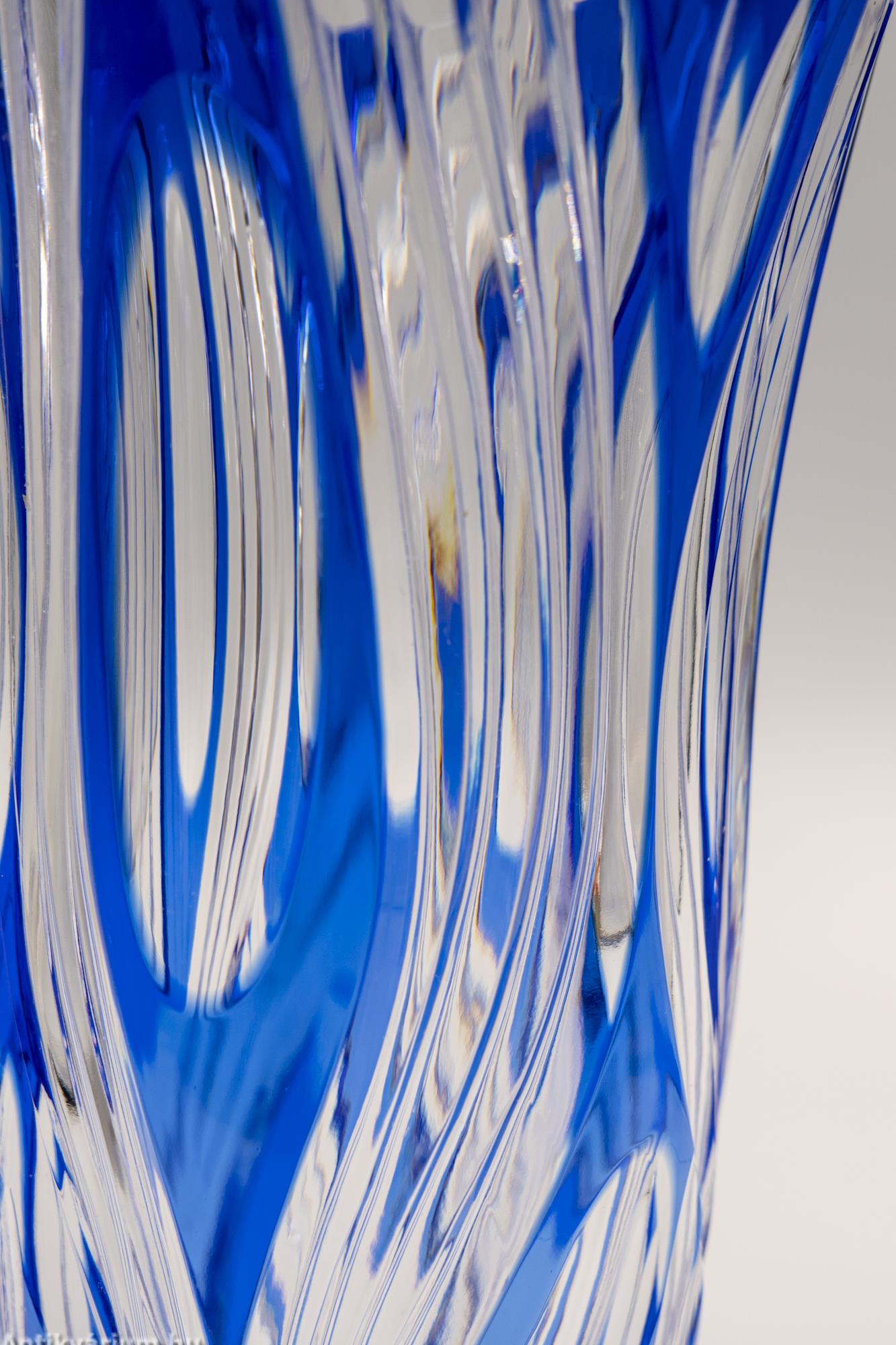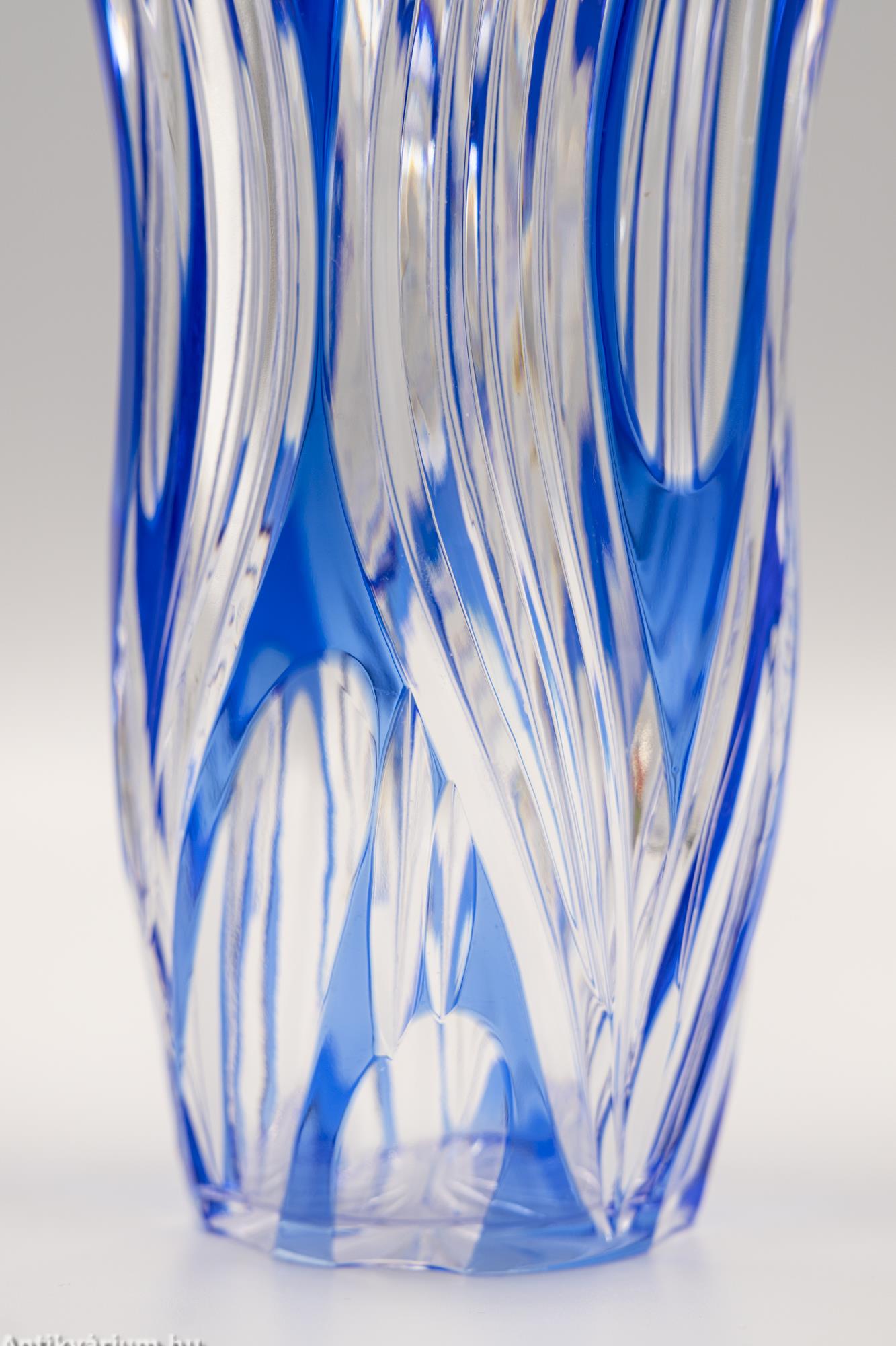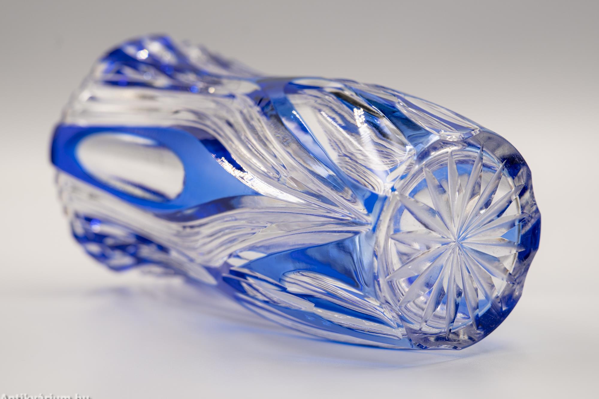 Hibátlan állapotú, fújt és kézzel formázott, valamint csiszolt cseh kék színű üveg váza a 20. század második feléből. Különleges, hosszanti geometrikus csiszolással díszített. Talpa lapra csiszolt, benne csillag alakú mély bemetszésekkel. Részletgazdag, igényes csiszolású a cseh (Bohémia) üveggyártási hagyományoknak megfelelően.