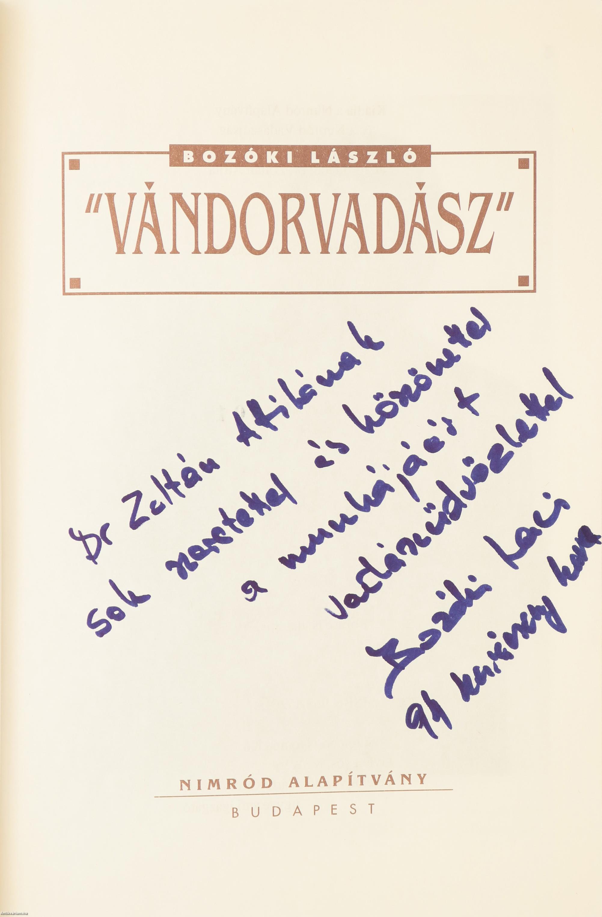 A címlapon a szerző, Bozóki László tollal írt, névre szóló dedikációja olvasható: „Dr. Zoltán Attilának sok szeretettel és köszönettel a munkájáért vadászüdvözlettel Bozóki Laci 94 karácsony hava”