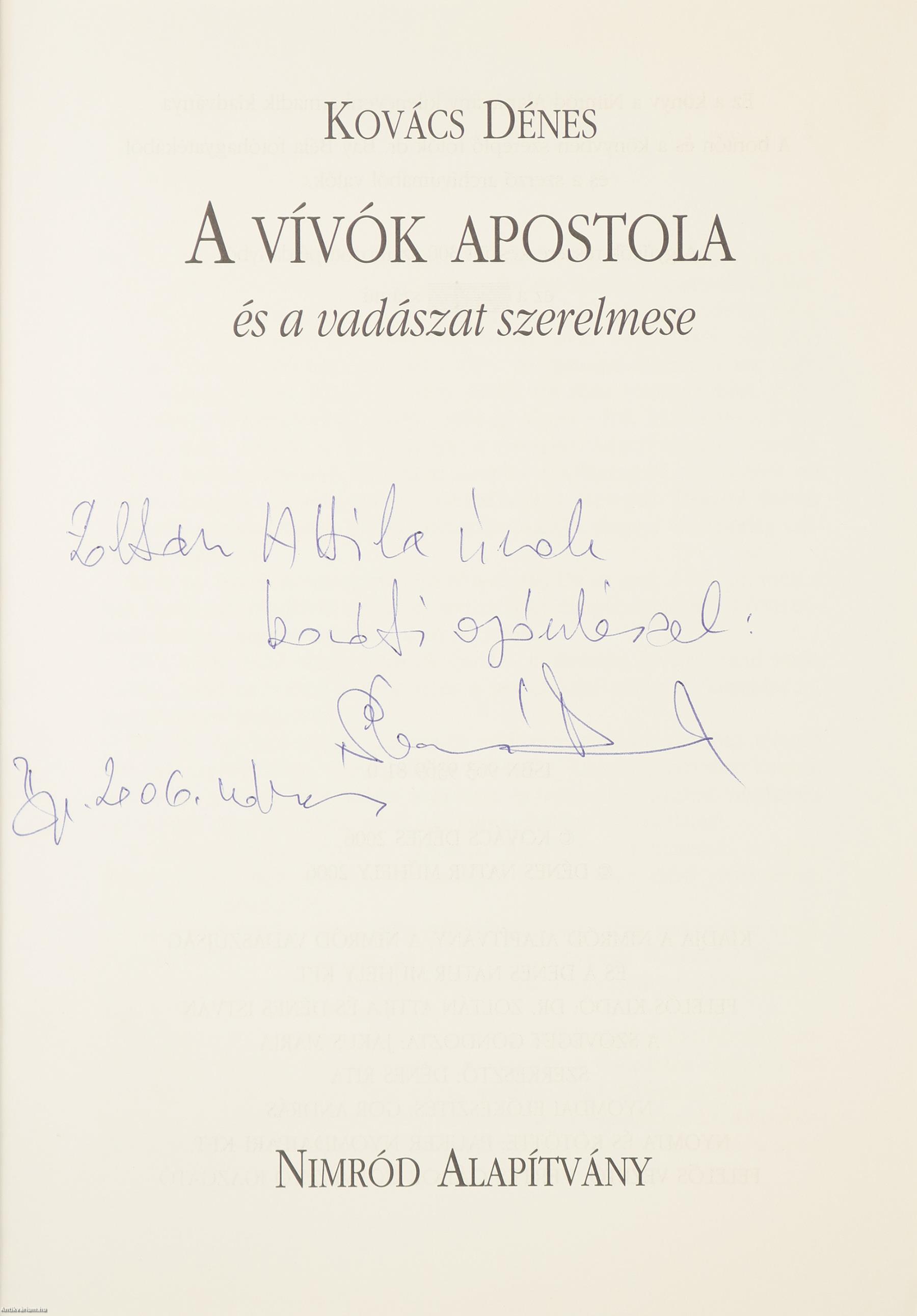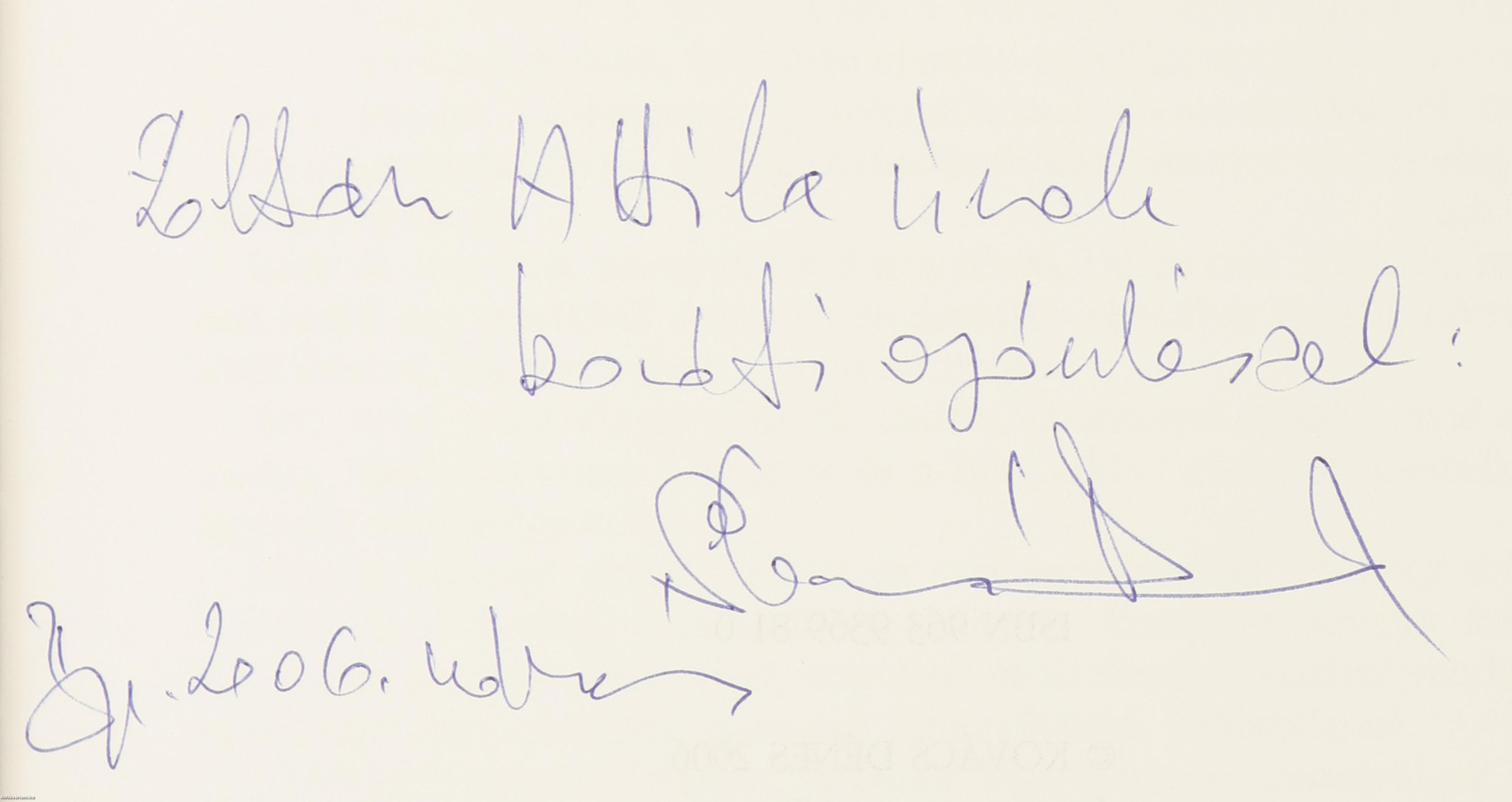 A címlapon a szerző, Kovács Dénes tollal írt, névre szóló dedikációja olvasható: „Zoltán Attila úrnak baráti ajánlással: Kovács Dénes Bp. 2006. március”