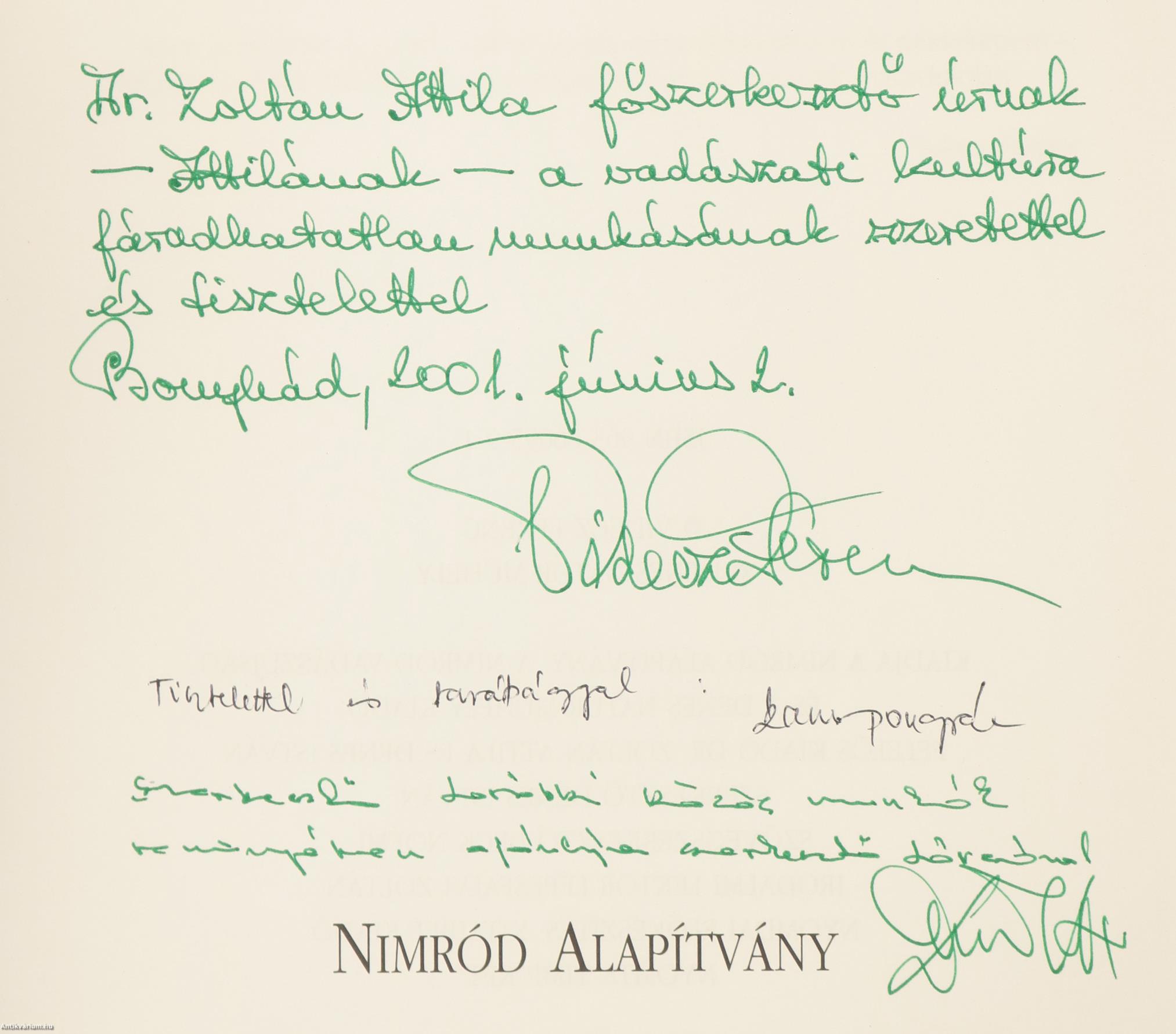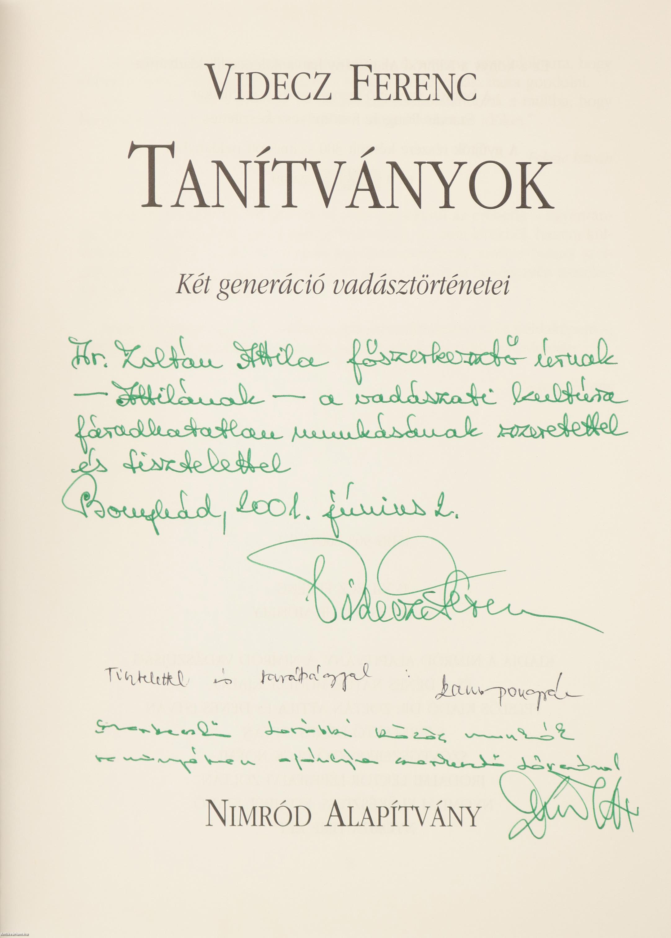 1. „Dr. Zoltán Attila főszerkesztő úrnak – Attilának – a vadászati kultúra fáradhatatlan munkásának szeretettel és tisztelettel Bonyhád, 2001. június 2.”
