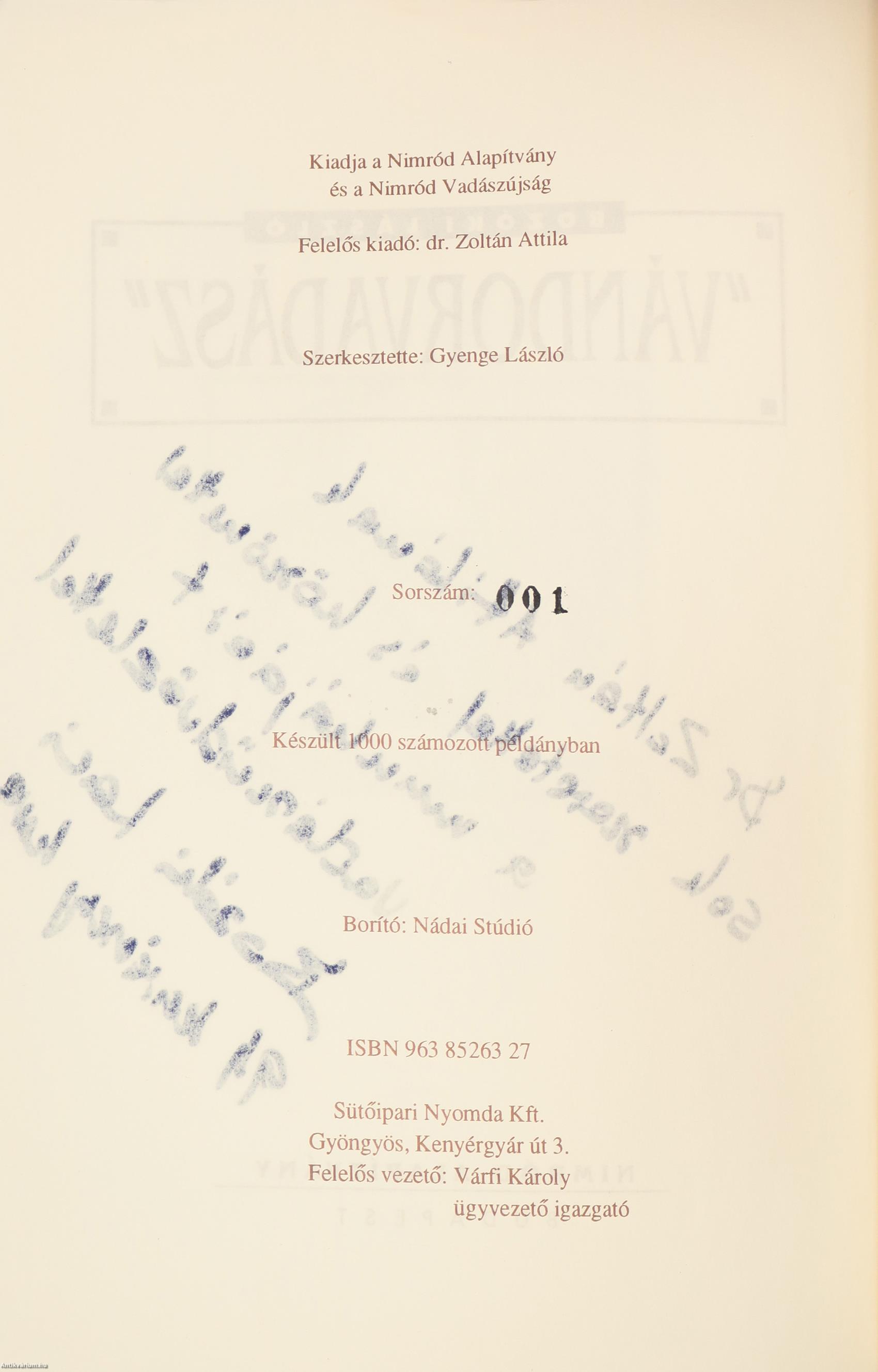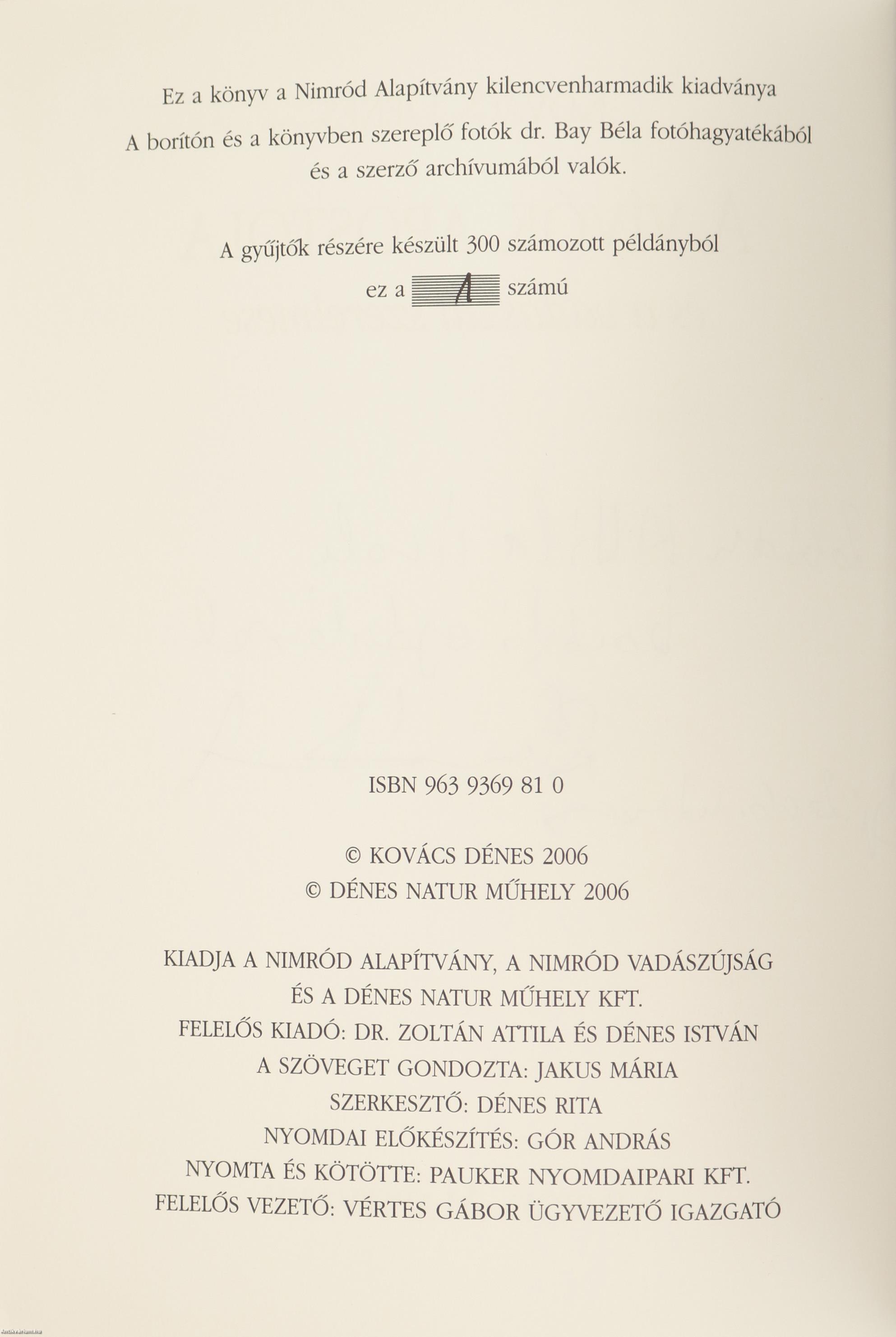 Ez a könyv a Nimród Alapítvány kilencvenharmadik kiadványa. A gyűjtők részére készült 300 számozott példányból ez az 1. számú.