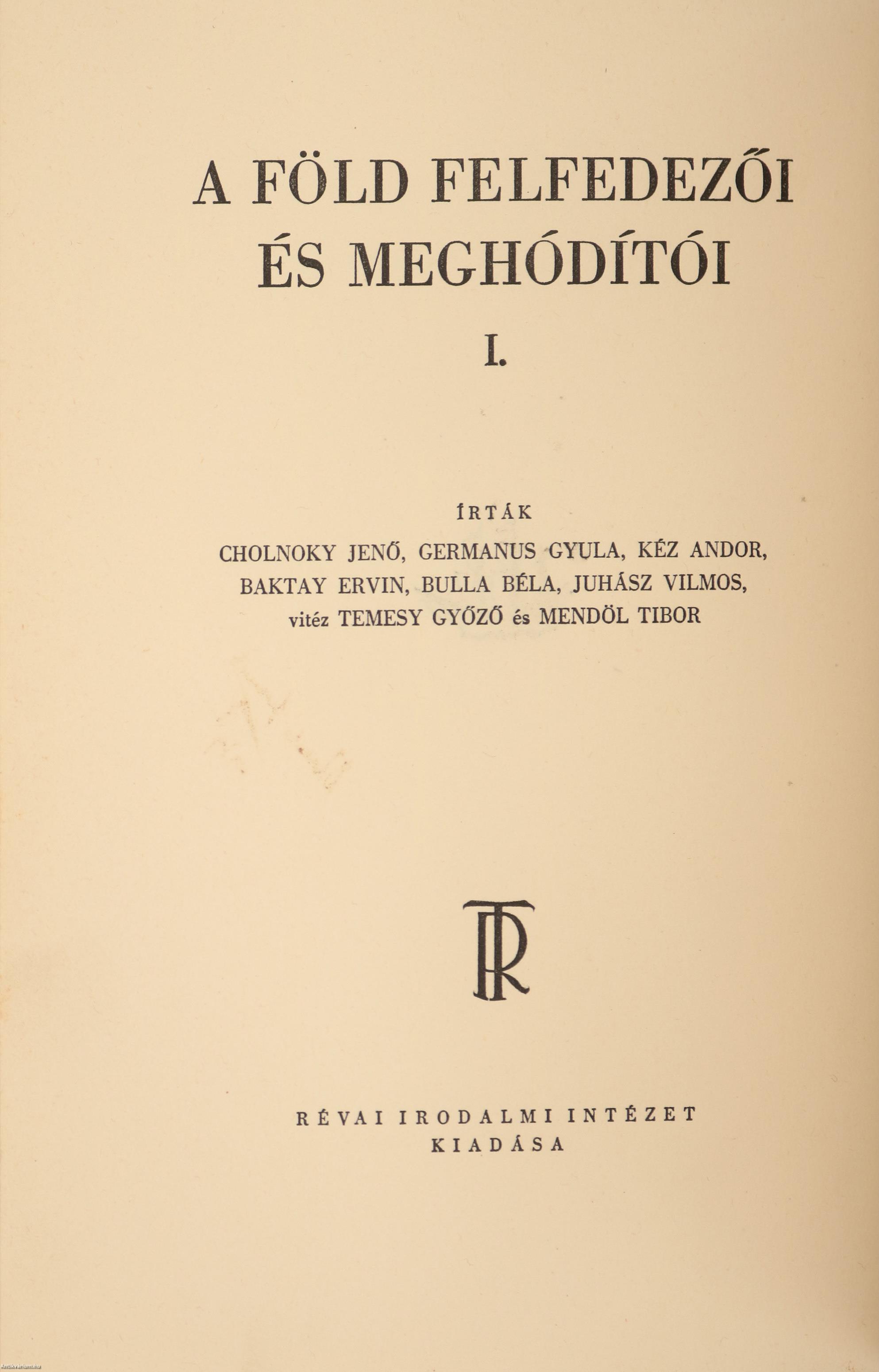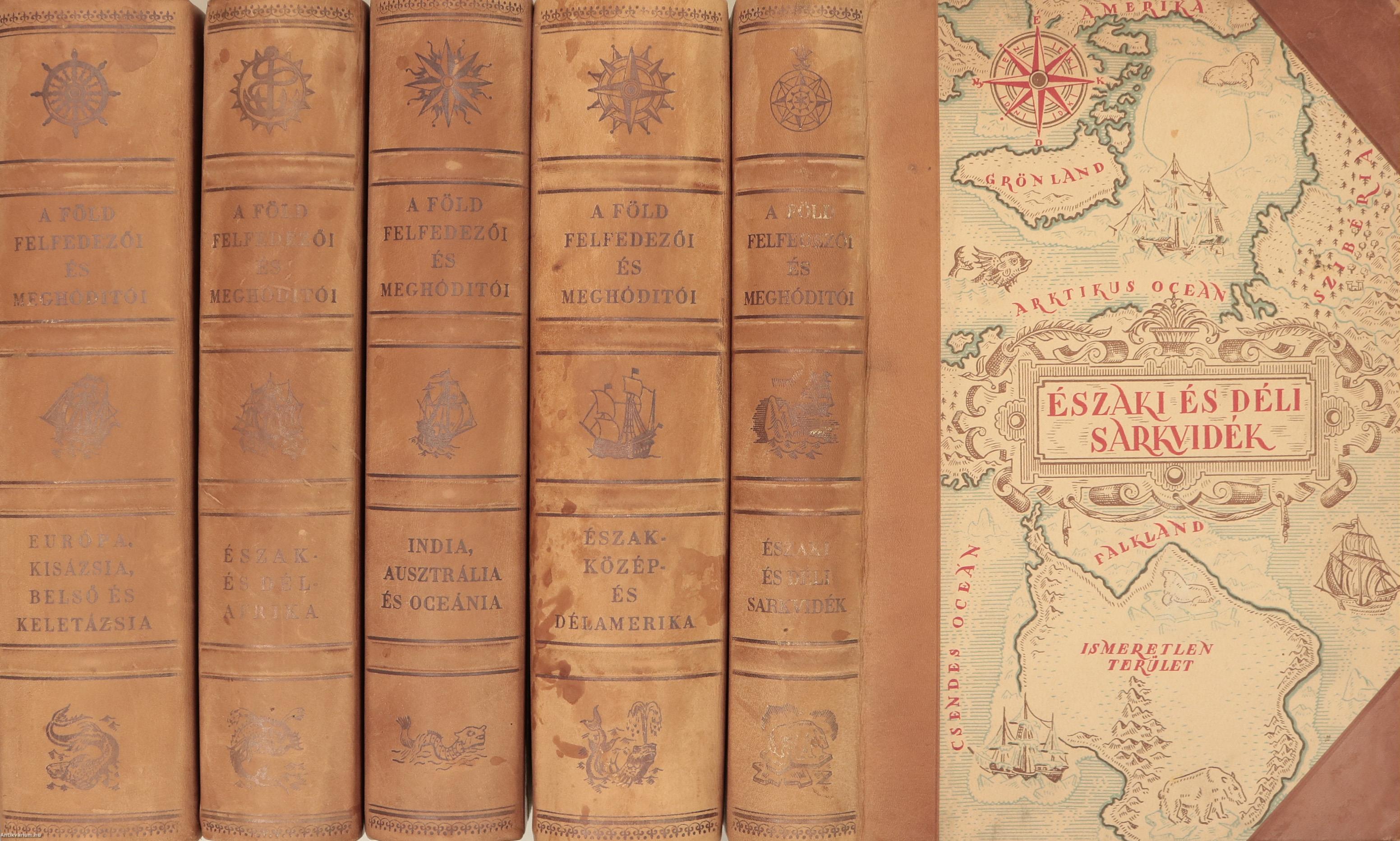 Első kiadás. A Föld felfedezői és meghódítói I-V. (különálló egységes kötetekben). Írták: Cholnoky Jenő, Germanus Gyula, Kéz Andor, Baktay Ervin, Bulla Béla, Juhász Vilmos, vitéz Temesy Győző és Mendöl Tibor.