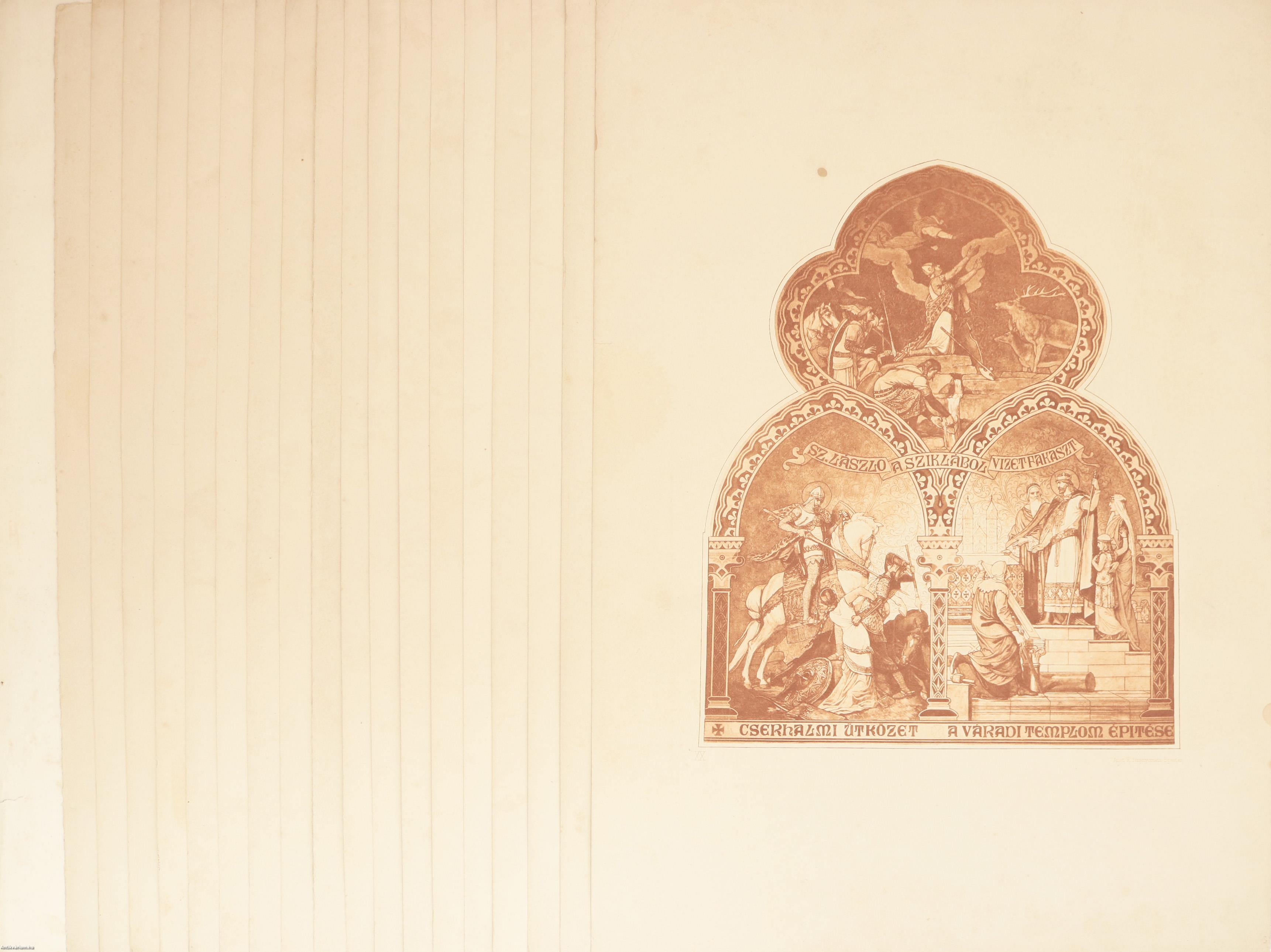 Az első középen: Szt. László király testének kiemelése a nagyváradi sírboltból. Jobbra: eskütétel Szt. László sírja mellett, balra: a szekér angyalok kísérete mellett a szent holttestét Nagy-Váradra viszi. A XX. táblán jobbfelől: Szt. László a cserhalmi ütközetben kiszabadít a kun rabló kezéből egy magyar leányt. Fent Szt. László a pusztaság szomjazó katonái számára vizet fakaszt.