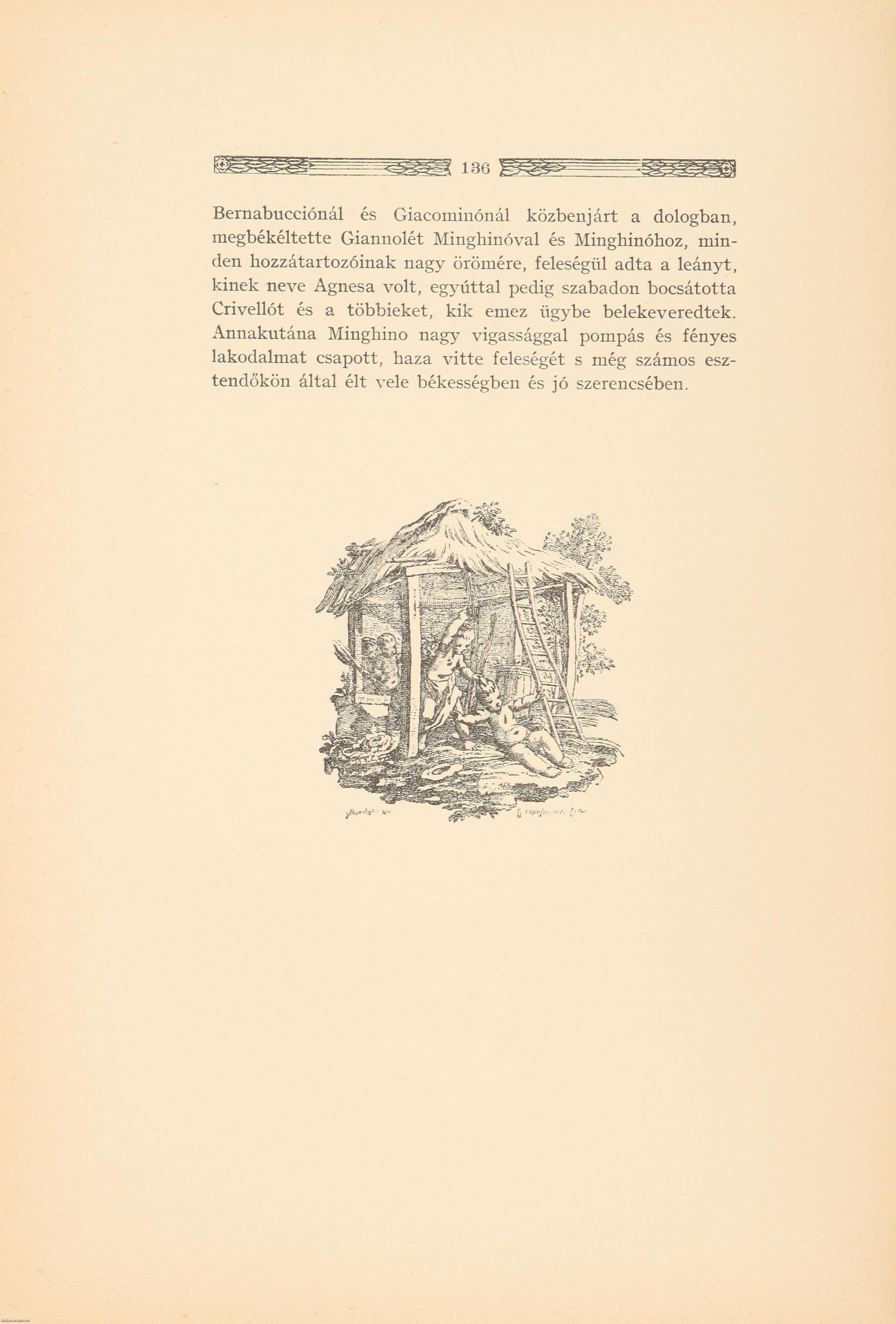 | Varlungo plébános Monna Belcoloreval szerelmeskedik: zálogul ott hagyja nála köpönyegét, kölcsönkér tőle egy mozsarat s mikor visszaküldi, visszakéri a köpönyegét, melyet zálogban ott hagyott, melyet is a jó asszony csípős kiszólás kíséretében visszaad | |